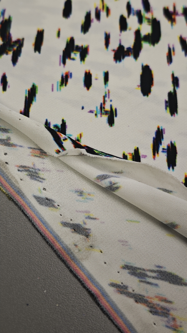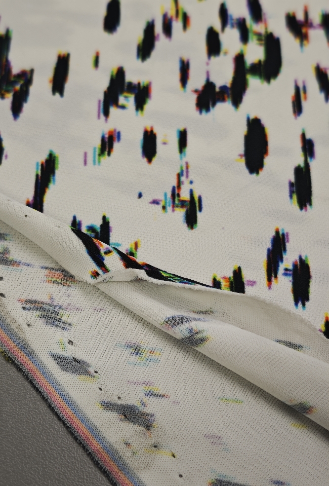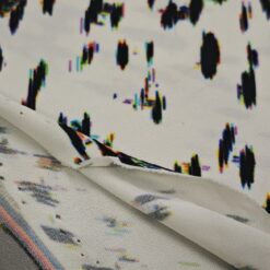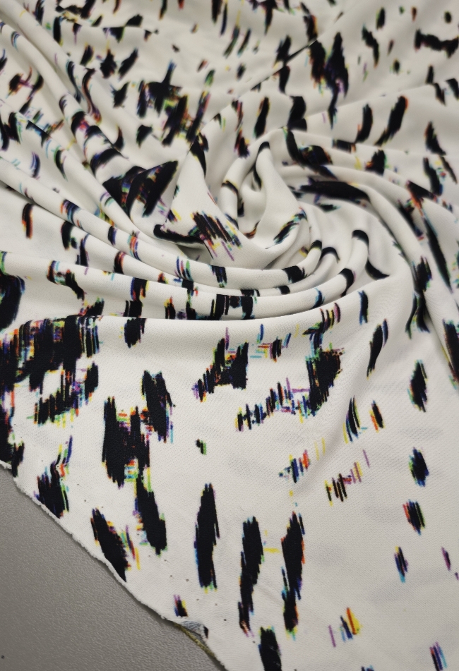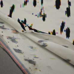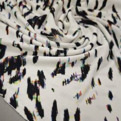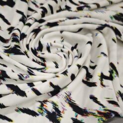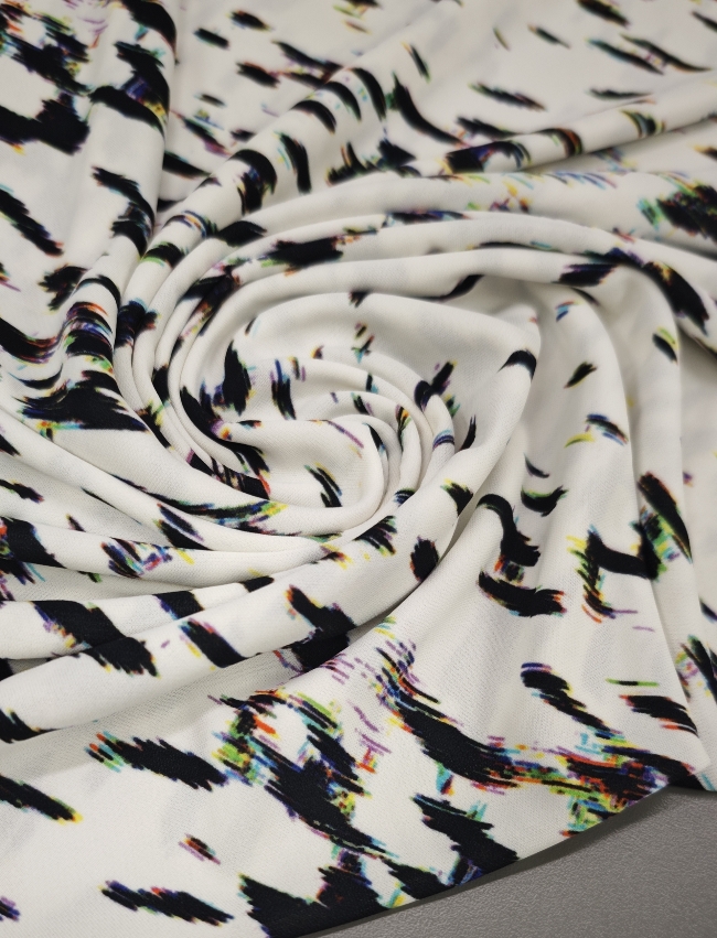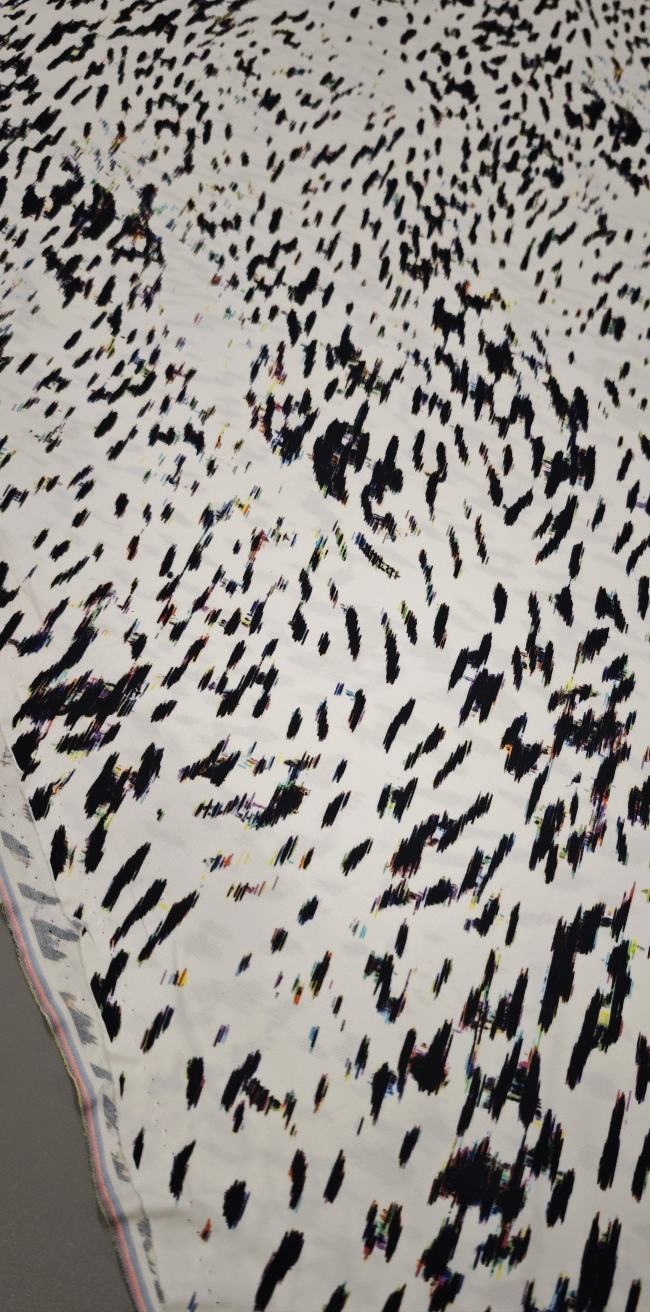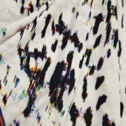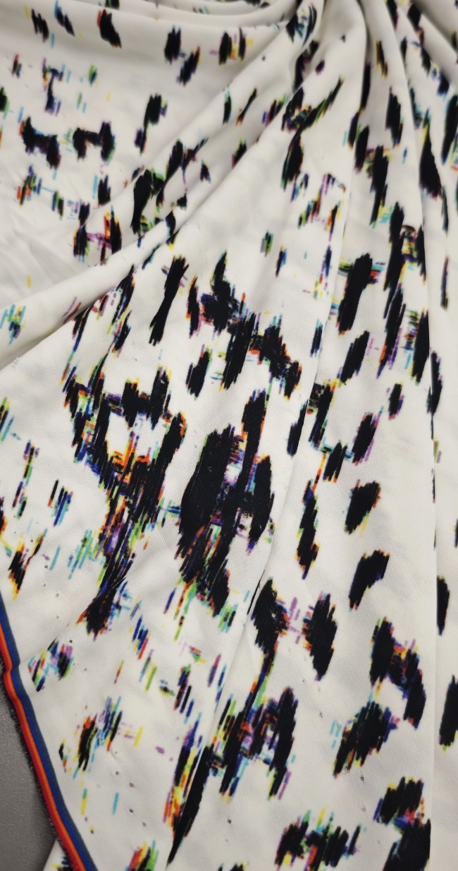 Ta čudovit žoržet pritegne s sodobnim digitalnim vzorcem v kontrastni belo-črni kombinaciji. Rahla elastičnost zagotavlja večje udobje in lepo prileganje, zaradi česar je idealna izbira za modne kreacije, ki zahtevajo lahkotnost in eleganco.
