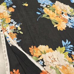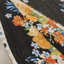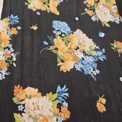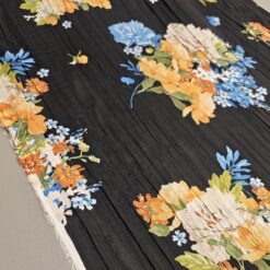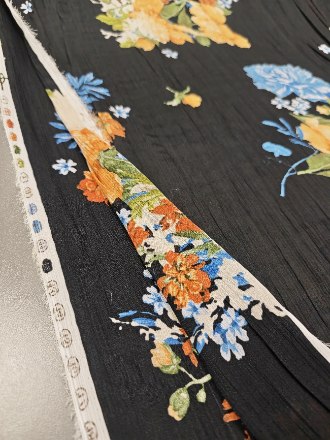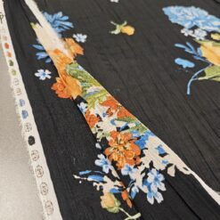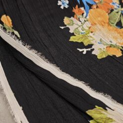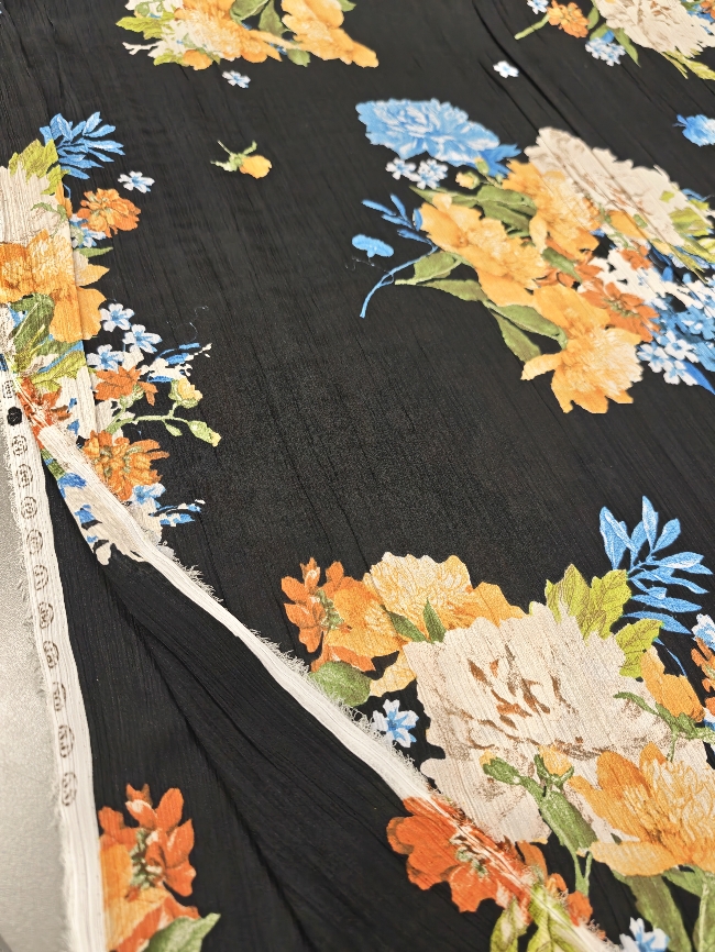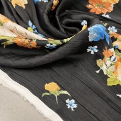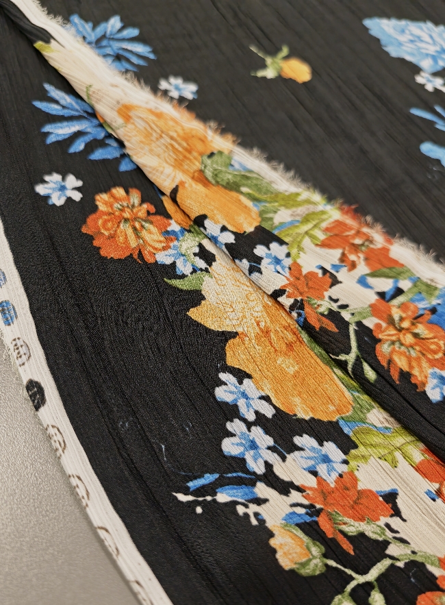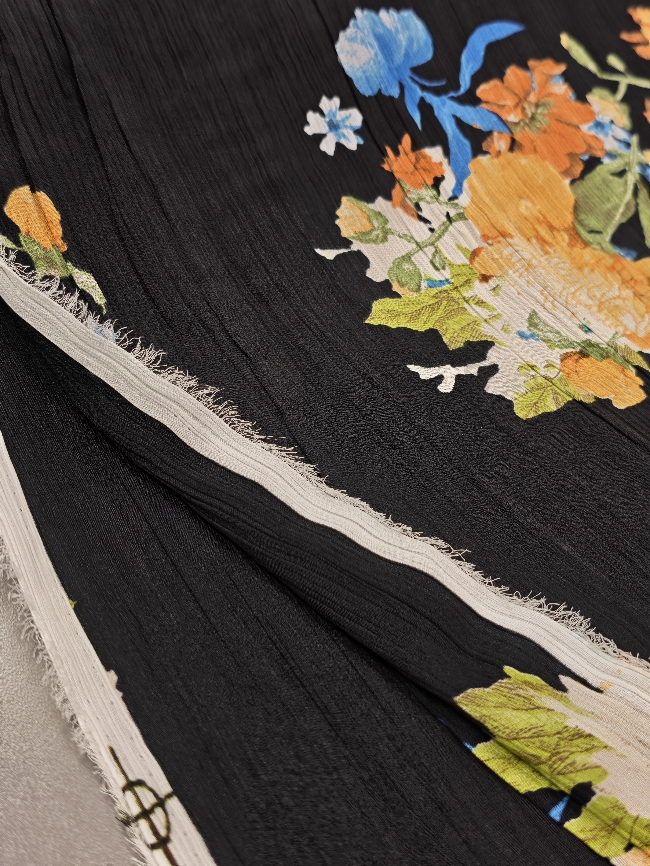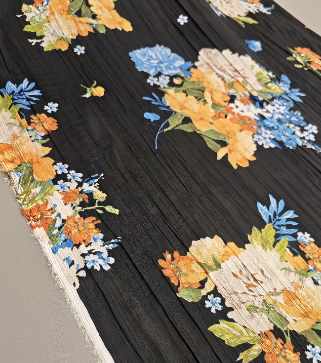 Lahek črn žoržet z izrazito mečkano strukturo ustvari moderen, rahlo sproščen videz, ki ostane lep tudi brez likanja. Površina daje oblačilom dodatno globino, material pa lepo pade in omogoča udobno nošenje skozi ves dan.