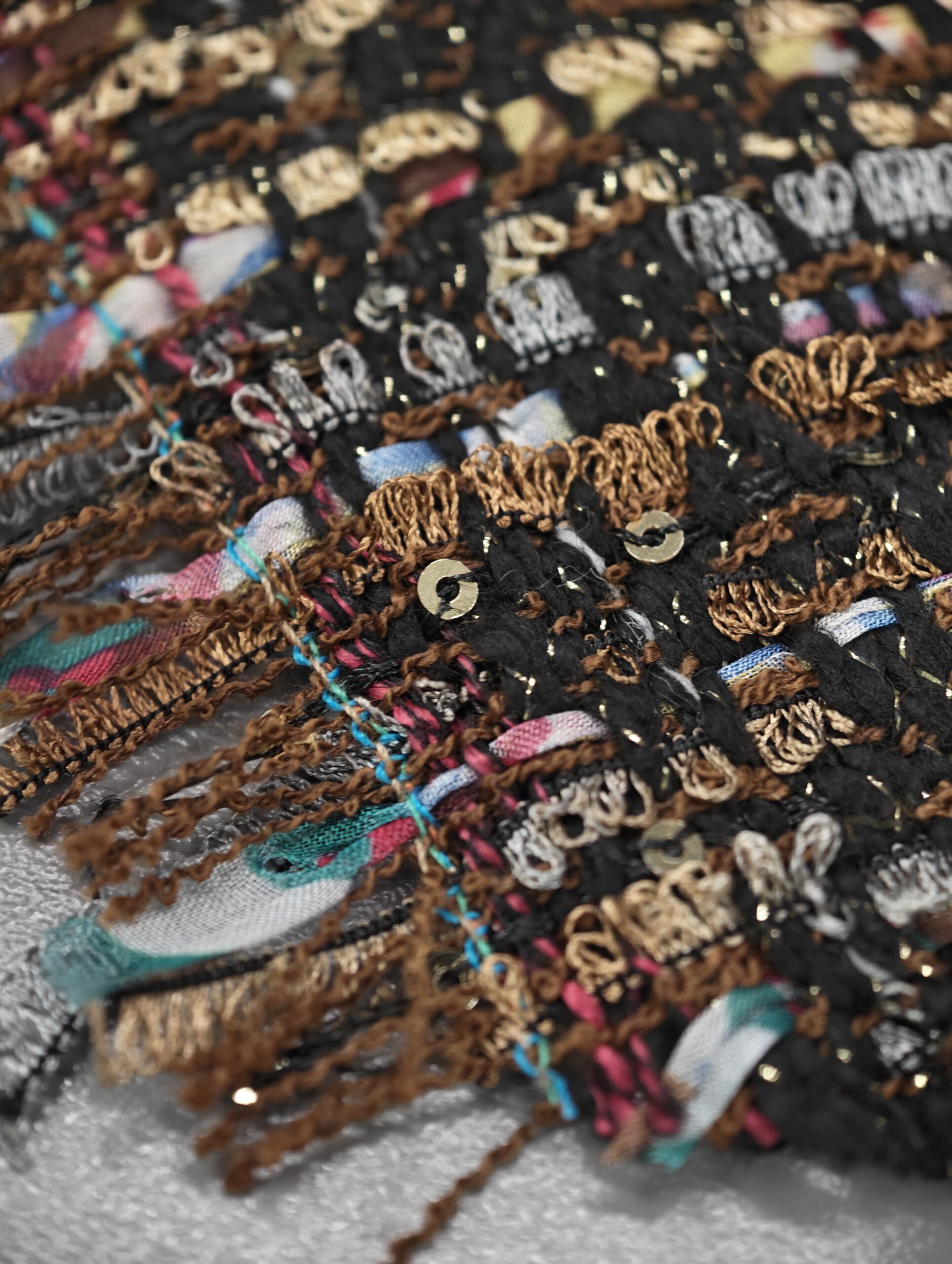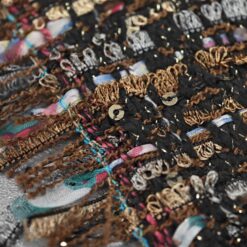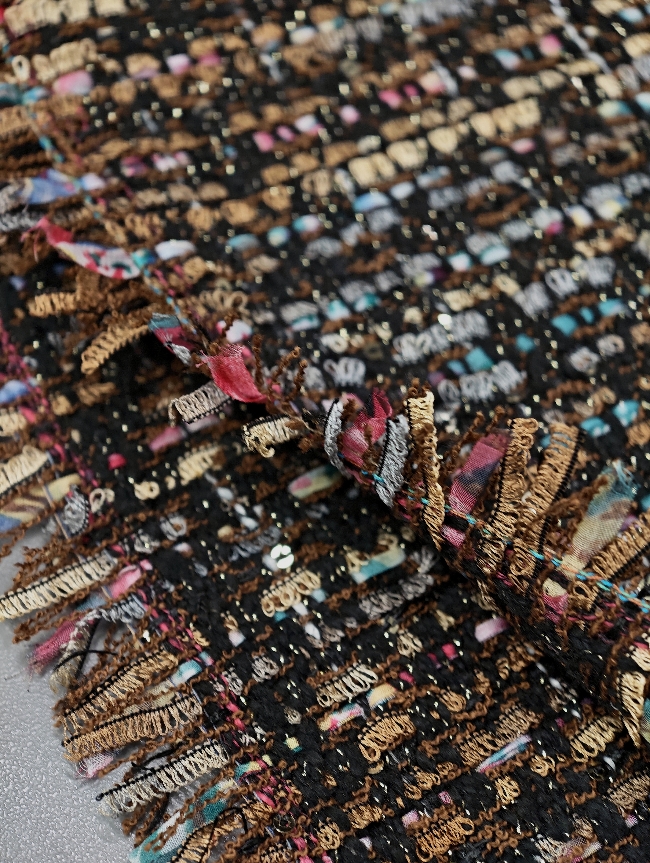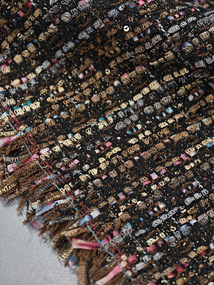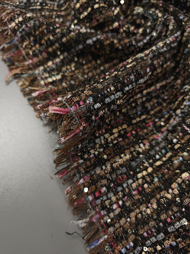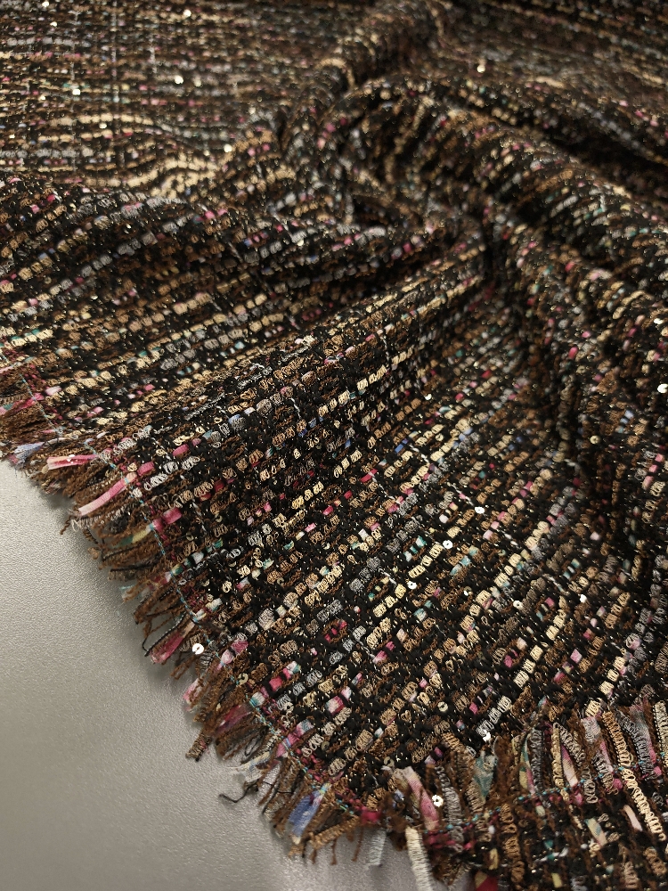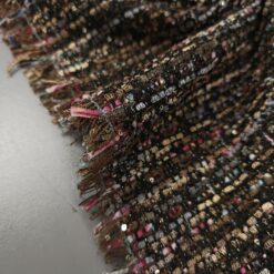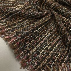 Mehak in prijetno strukturiran bouclé v topli rjavi barvi z drobnimi zlatimi bleščicami, ki materialu dodajo diskreten sijaj. Površina je značilno zankasta in živa, blago deluje bogato ter kakovostno, hkrati pa ostaja nosljivo in udobno.