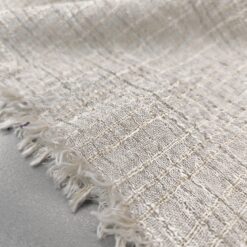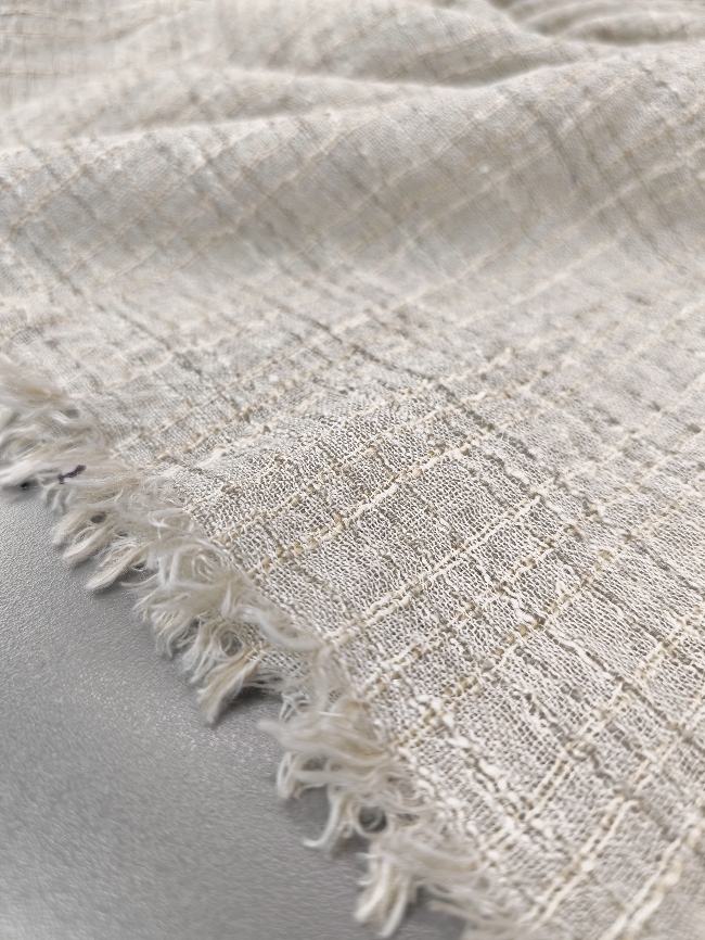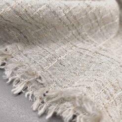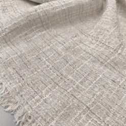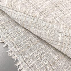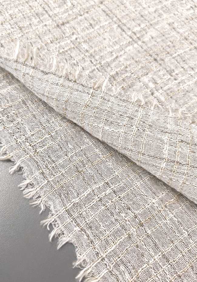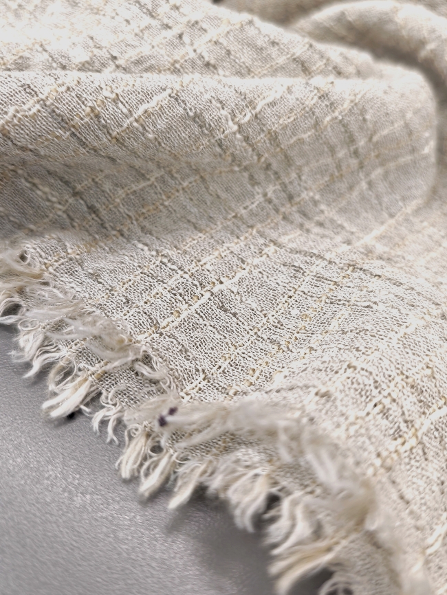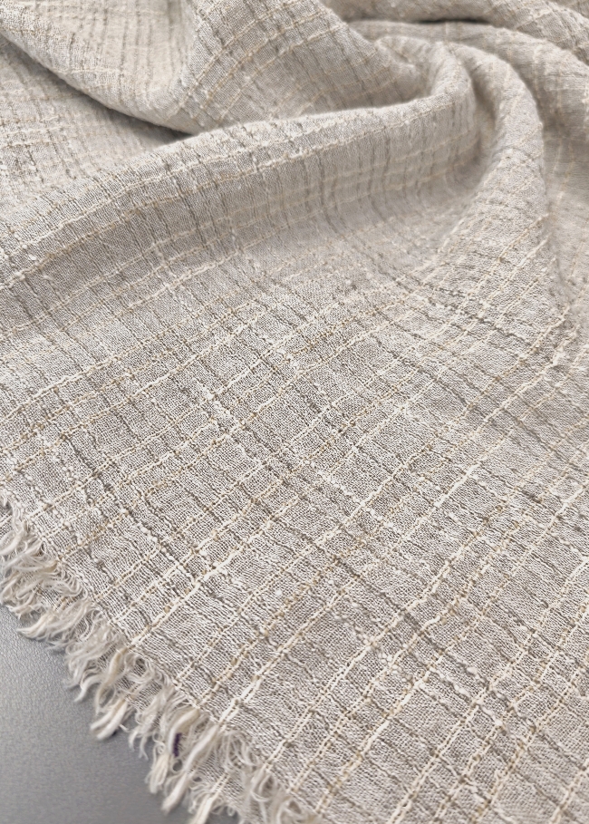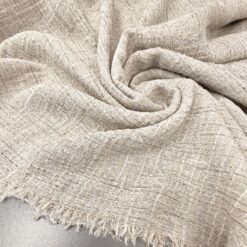 Lahka bouclé tkanina v natur tonu z izrazito reliefno strukturo. Mešanica lana in bombaža daje materialu naraven videz in prijeten otip.