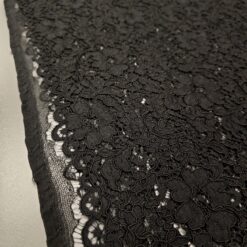 Črna čipka z gostim, bogatim vezenjem in rahlo elastičnostjo. Vzorec je poln in izrazit, zato deluje močno že na prvi pogled. Material ima kompaktno strukturo, hkrati pa minimalna raztegljivost omogoča boljše prileganje pri oblačilnih krojih.