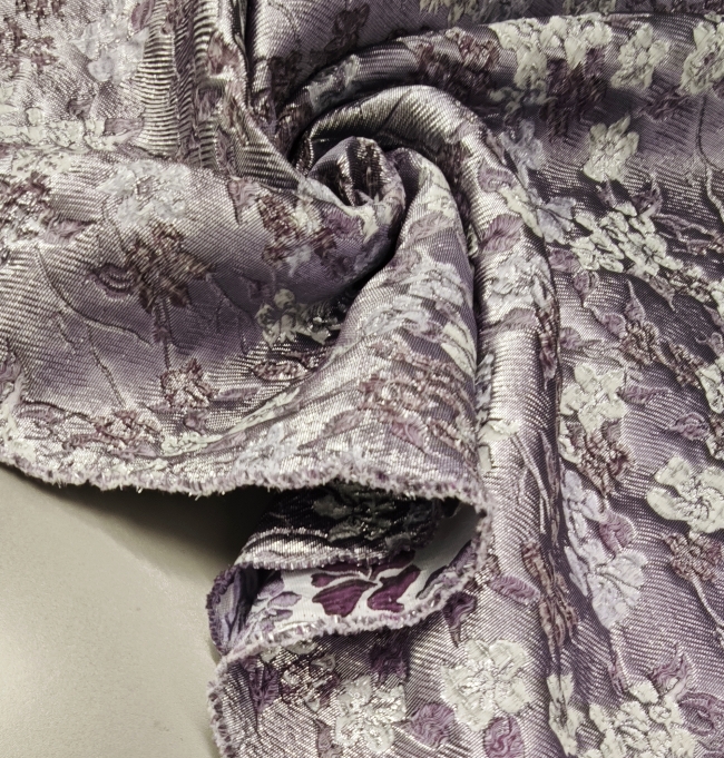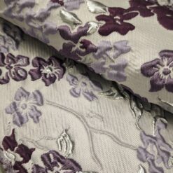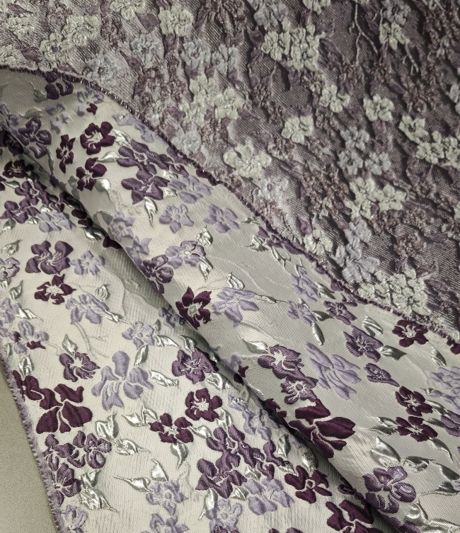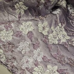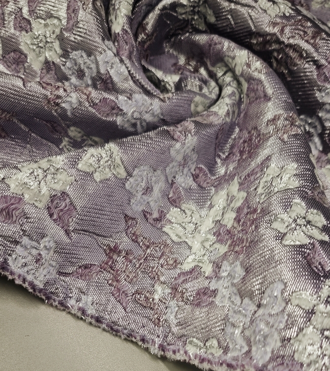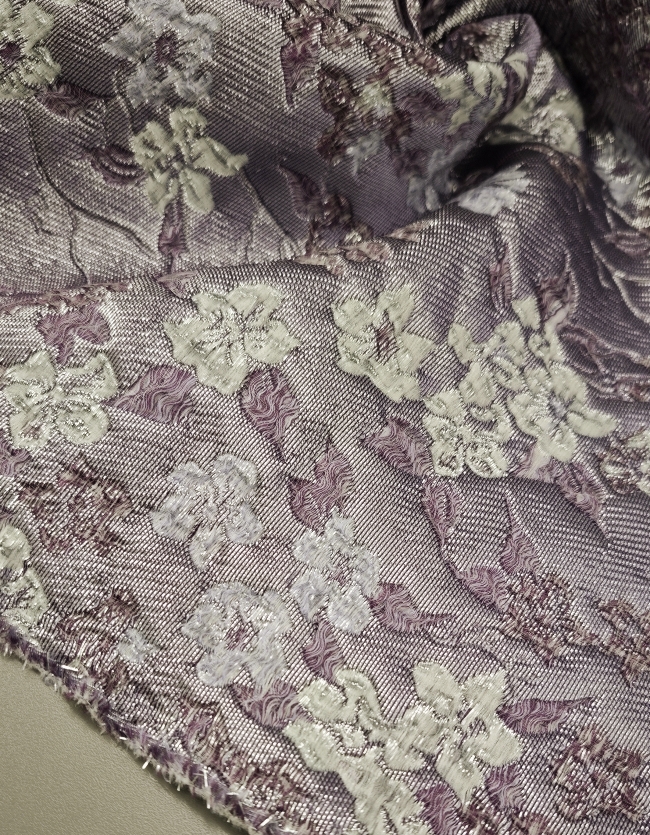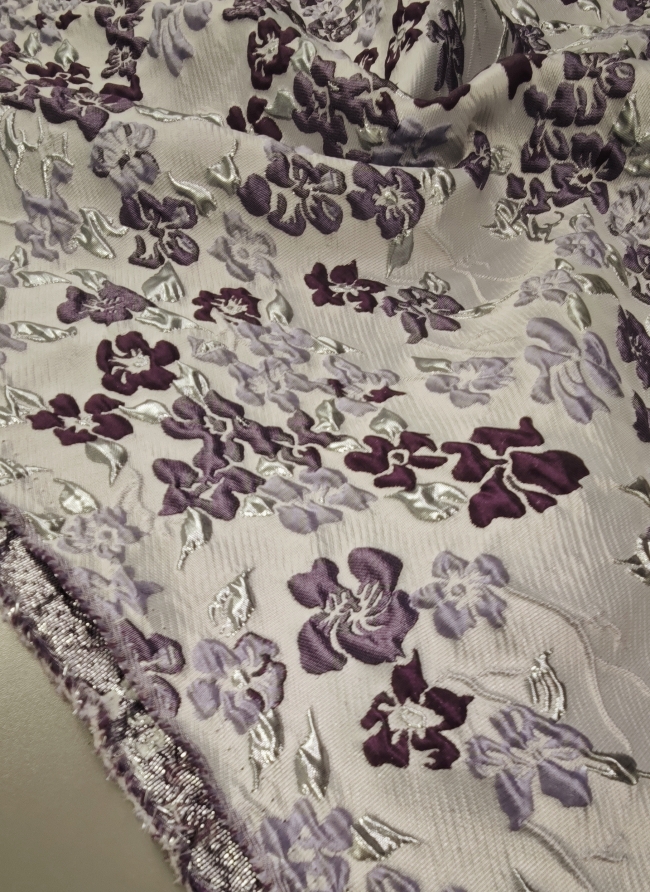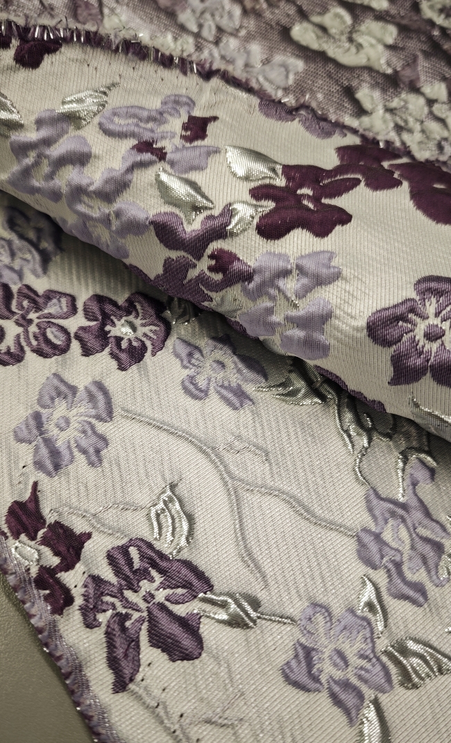 Ta prefinjen obojestranski žakard navdušuje s čudovito igro svetlobe in barvnih odtenkov – nežno srebrna se prepleta z vijolično v popolni harmoniji. Tkanina je srednje težka, mehka na otip in lepo pada, zato je idealna za ustvarjanje elegantnih oblačil, suknjičev, kril ali modnih dodatkov, pa tudi za dekorativne elemente, kot so blazine ali zavese.
