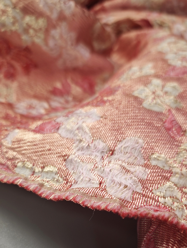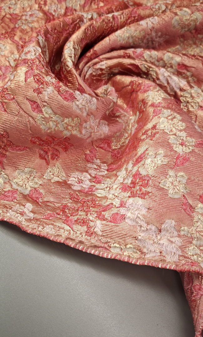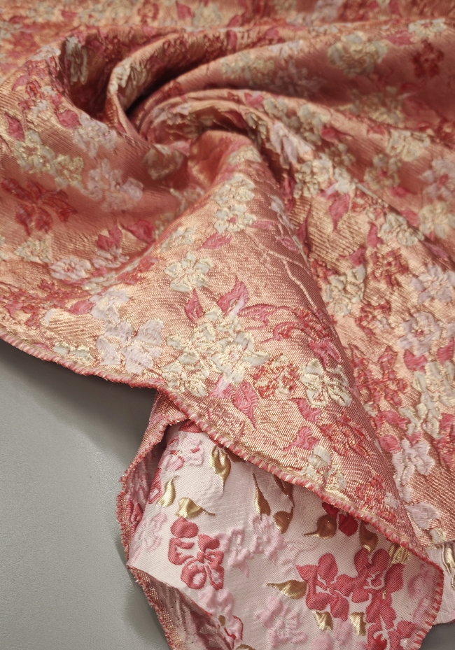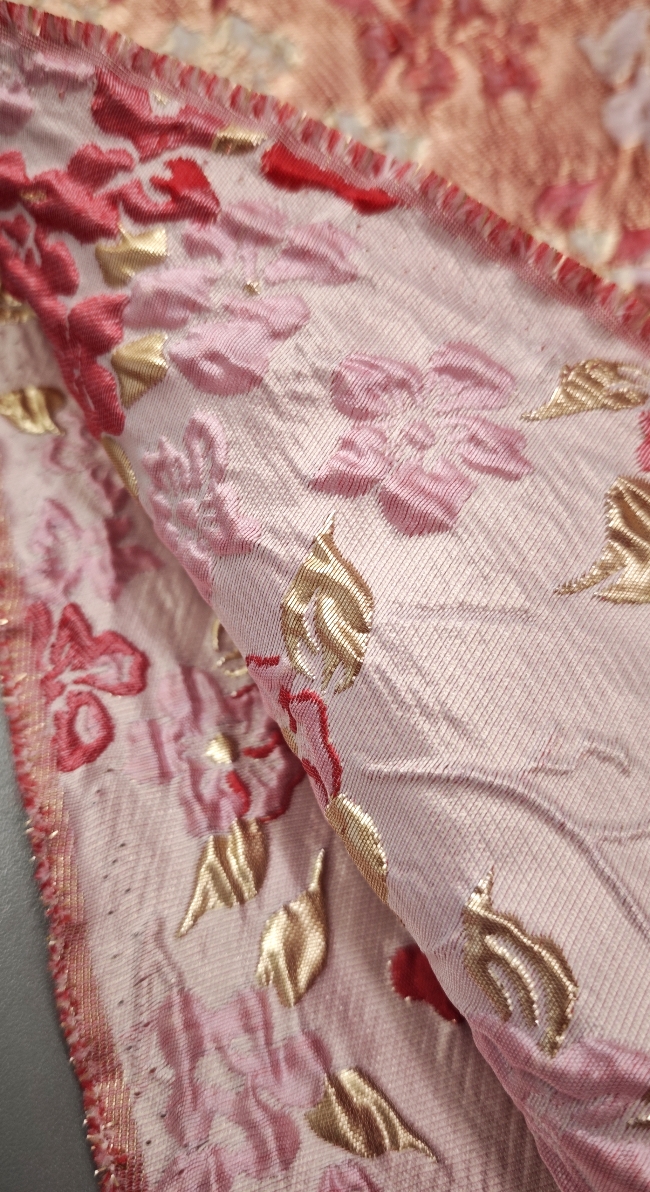 Obojestranski žakard v nežno roza barvi z rahlim prelivanjem in izrazitim cvetličnim 3D reliefom. Namenjen je oblačilnim namenom, kot so obleke, krila, jakne, telovniki in kostimi. Primeren je tudi za dekorativne projekte, kjer je zaželena izrazita struktura in tekstura blaga.