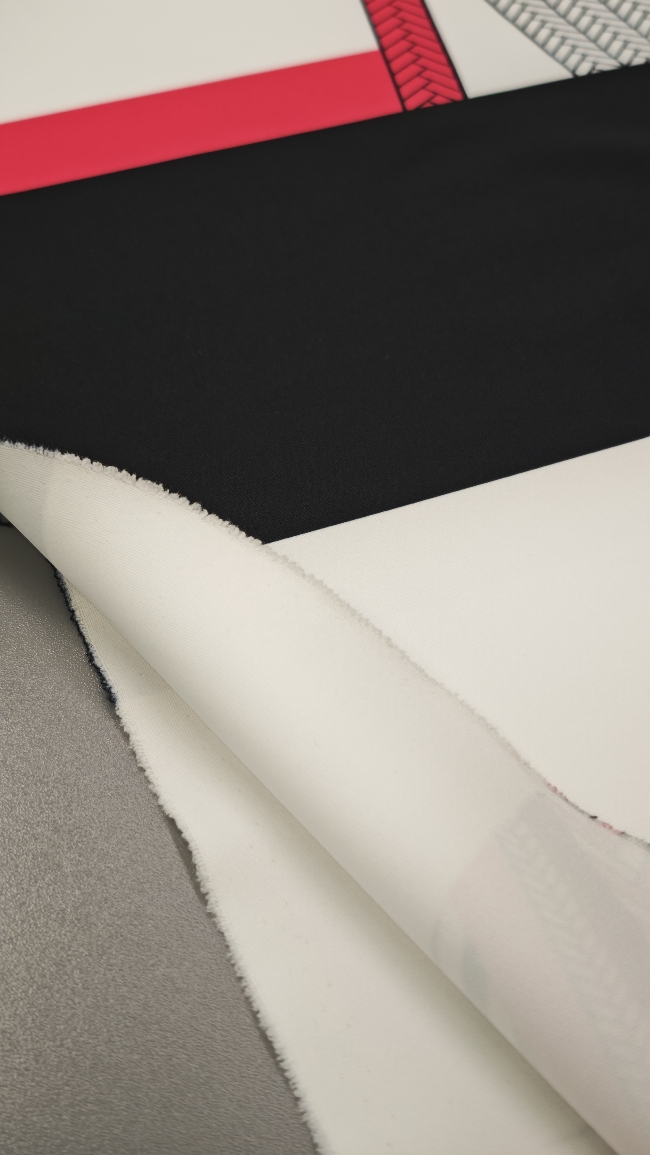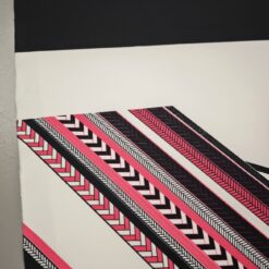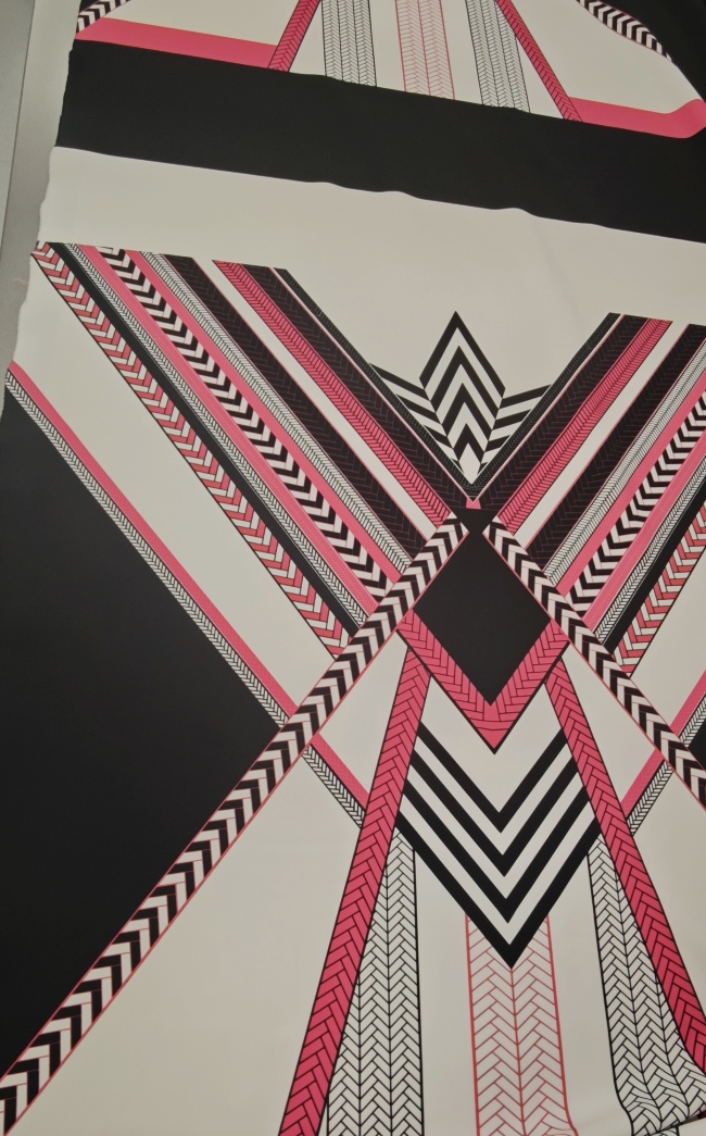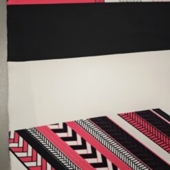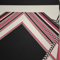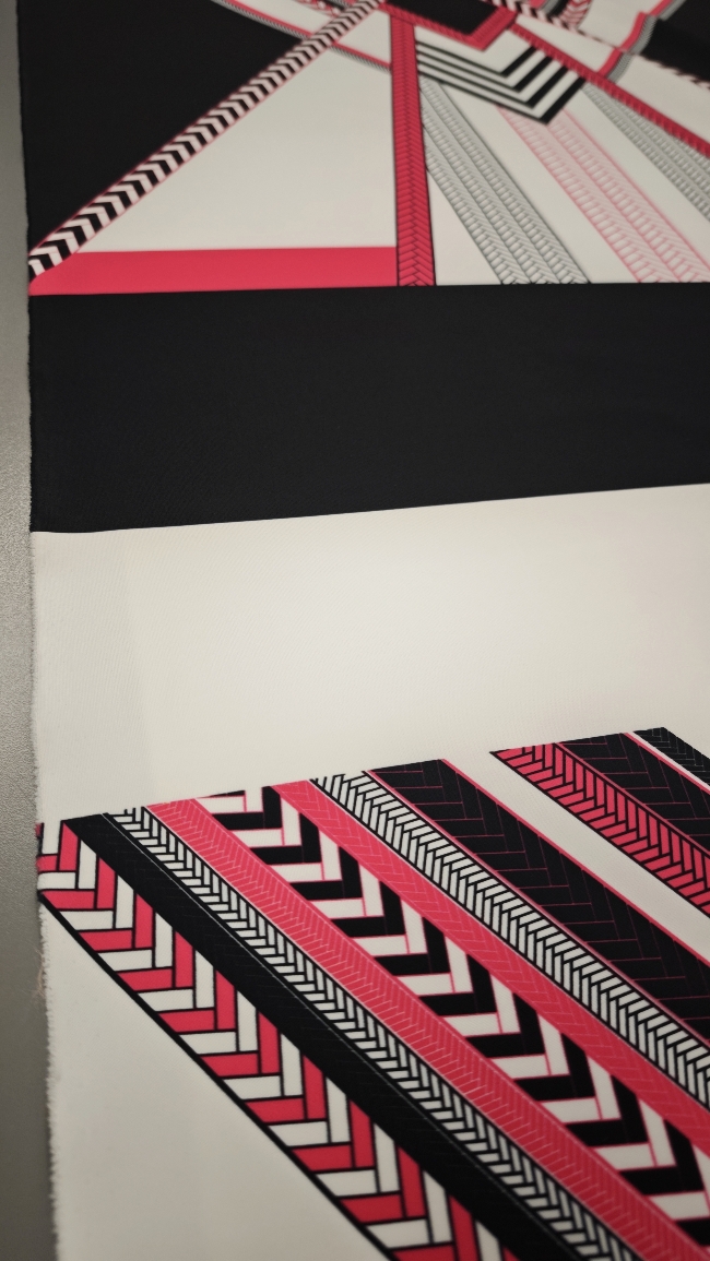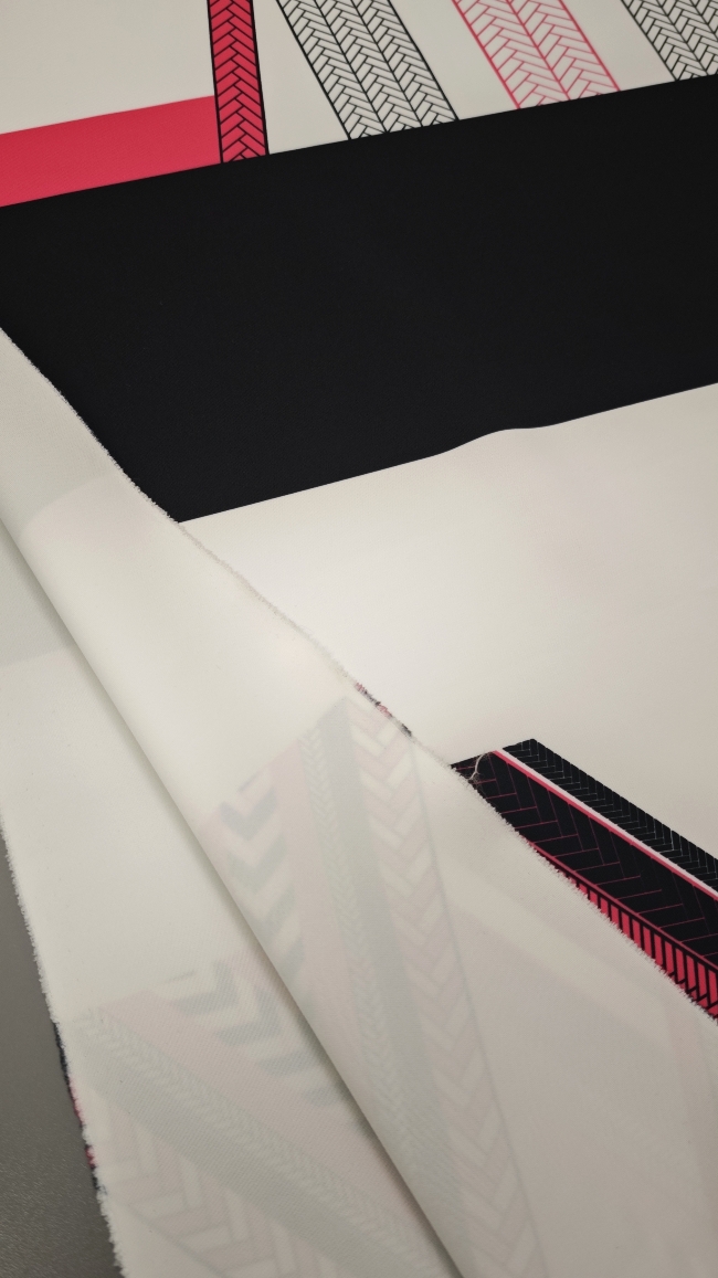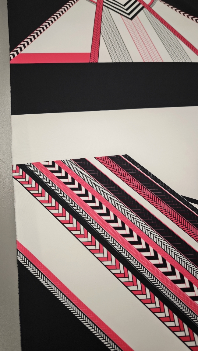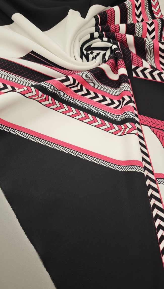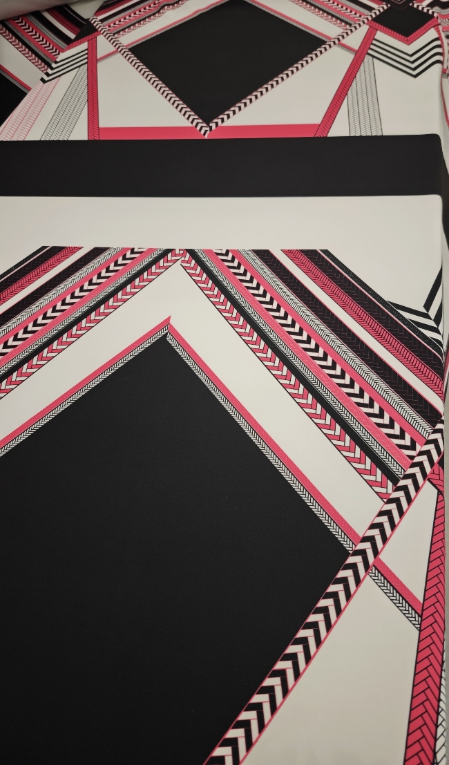 Ta posebna scuba tkanina v jersey izvedbi združuje elastičnost, udobje in vizualni učinek, ki pritegne že na prvi pogled. Geometrijski vzorec v kontrastni črno-beli kombinaciji z izrazito neon roza noto daje tkanini sodoben, urban pridih.