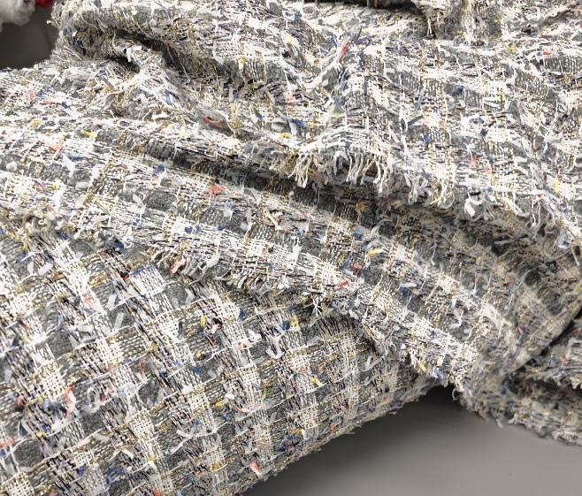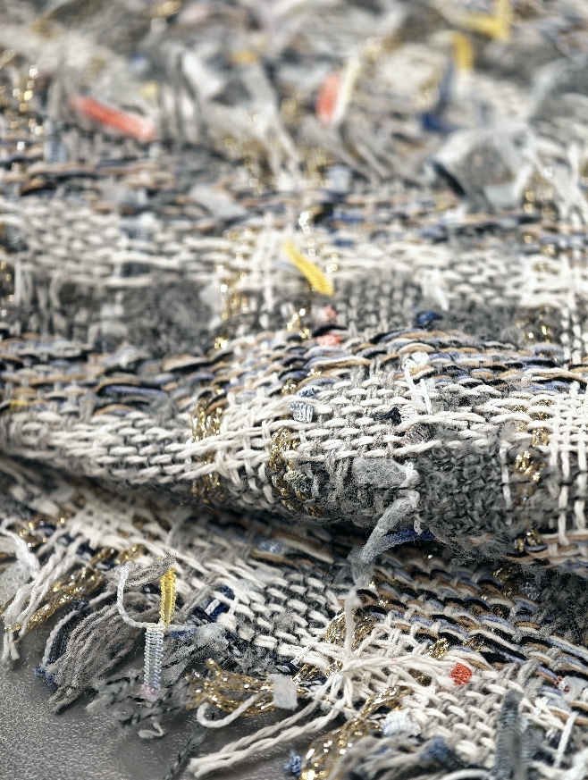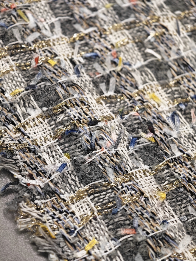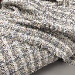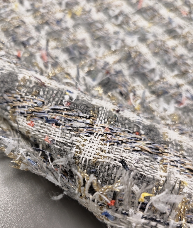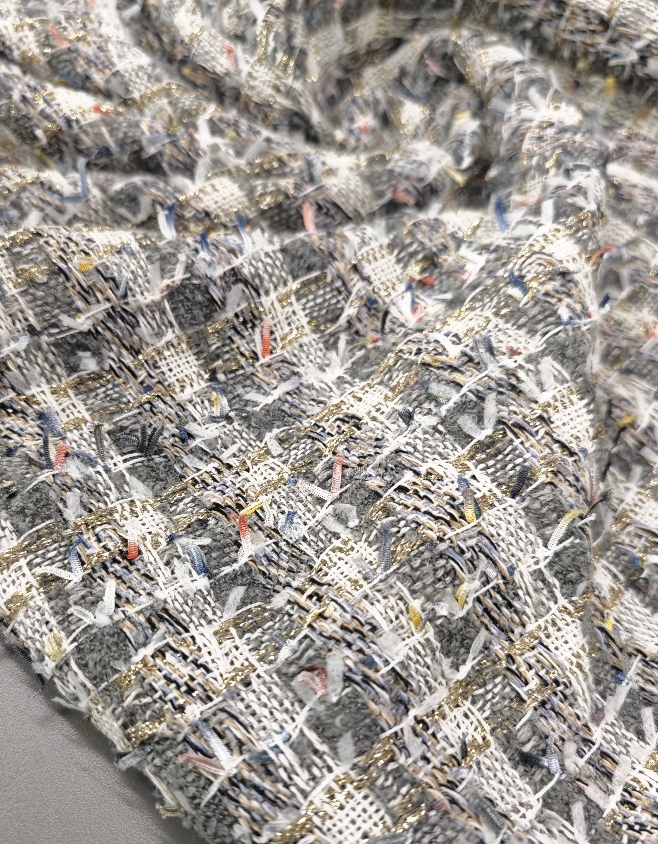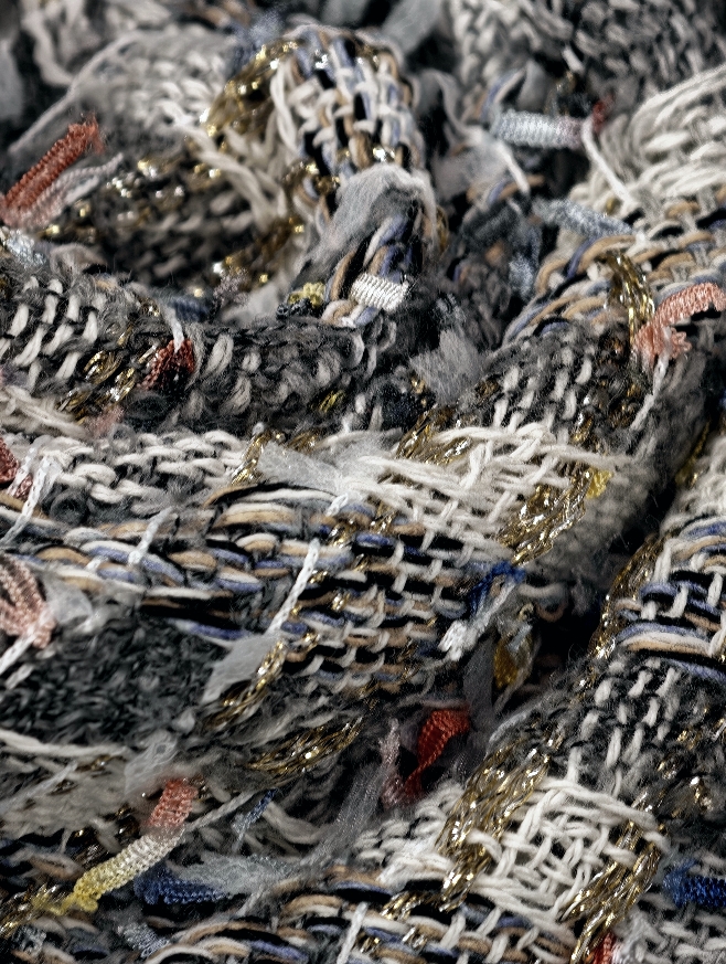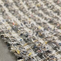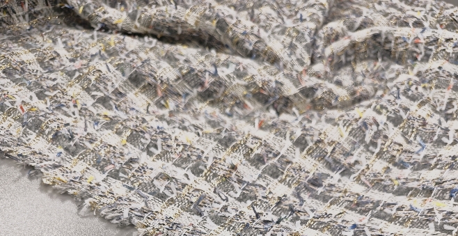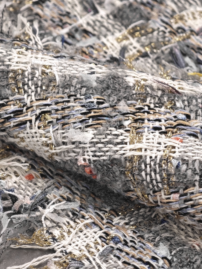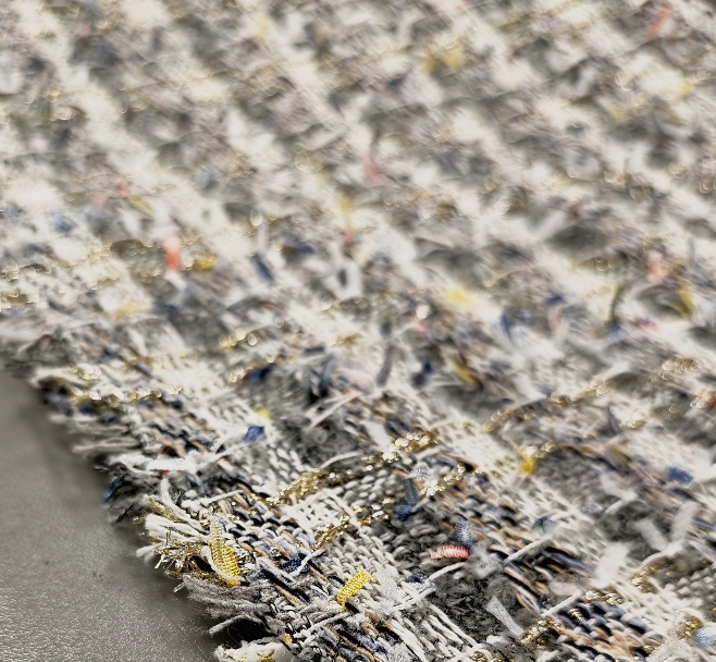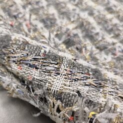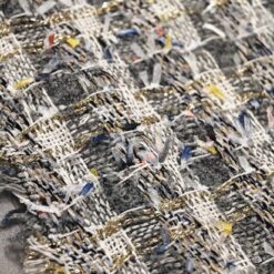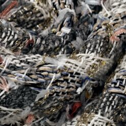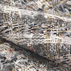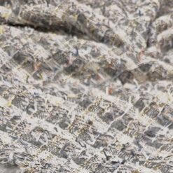 Kakovosten bouclé v sivo-beli kombinaciji z nežnim prepletom zlatih niti, ki ustvarijo opazen, a še vedno eleganten sijaj. Strukturirana površina daje materialu poln videz in lepo formo, zato je odlična izbira za izdelke, kjer mora tkanina držati obliko.