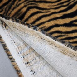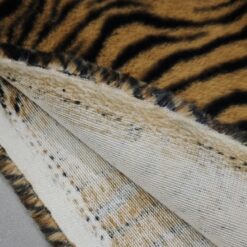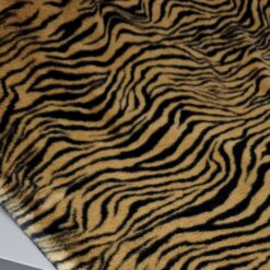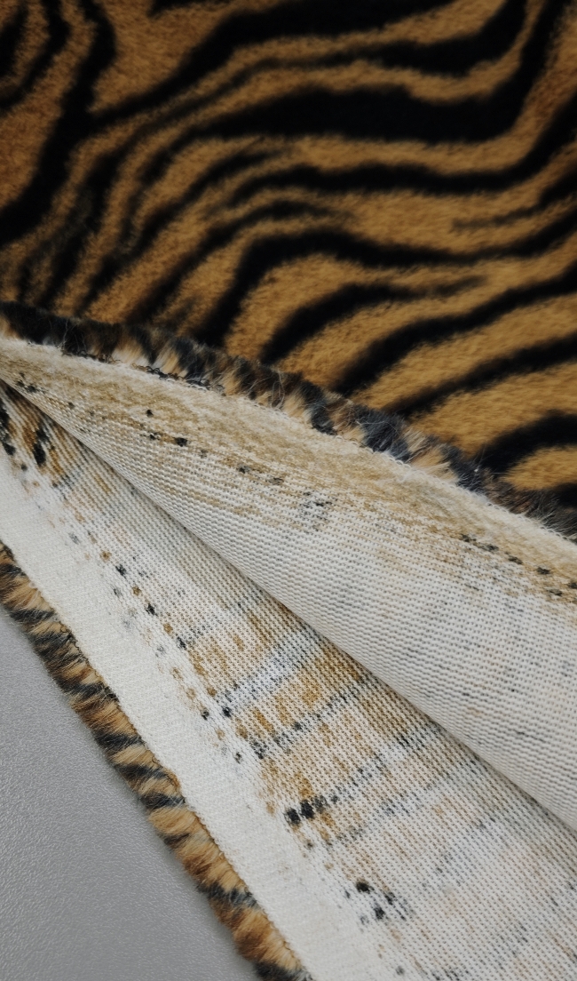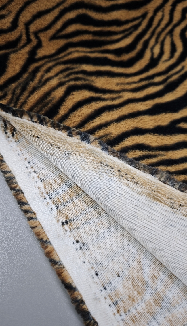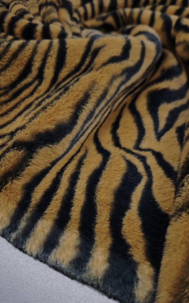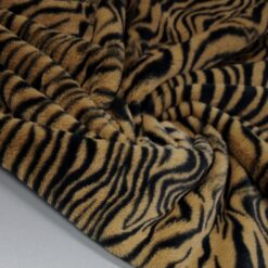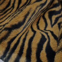 Izrazito umetno krzno z močnim tigrovim vzorcem v rjavo-črni barvni kombinaciji. Gosta, mehka dlaka ustvarja poln volumen in takoj opazen videz. Material deluje bogato, izrazno in vizualno zelo močno.