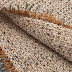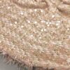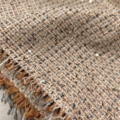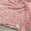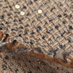 Bouclé tkanina v umazano alt roza barvi z drobnimi bleščicami in zlatimi nitmi. Zankasta struktura daje materialu značilen bouclé videz, večji delež bombaža pa poskrbi za naraven občutek in prijeten otip.