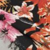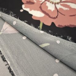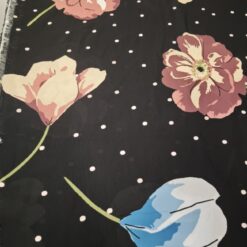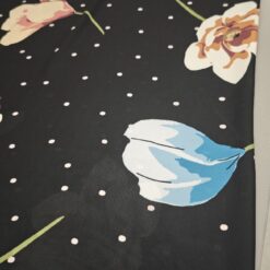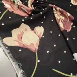 Ta žoržet s svojo rahlo prosojnostjo in kontrastom črne podlage, posute s tulipani in drobnimi pikami, prinaša moden in romantičen značaj. Tkanina je lahkotna, zračna in mehko padajoča, zato lepo sledi gibanju ter ustvarja eleganten videz.