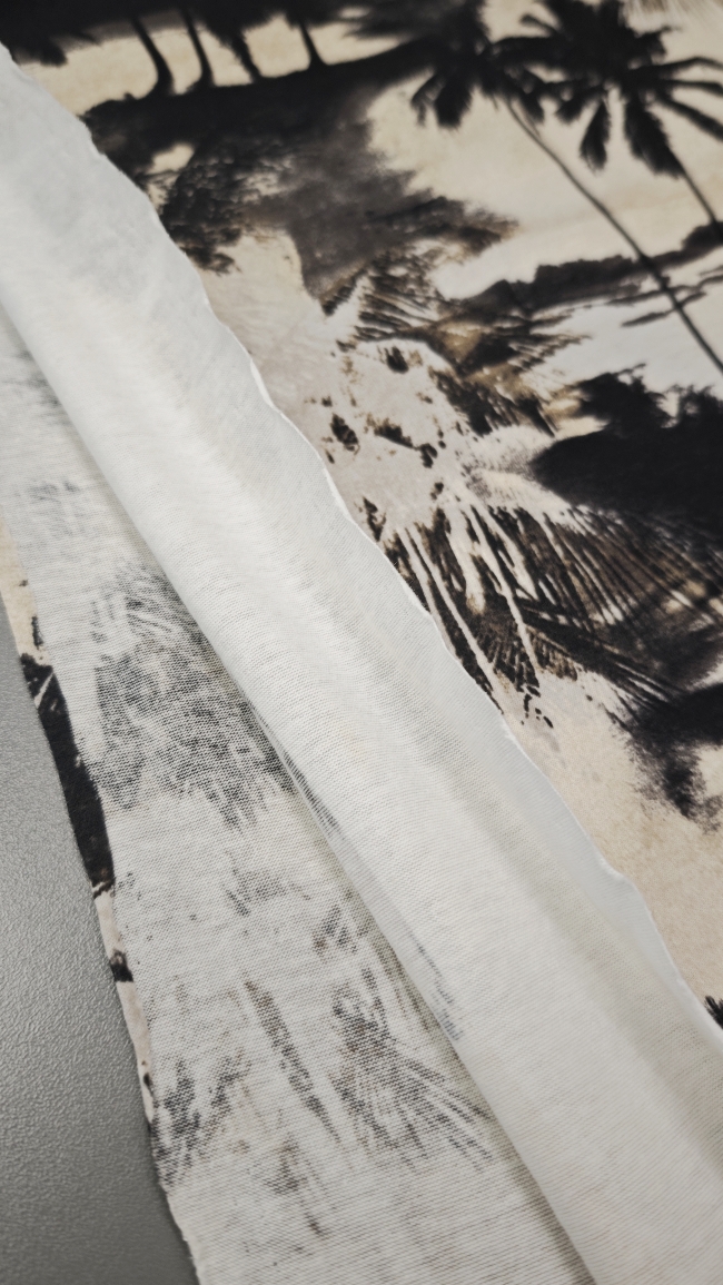Mehak in raztegljiv bombažni jersey z izrazitim vzorcem palm v bež-črni barvni kombinaciji. Prijeten na otip, zračen in udoben, primeren za vsakodnevno nošenje. Tkanina lepo pade, se ne lomi in omogoča sproščeno gibanje.
