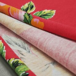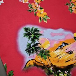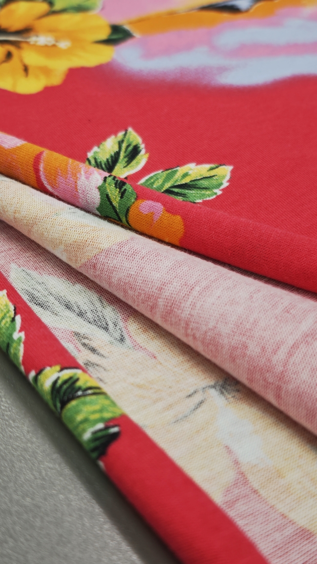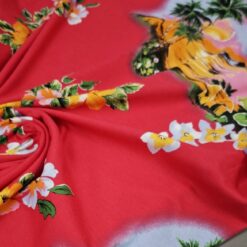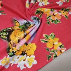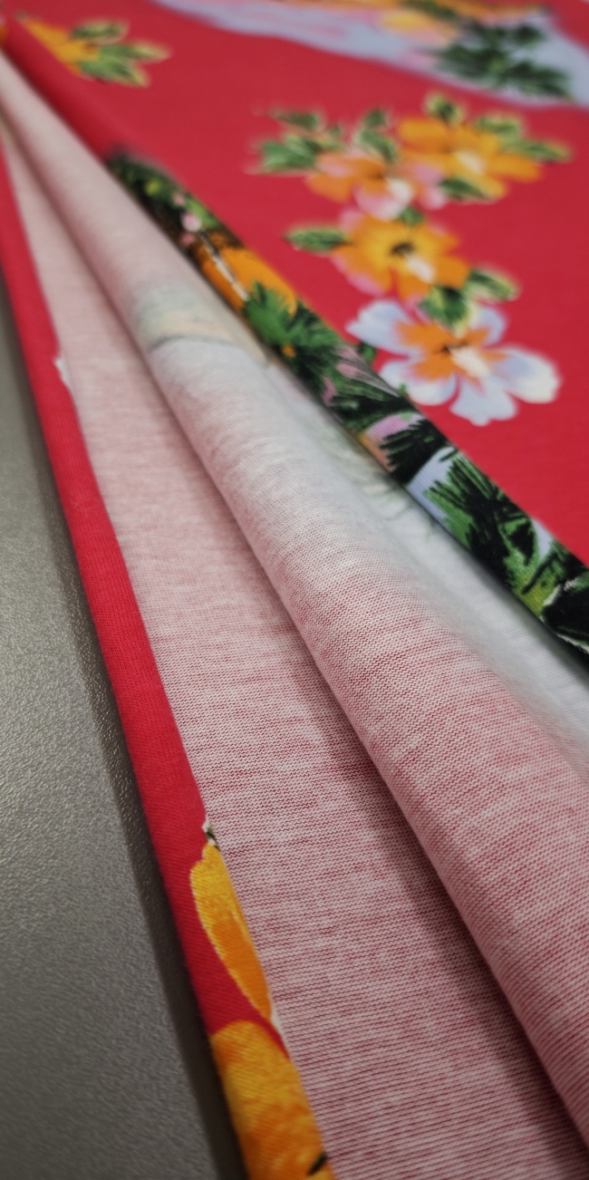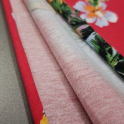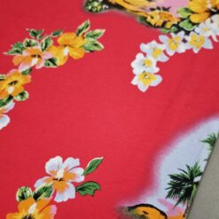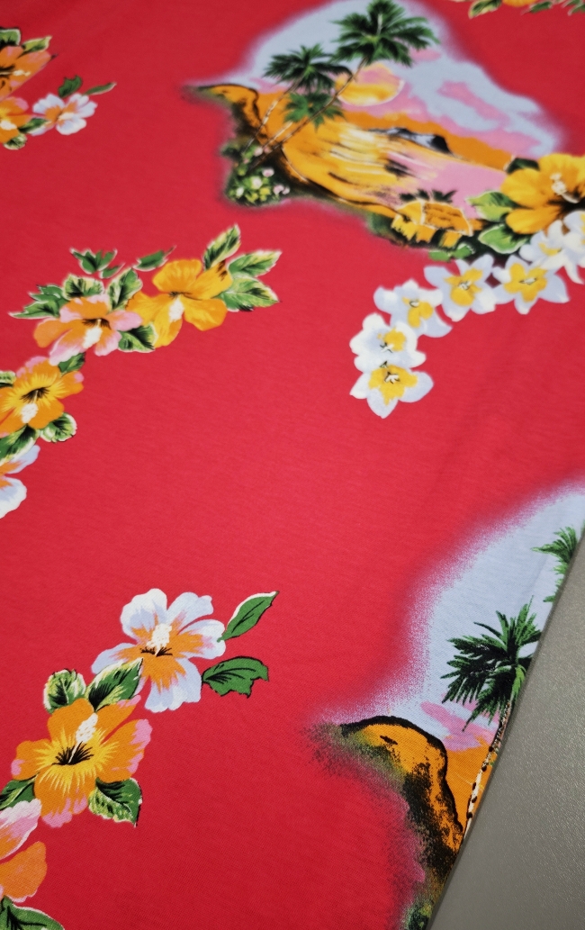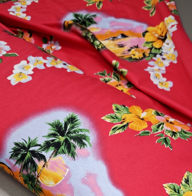 Mehak, elastičen bombažni jersey z izrazitim tropskim vzorcem palm na rdeči podlagi. Tkanina je prijetna na otip, lepo pada in se odlično obnese pri vsakodnevni nošnji. Primerna za majice, obleke, tunike, otroška oblačila in poletne komplete. Motiv daje občutek poletja, morja in sproščenega havajskega sloga.