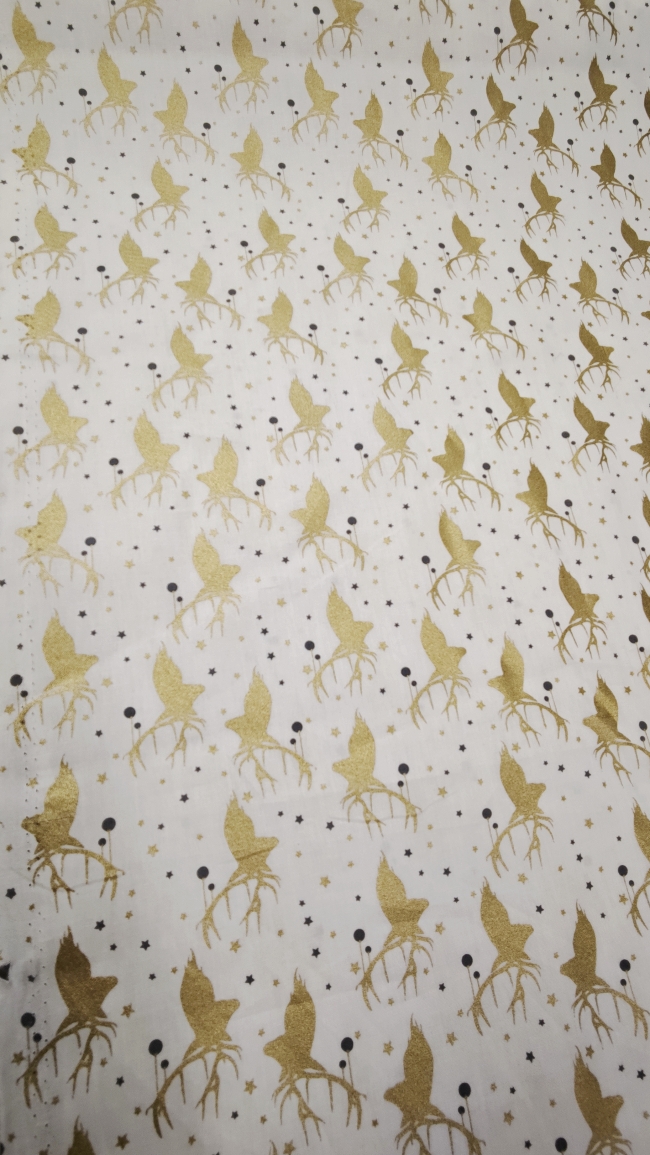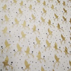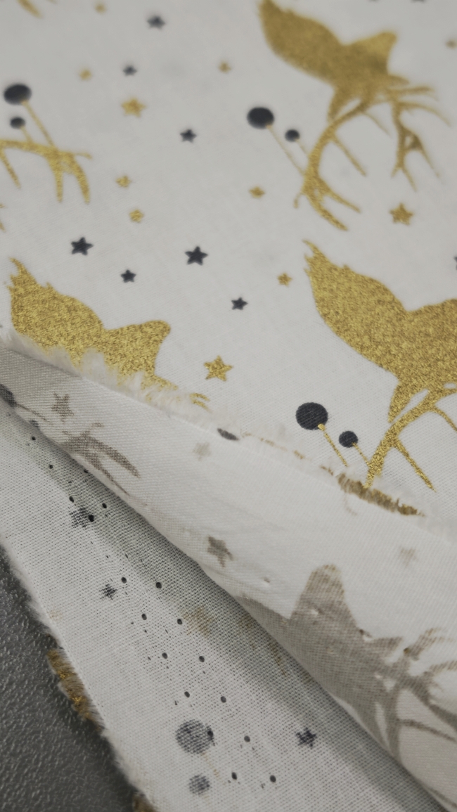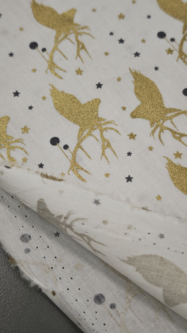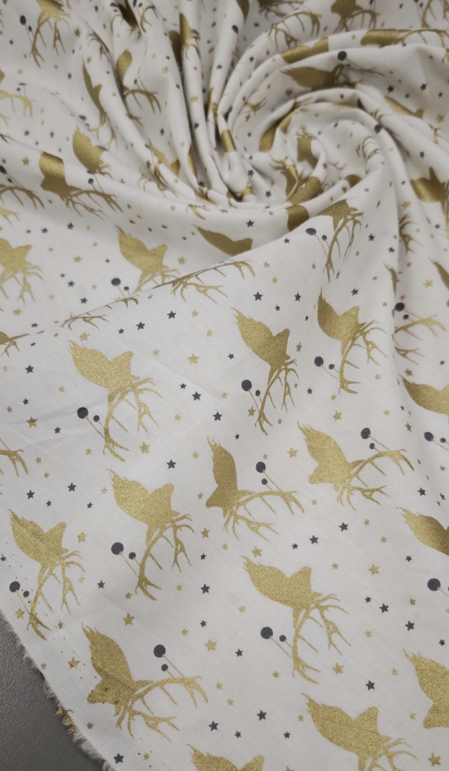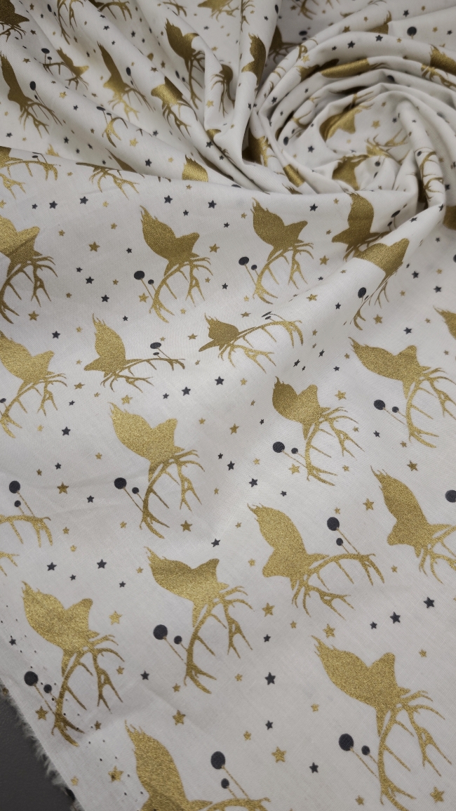 Ta svečani poplin v kombinaciji bele podlage in nežnega zlatega motiva takoj ustvari topel, prazničen občutek. Tkanina je mehka, prijetna na otip in lepo pada, zato je odlična za ustvarjanje prazničnih oblačil in dekorja za dom.