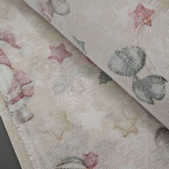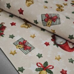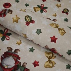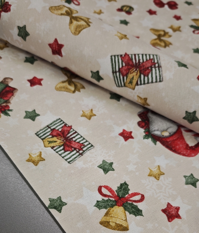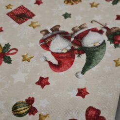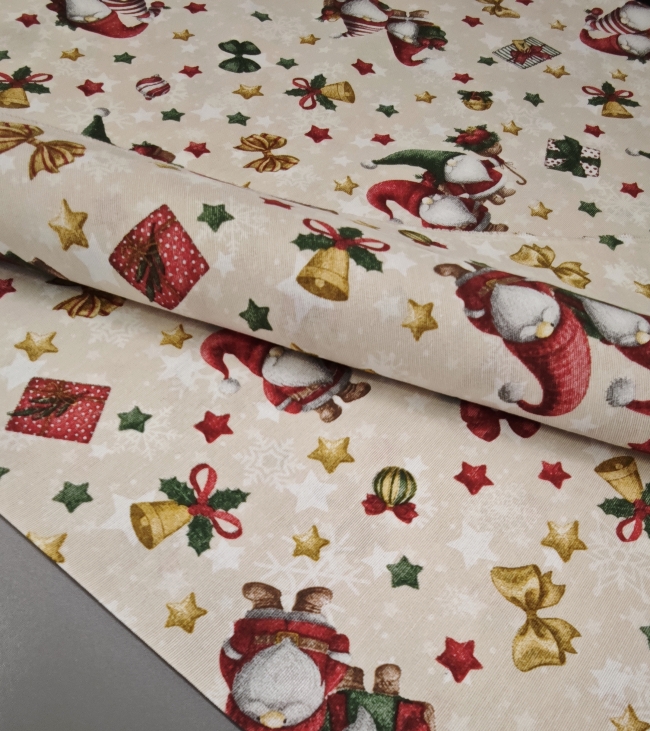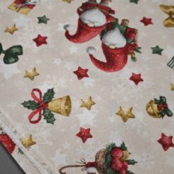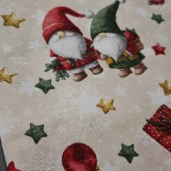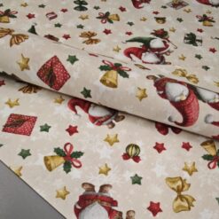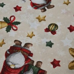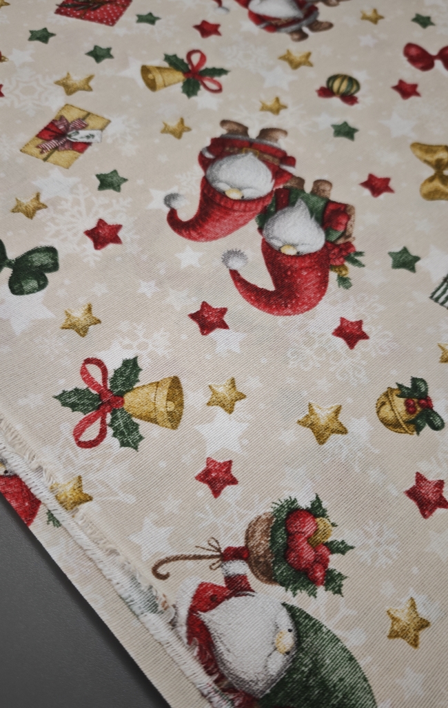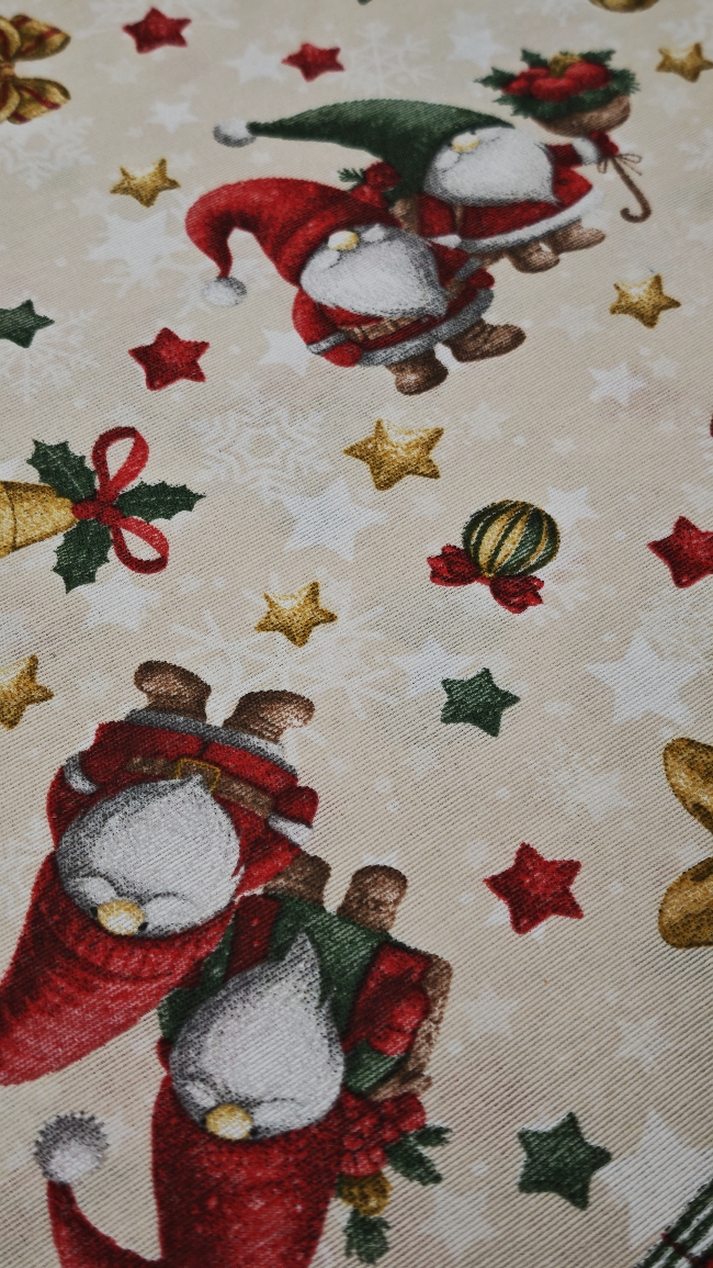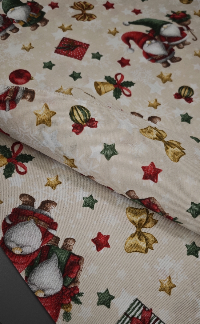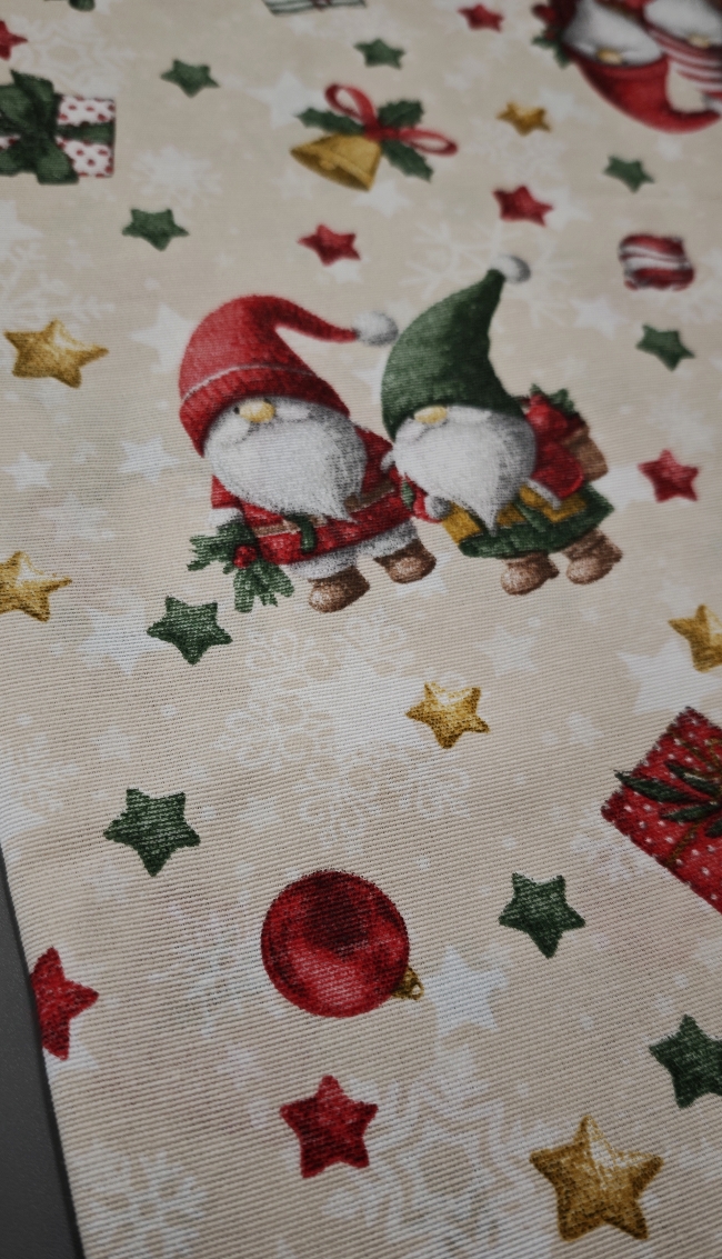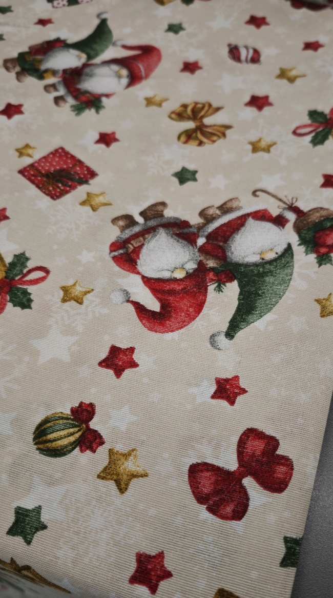 Ta kakovostna dekorativna tkanina z očarljivim motivom škratkov, zvezdic in zimskih detajlov je popolna izbira za ustvarjanje toplih in igrivih prazničnih dekoracij.