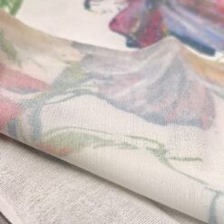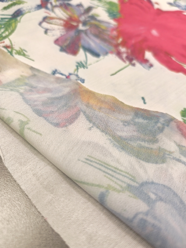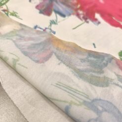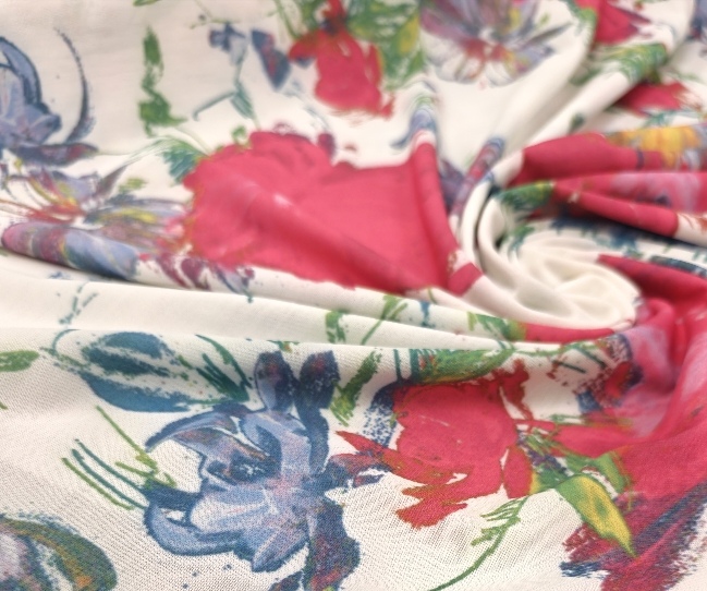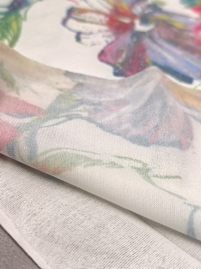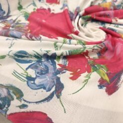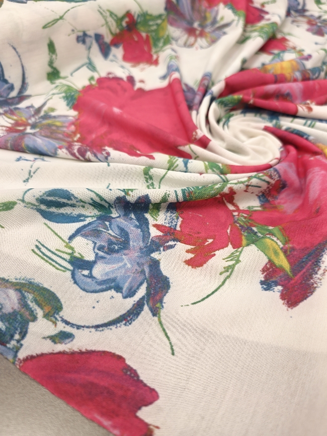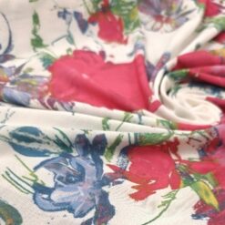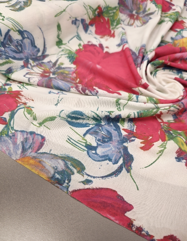 Bela elastična lycra s cvetličnim potiskom. Gladka, raztegljiva in prijetna na otip. Dobro se prilega telesu in lepo drži obliko. Primerna za pajkice, tope, kopalke, športna in plesna oblačila ter oprijete modne modele. Cvetlični potisk doda svež in privlačen videz, ki izstopa.