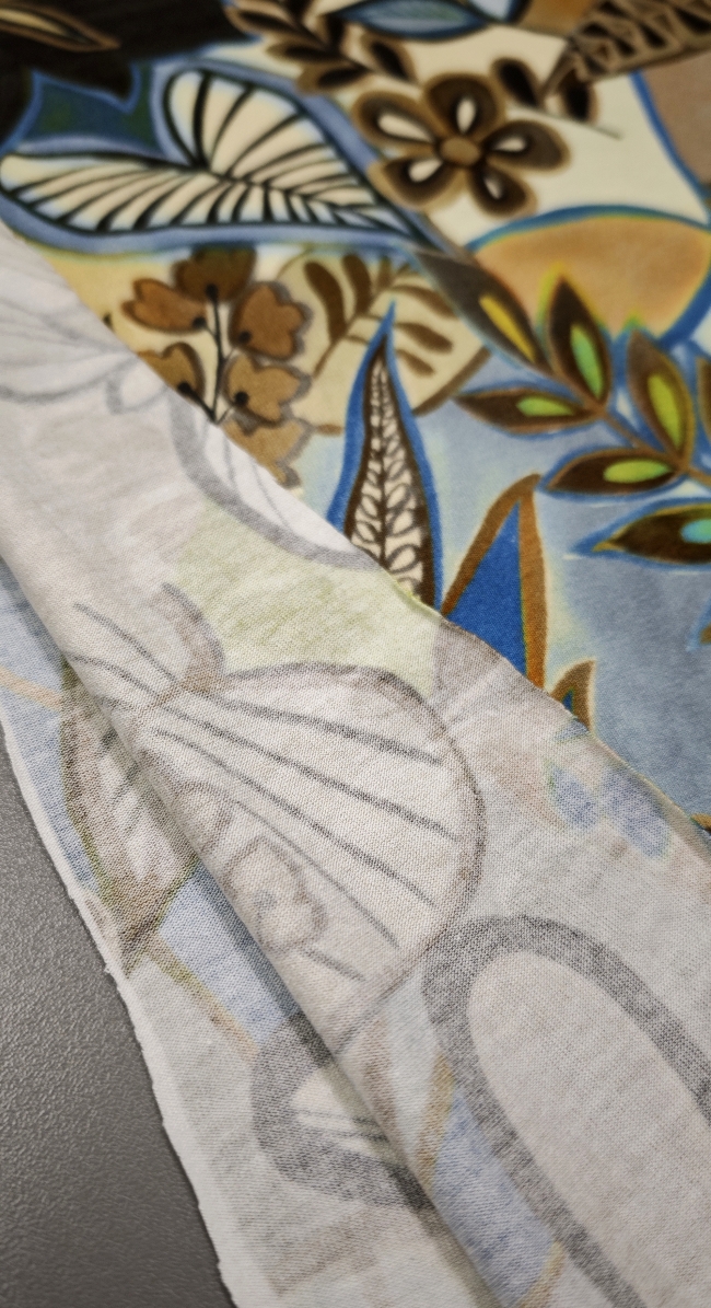 Mehak in elastičen bombažni jersey z botaničnim vzorcem v modro-bež barvah. Prijeten na koži in primeren za majice, obleke, tunike, otroška in vsakodnevna oblačila. Vzorec je jasno viden, barve so umirjene, blago pa uporabno za širok spekter šiviljskih projektov.
