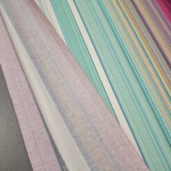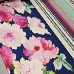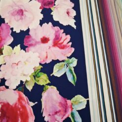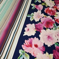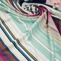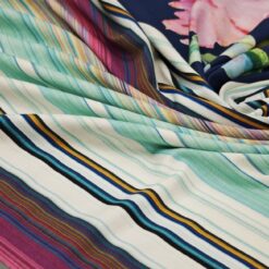 Mehak bombažni jersey z jasnim, opaznim vzorcem cvetja in črt, ki takoj pritegne pogled. Material je zračen, elastičen in prijeten za nošenje, lepo se prilega in ohranja obliko tudi pri redni uporabi. Vzorec deluje sveže, sodobno in je primeren za oblačila, ki morajo izstopati, ne da bi bila vsiljiva.