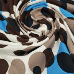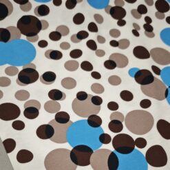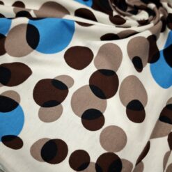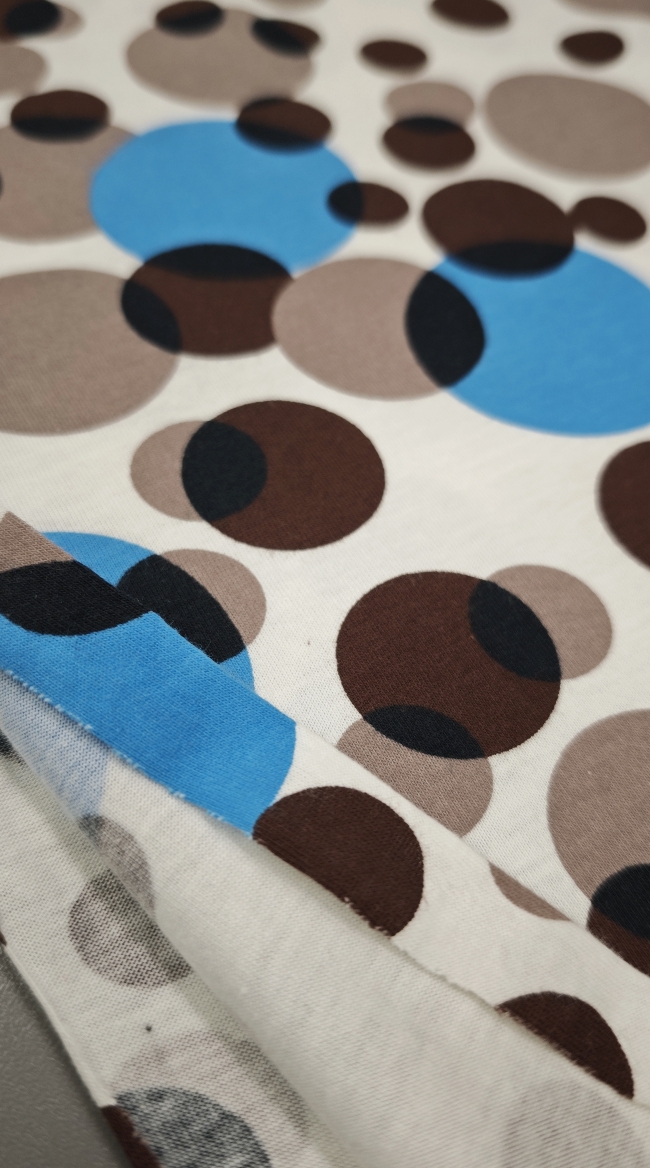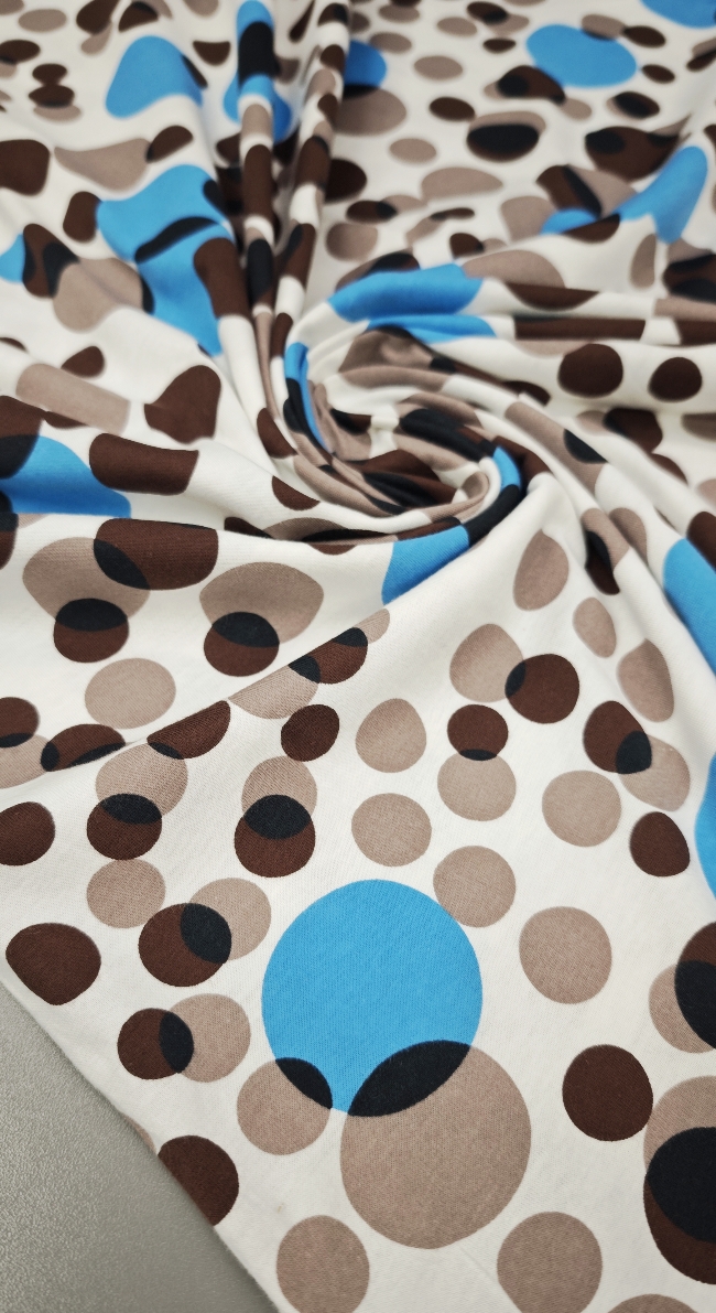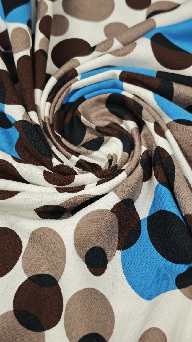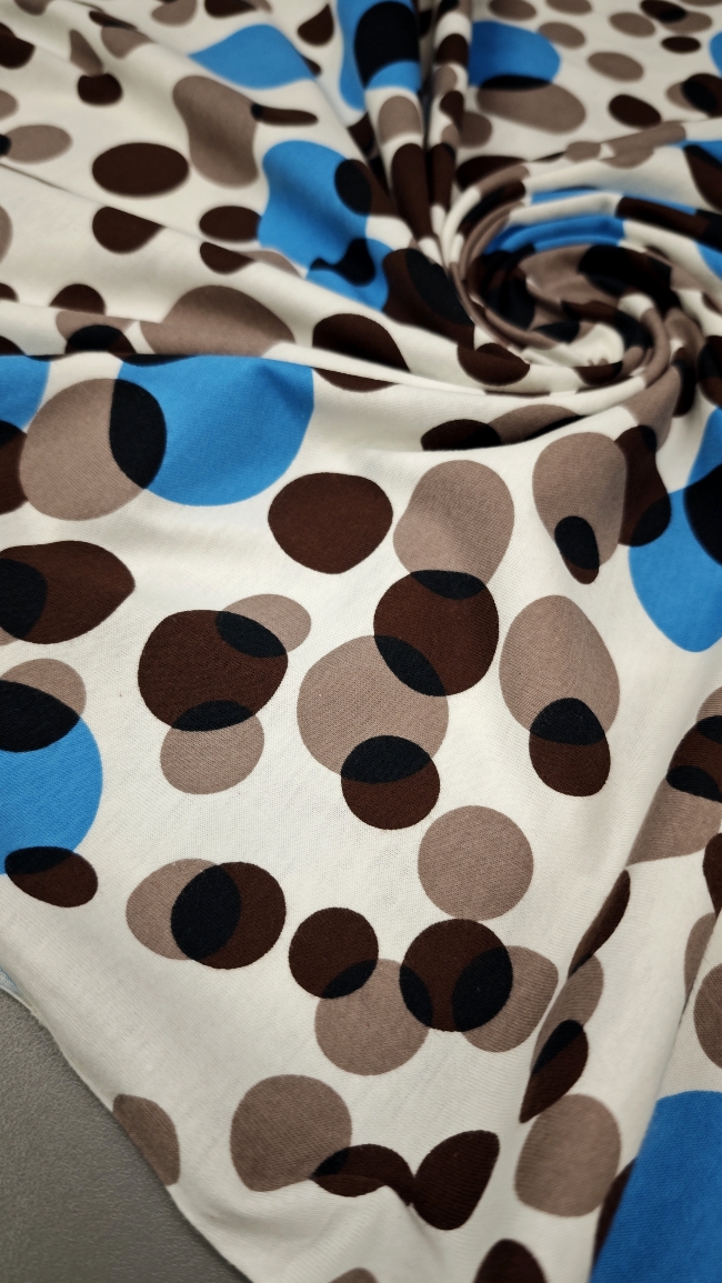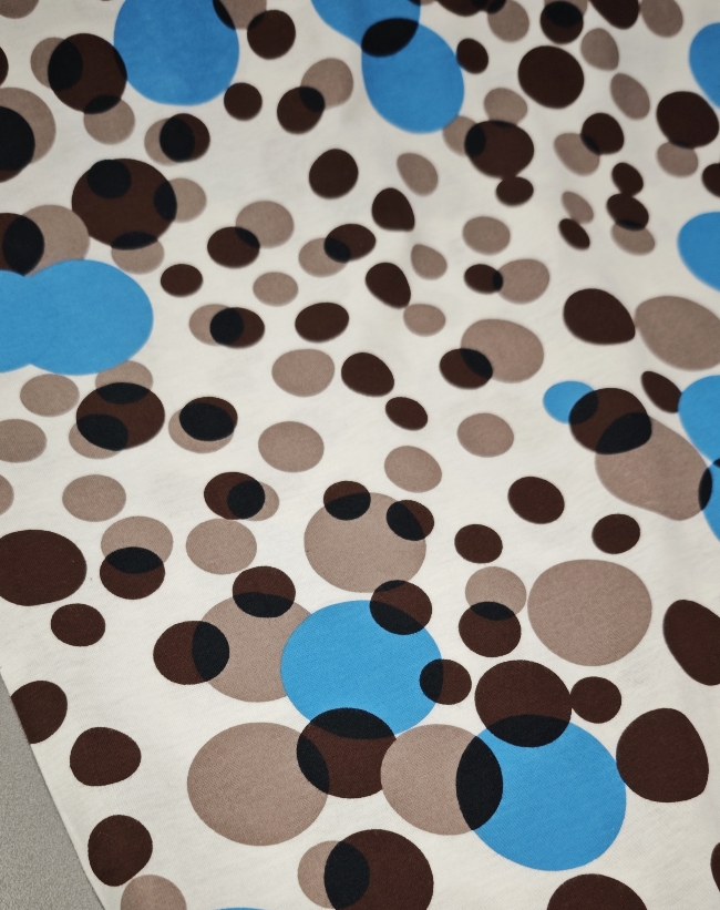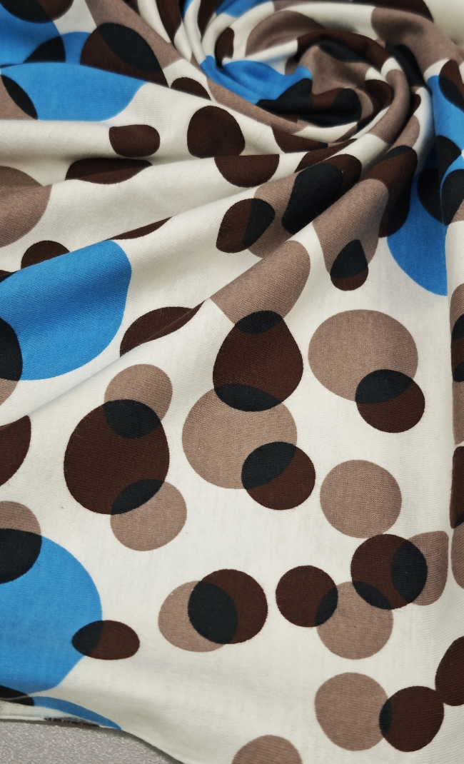 Mehak in prijeten bombažni jersey z večjimi pikami. Tkanina je elastična, zračna in udobna na dotik, primerna za vsakodnevno nošenje. Lepo se prilagaja telesu in omogoča sproščeno gibanje.