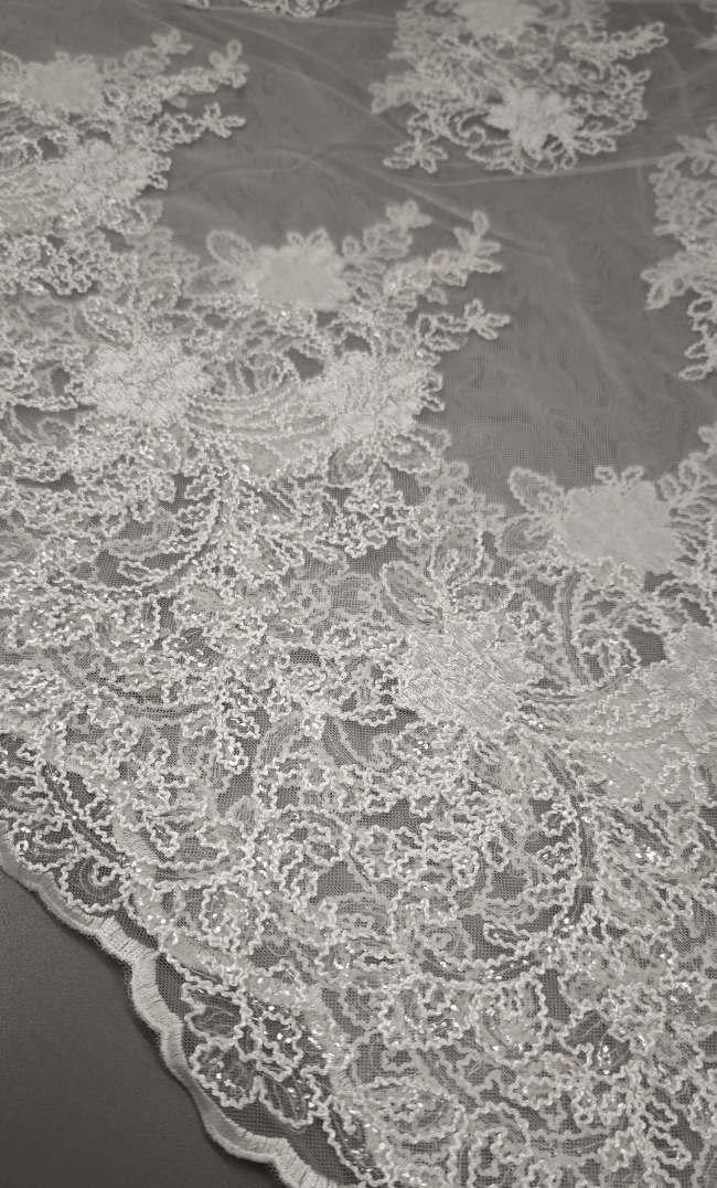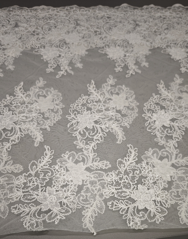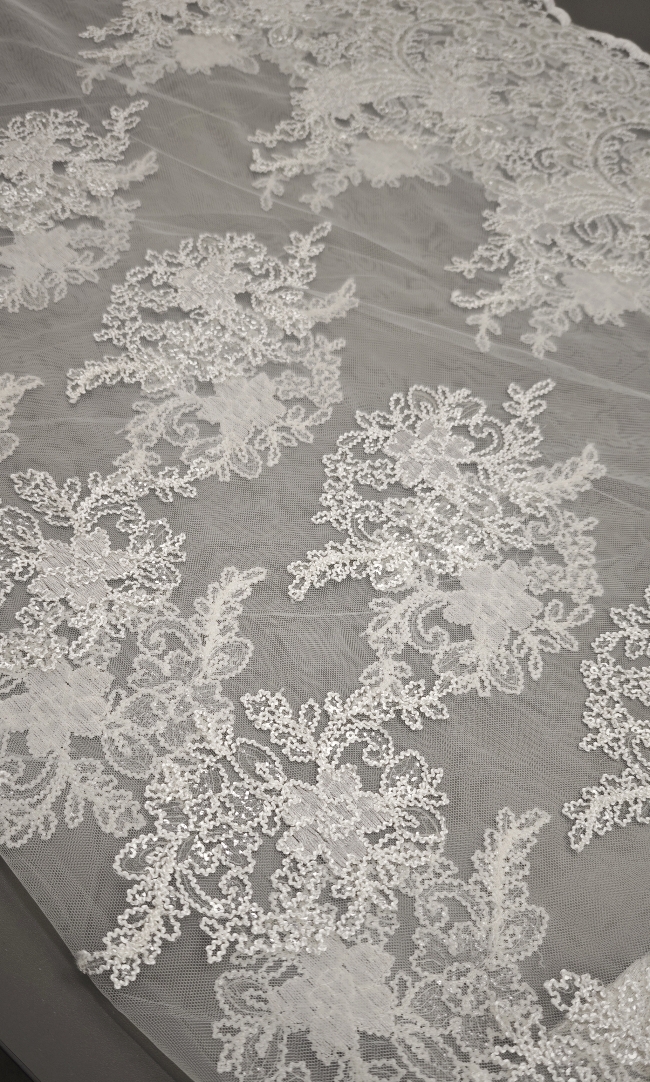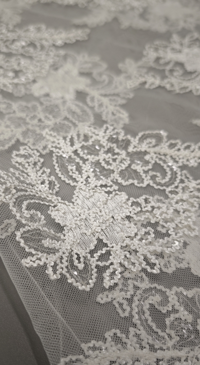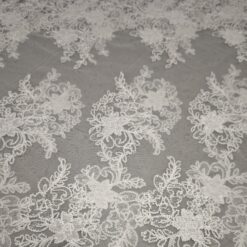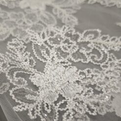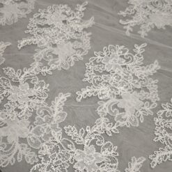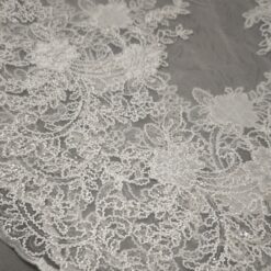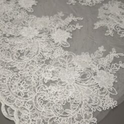 🎁 Luksuzna ivory bela čipka na tilu z bogatim zaključkom – popolna za poročne obleke i svečane kreacije