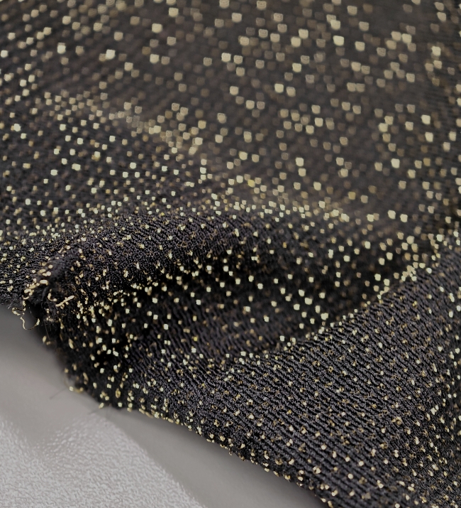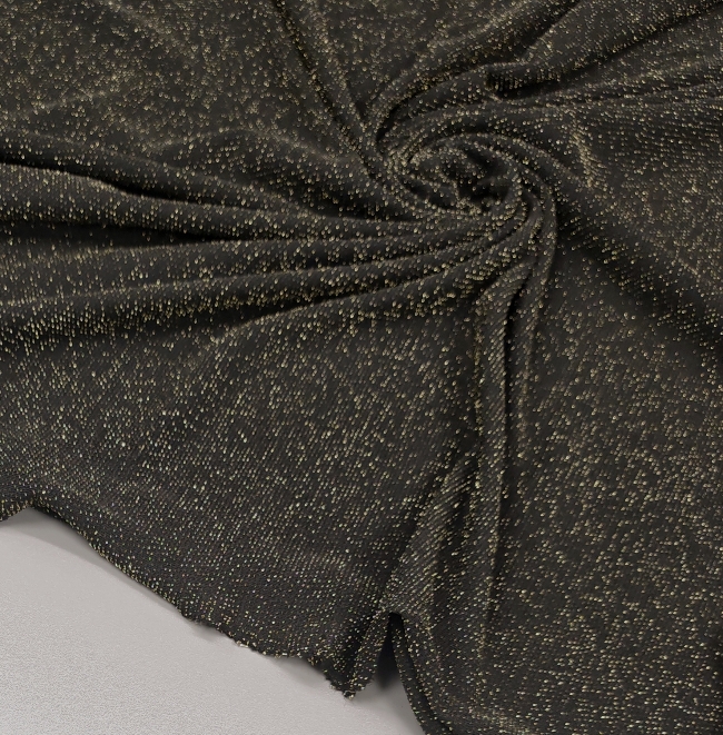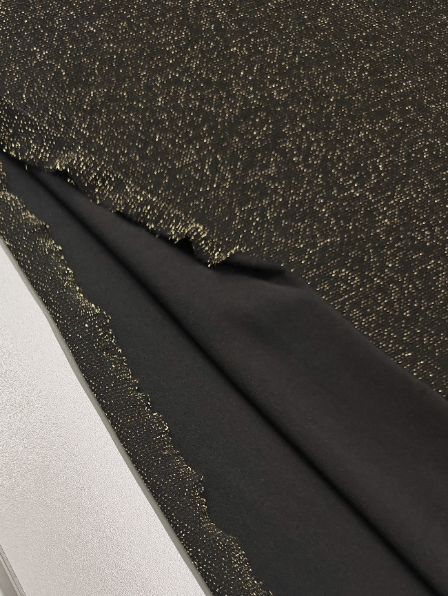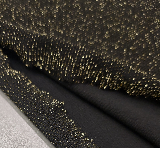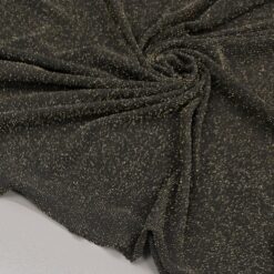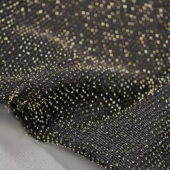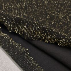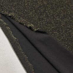 Ta črn elastičen jersey s prestižnim starozlatim sijajem je popolna izbira, ko želiš ustvariti elegantna, udobna in hkrati izrazito moderna oblačila. Material je mehak, lepo pada in se odlično prilega telesu, zato se posebej dobro obnese pri kosih, kjer želiš kombinacijo udobja in glamuroznega učinka.
