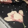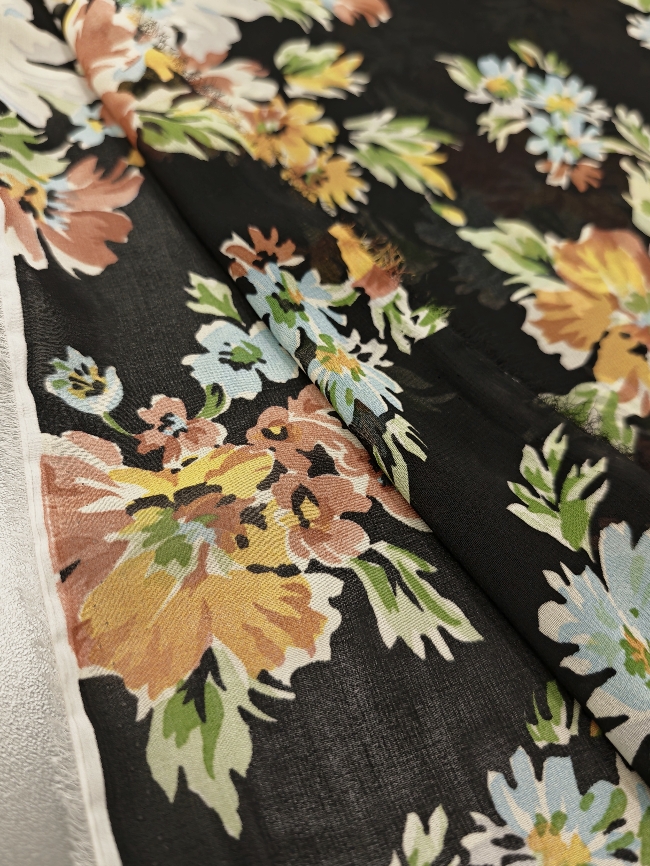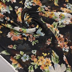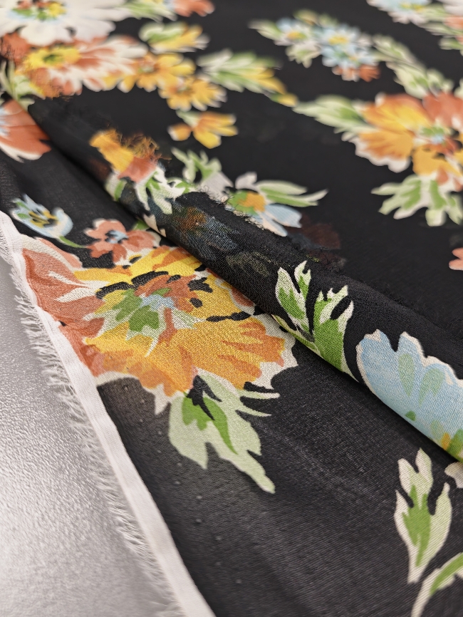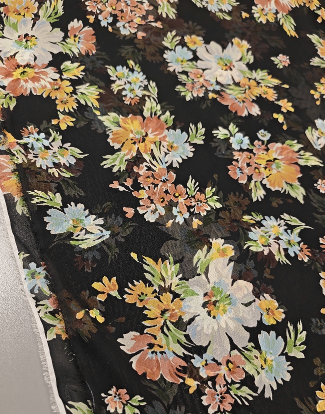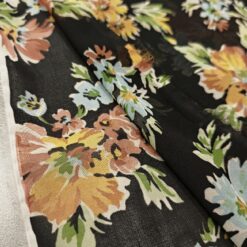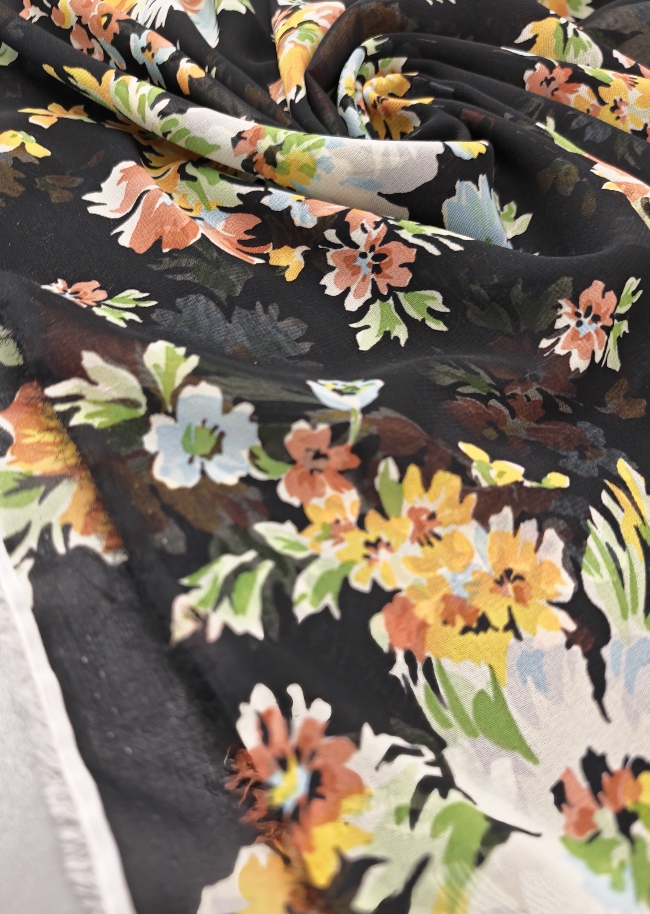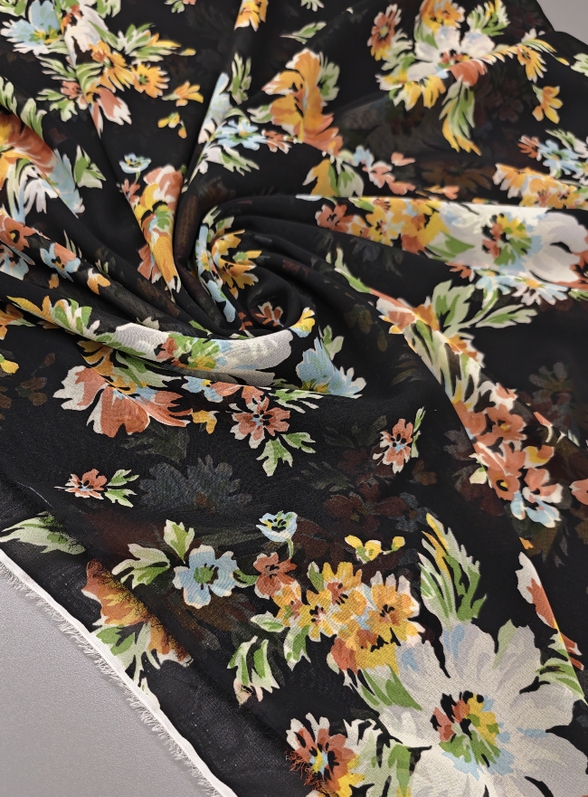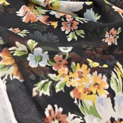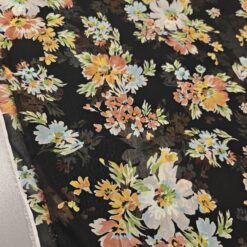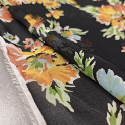 Ta čudovit žoržet v črni osnovi z barvitimi cvetličnimi motivi prinaša pravo mero elegance in svežine. Izjemno lahek (67 g/m²) in zračen material je popolna izbira za poletne bluze, obleke, krila ali modne šale. Nežen padec tkanine omogoča, da oblačila lepo sledijo gibanju telesa, cvetlični vzorec pa prinaša živahnost in ženstven čar.