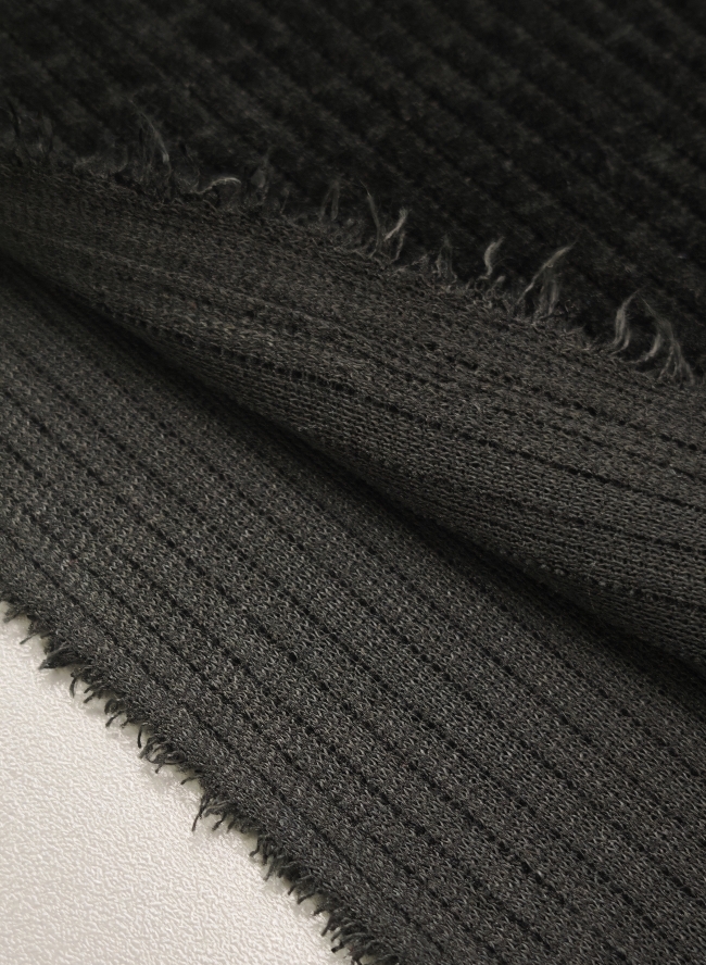 Črn rebrasti žamet je razkošna in prijetna tkanina, ki združuje toplino, mehkobo in rahlo elastičnost za popolno udobje. Njegova rebrasta struktura daje tkanini globino in eleganten videz, zaradi česar je idealna izbira za modne plašče, suknjiče, hlače ali krila, pa tudi za dekorativne projekte, kot so prevleke in blazine. Topel, poln in lepo padajoč žamet, ki vedno deluje prestižno – popolna izbira za hladnejše dni.