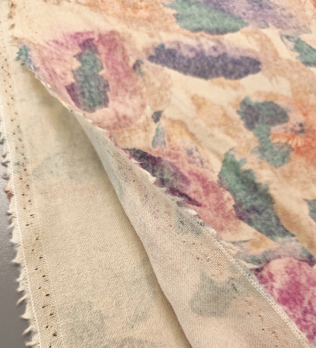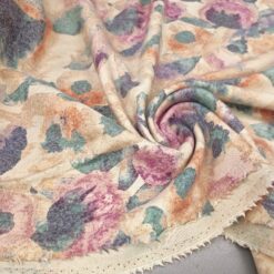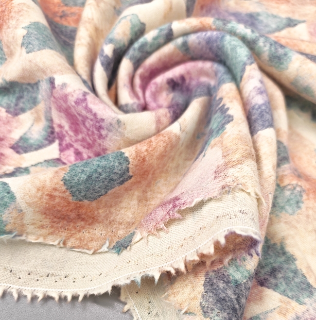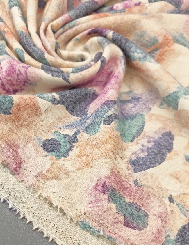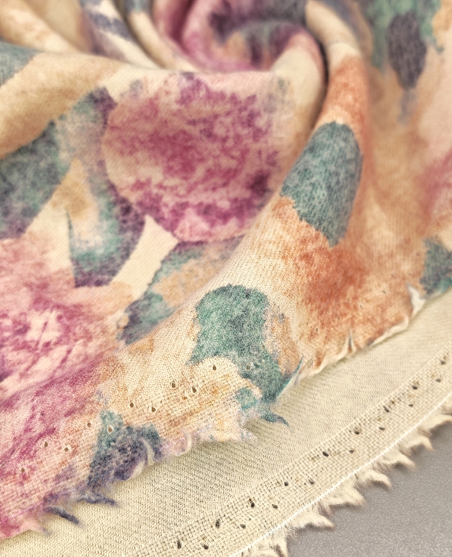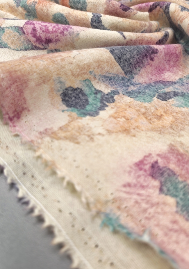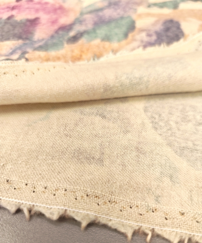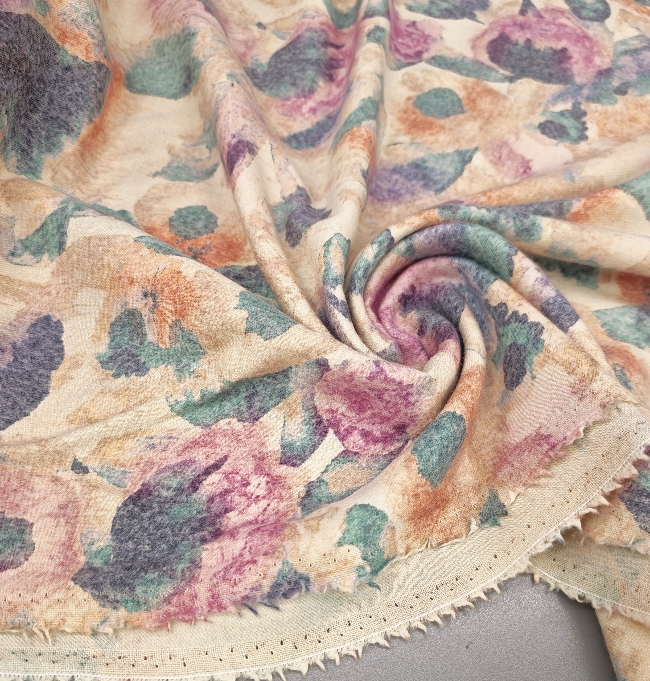 Kakovostna volnena mešanica s krem osnovo in cvetličnim akvarelnim digitalnim tiskom. Teža 290 g/m² je idealna za prehodna obdobja, zato je tkanina odlična za hlače, krila, obleke, suknjiče, lahke jakne in elegantne komplete.