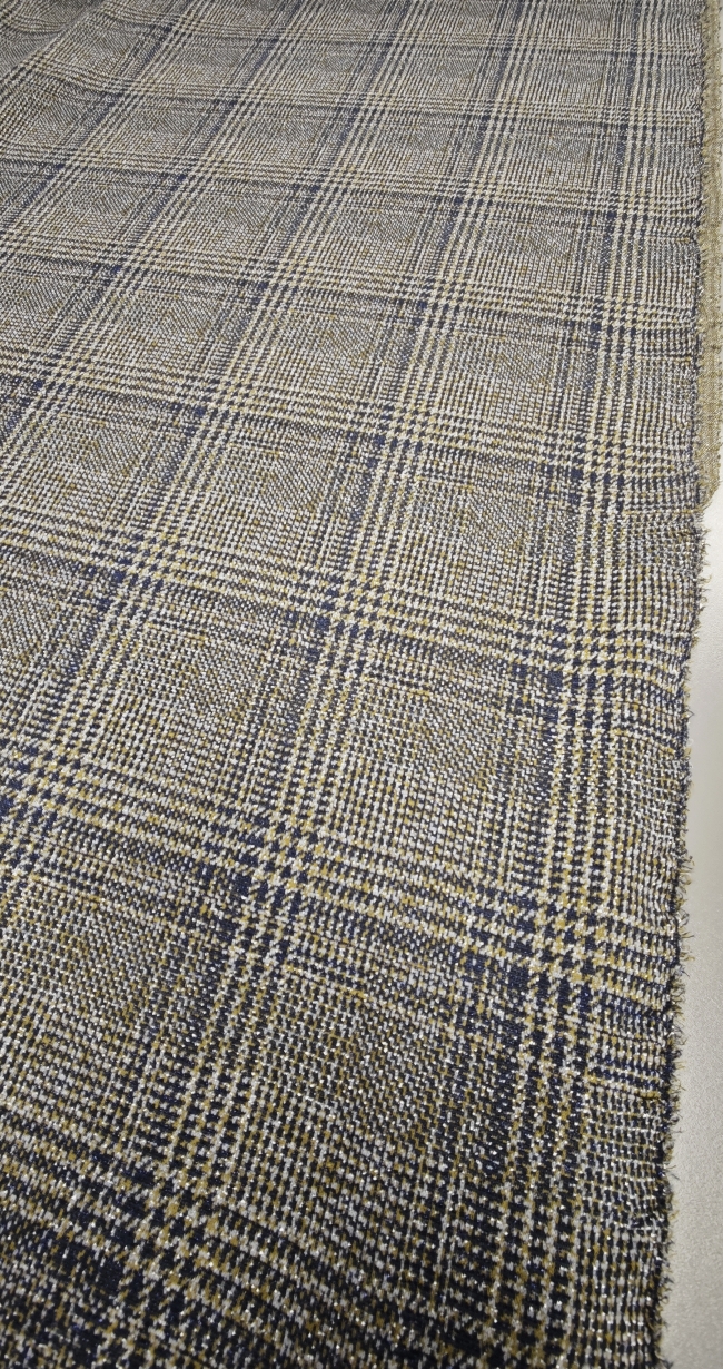 Elastičen jersey v modrem karo vzorcu s srebrnimi lurex nitmi je izjemno prijeten, raztegljiv in idealen za udobna oblačila. Material lepo pada, je mehak na koži in se pri nošenju popolnoma prilagaja telesu.