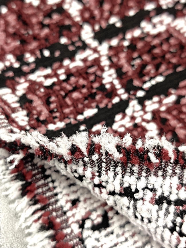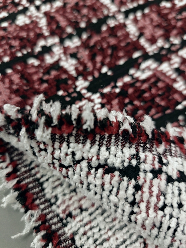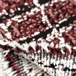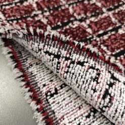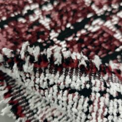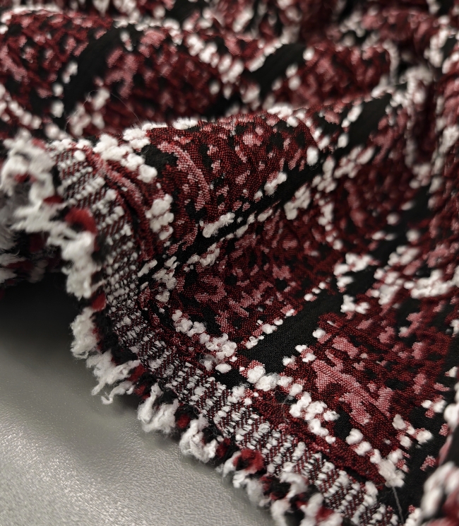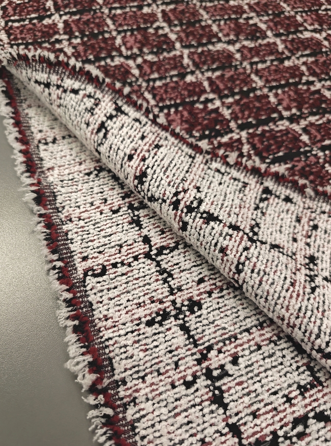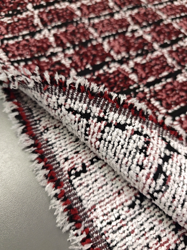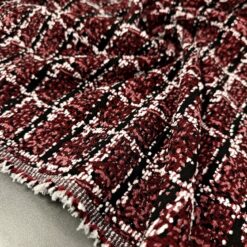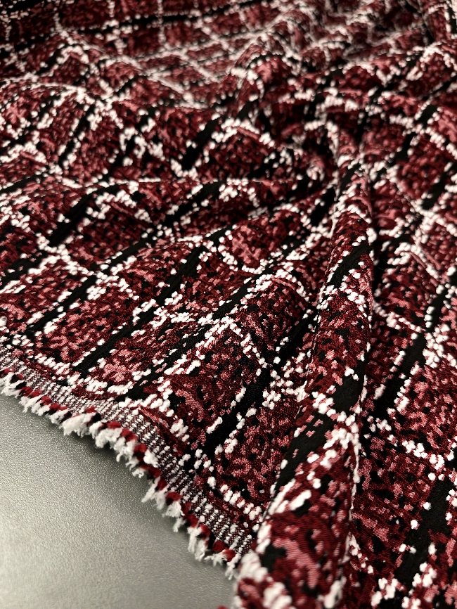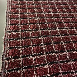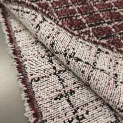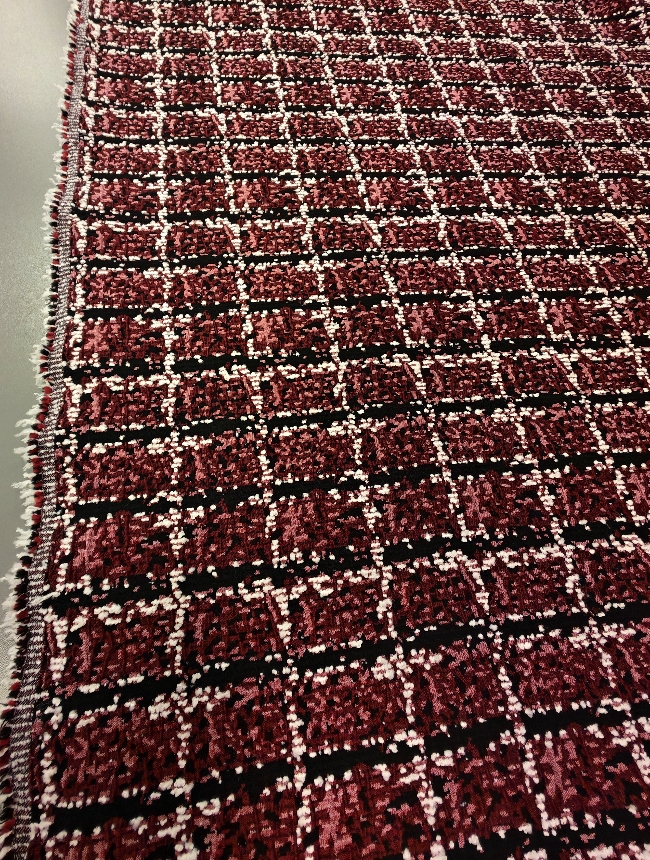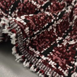 Mehka kostimska tkanina v bordo-črni kombinaciji s strukturirano površino, ki daje urejen, modno uporaben videz.