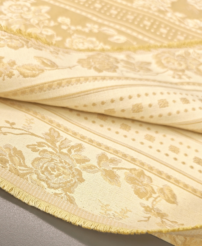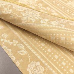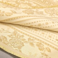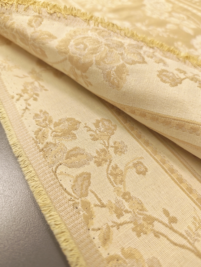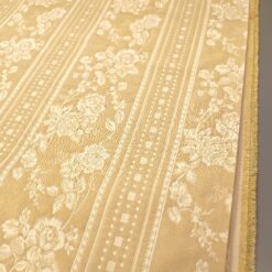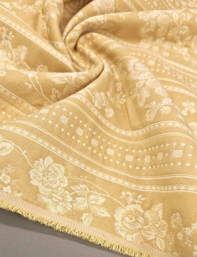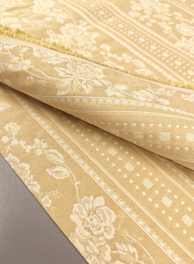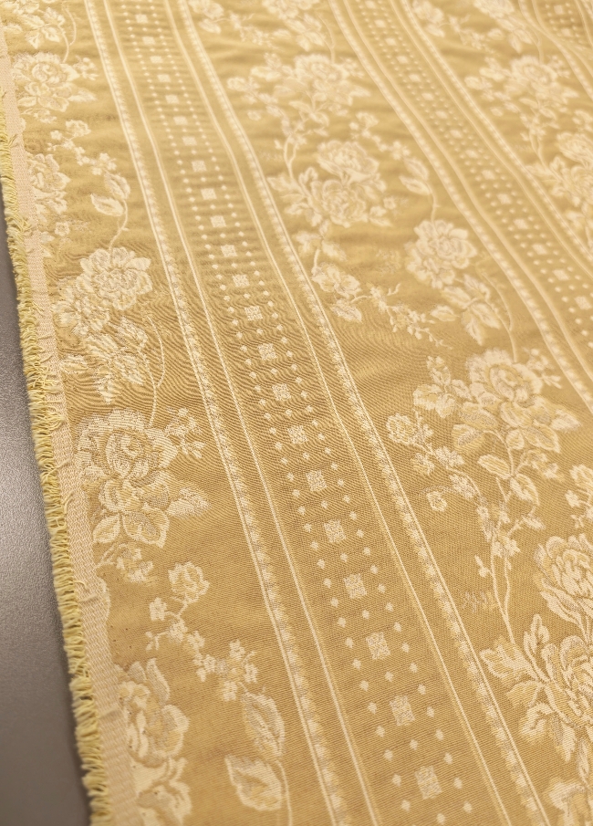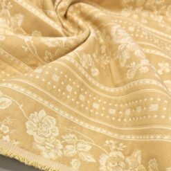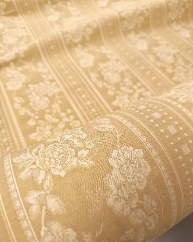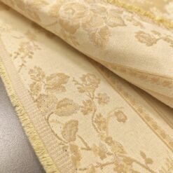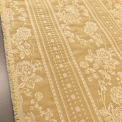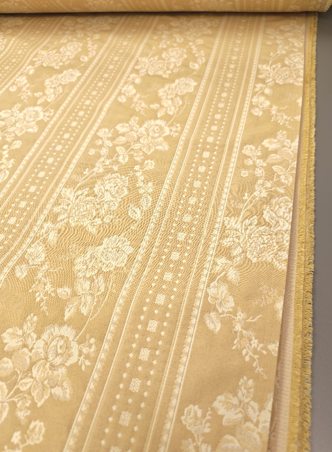 Močna dekorativna žakard tkanina z izrazitim baročnim cvetličnim motivom v zlati barvi. Obojestranska struktura omogoča uporabo z obeh strani, kar daje več možnosti pri šivanju. Tkanina je kompaktna, vizualno bogata in primerna za zavese, prte, okrasne prevleke, dekorativne dodatke ter pohištveno uporabo. Odličen izbor za klasične, elegantne in rustikalne ambiente, kjer pride do izraza vzorec in globina tkanja.