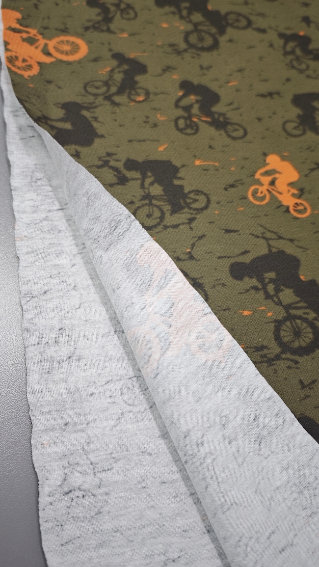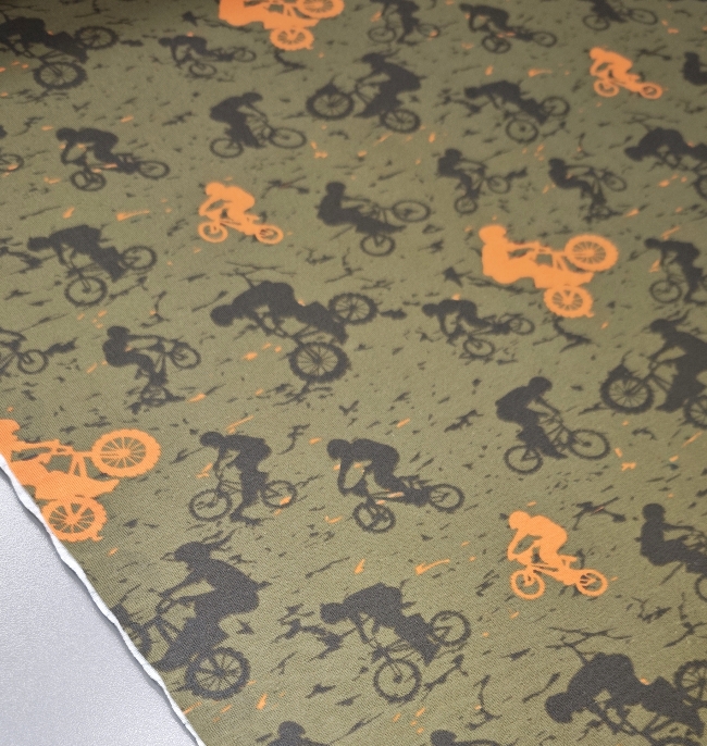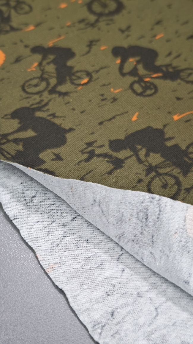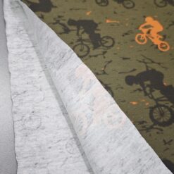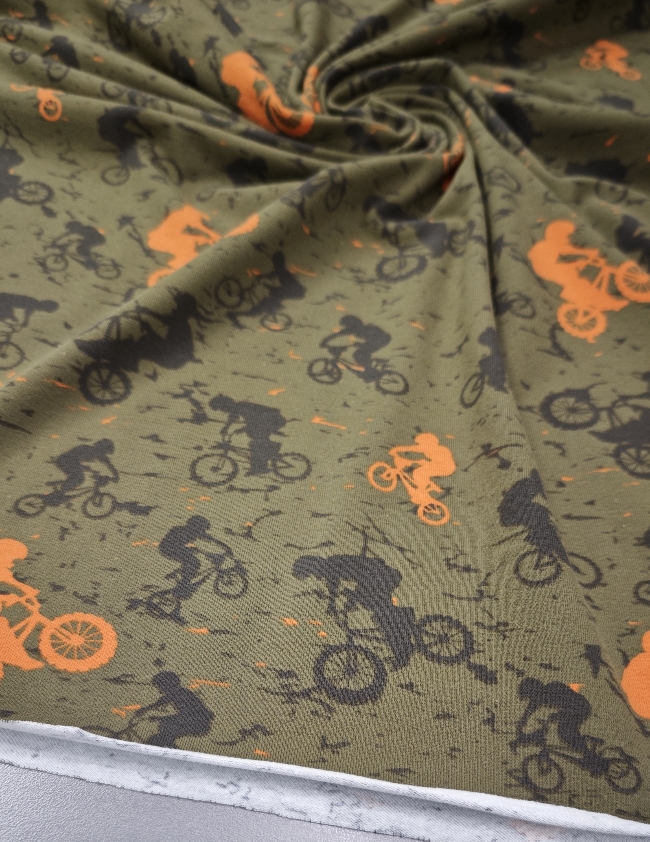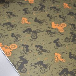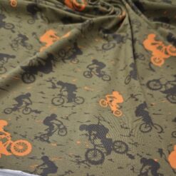 Ta mehak bombažni jersey je odlična izbira za fantovsko otroško oblačilo, kjer želiš združiti udobje, elastičnost in izrazit športni videz. Olivno zelena podlaga s črnimi in oranžnimi kolesarji daje tkanini energičen, dinamičen karakter – popoln za vse male ljubitelje gibanja in koles.