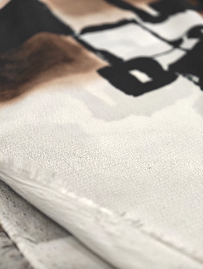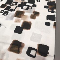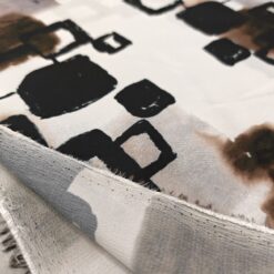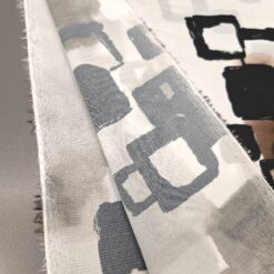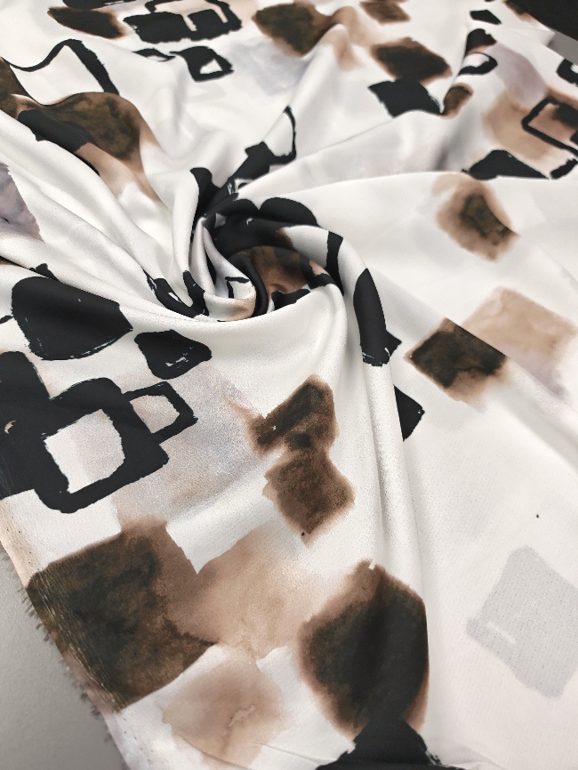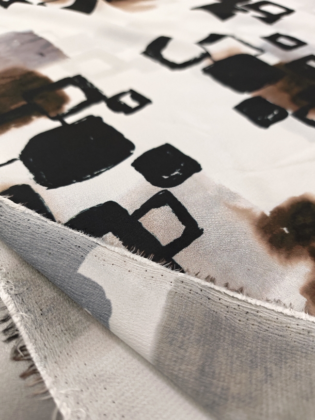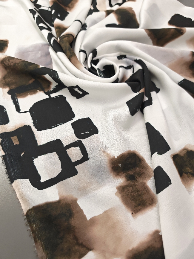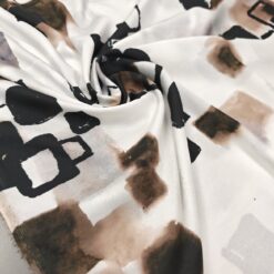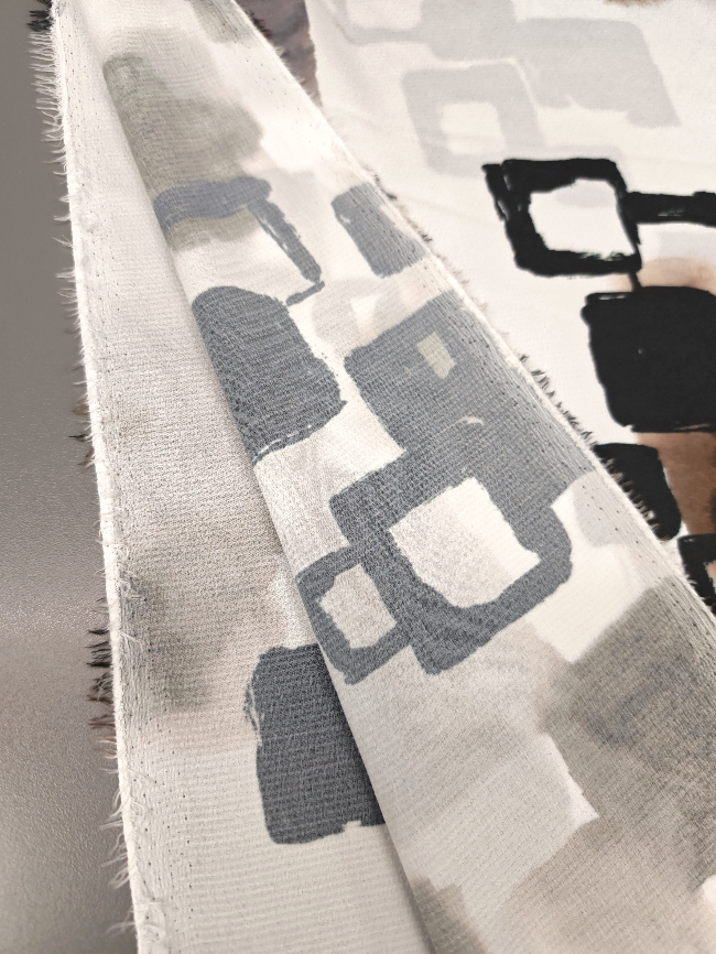 Lahka, zračna žoržet tkanina v nežnem belo-krem tonu z izrazitim abstraktnim vzorcem v črni in rjavi barvi. Material je mehak, lepo pada in deluje elegantno, zato je primeren za obleke, bluze, krila, tunike ter lahkotne šale. Vzorec doda oblačilu poseben poudarek, tkanina pa omogoča udobno nošenje v toplejših dneh in plastenje v prehodnih sezonah. Odlična izbira za ženstvene, sproščene kroje z modernim videzom.