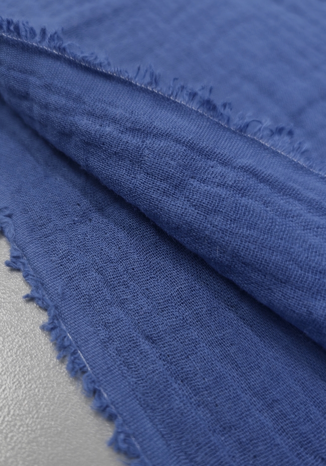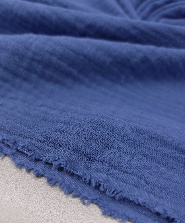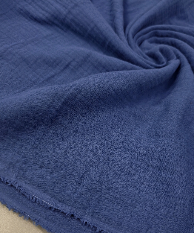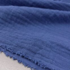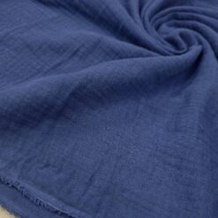 Lahka, zračna in mehka dvoslojna tetra tkanina v jeans modri barvi. Dve tanki plasti sta nežno spojeni, zato je material polnejši, a še vedno prijetno mehak in naraven na dotik. Površina ima značilno rahlo valovito strukturo, ki daje sproščen, vsakodnevni videz.