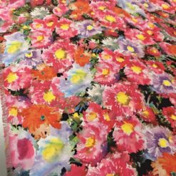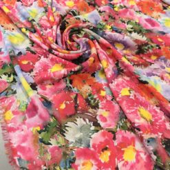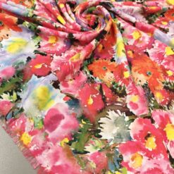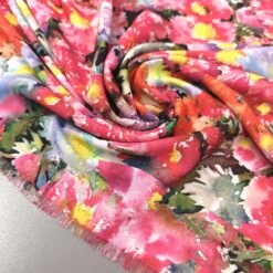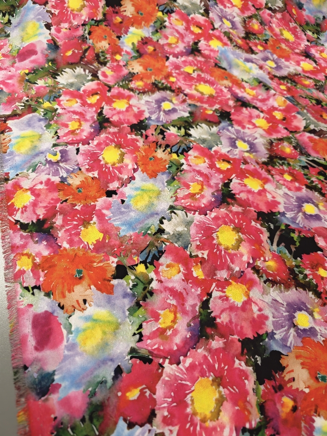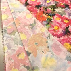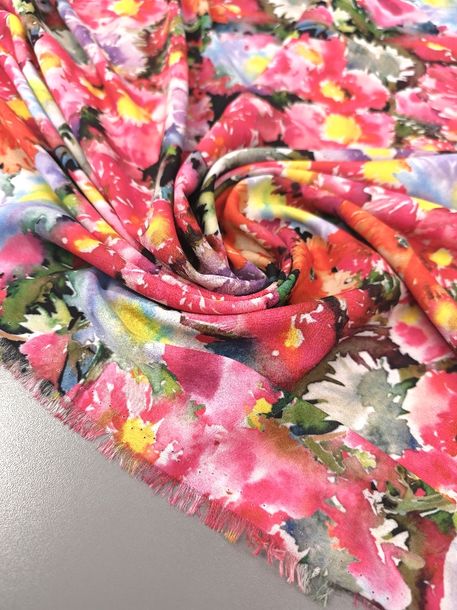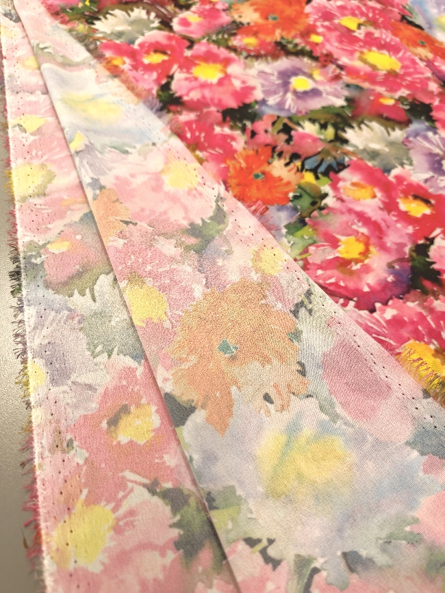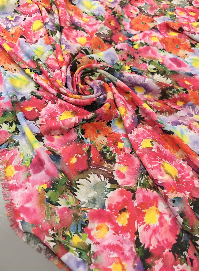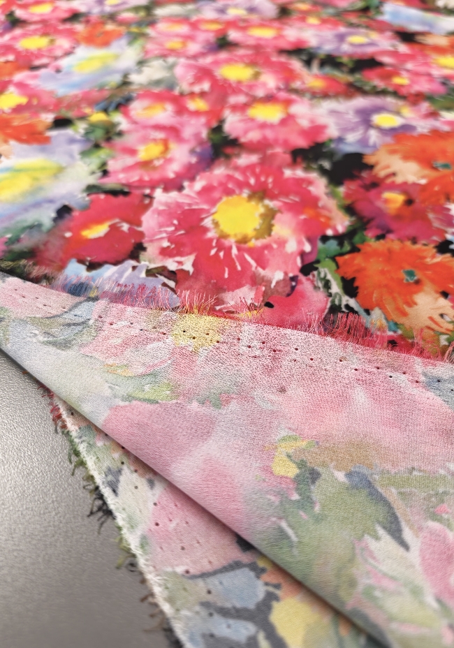Neprosojen žoržet z barvnim potiskom in rahlo zrnato strukturo. Lahka, zračna tkanina z lepim padcem, primerna za oblačila, kjer je pomembna pokritost brez prosojnosti.