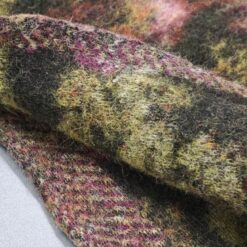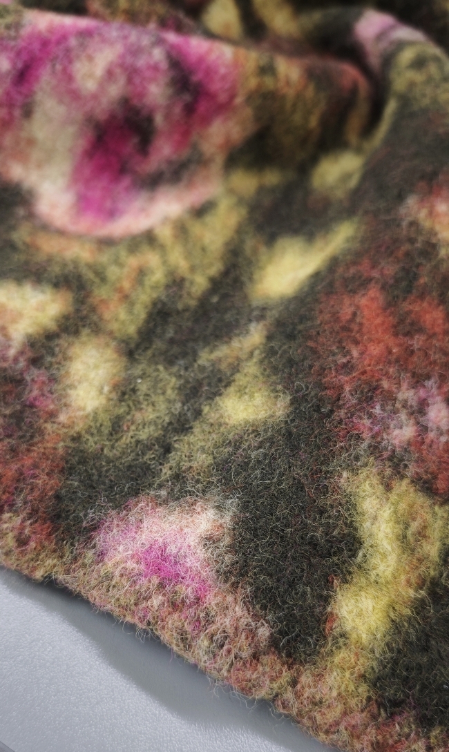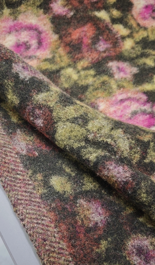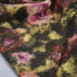 Prava paša za oči in dotik – kuhana volna Cvetni šepet združuje igrive odtenke zelene in pink v cvetličnem vzorcu, ki prinaša svežino in toplino v vsak kos oblačila. Material je mehak, hkrati pa dovolj kompakten, da lepo drži obliko, zato je odlična izbira za ustvarjanje unikatnih modnih kosov.