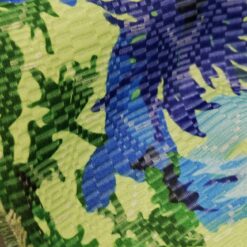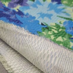 Žakardna tkanina s cvetličnim vzorcem v prelivajočih se modro-zelenih odtenkih. Material je primeren predvsem za oblačilno rabo, kjer pride do izraza struktura žakarda in stabilnost tkanine. Uporablja se za jakne, plašče, kostime, krila in obleke z obliko. Zaradi obstojnosti in videza je uporabna tudi za dekorativne namene, kot so blazine, pregrinjala ali poudarki v interierju.