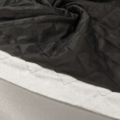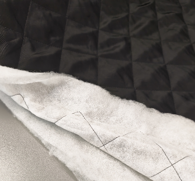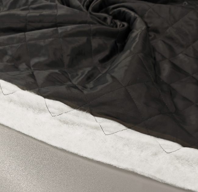 Lahko črno prešito blago, primerno za šivanje prehodnih jaken, telovnikov in podlog za plašče. Prešita struktura daje materialu rahlo toploto in lep, urejen videz.