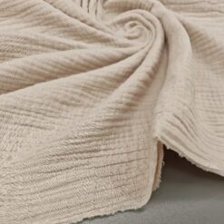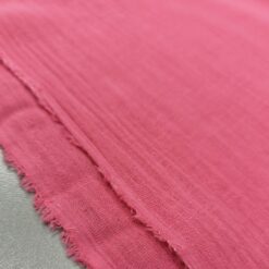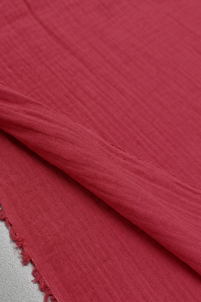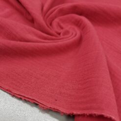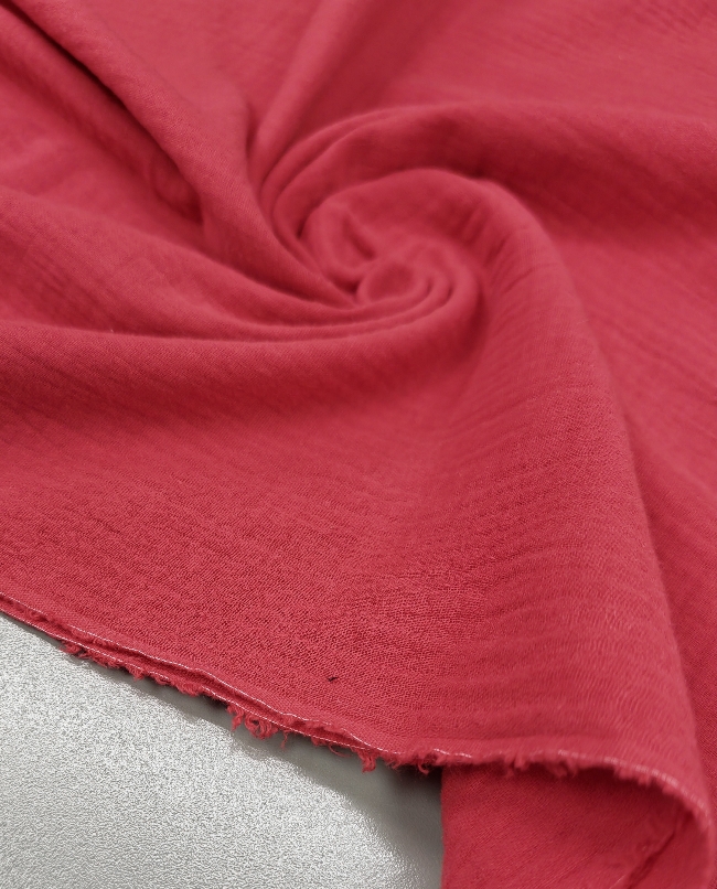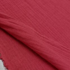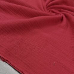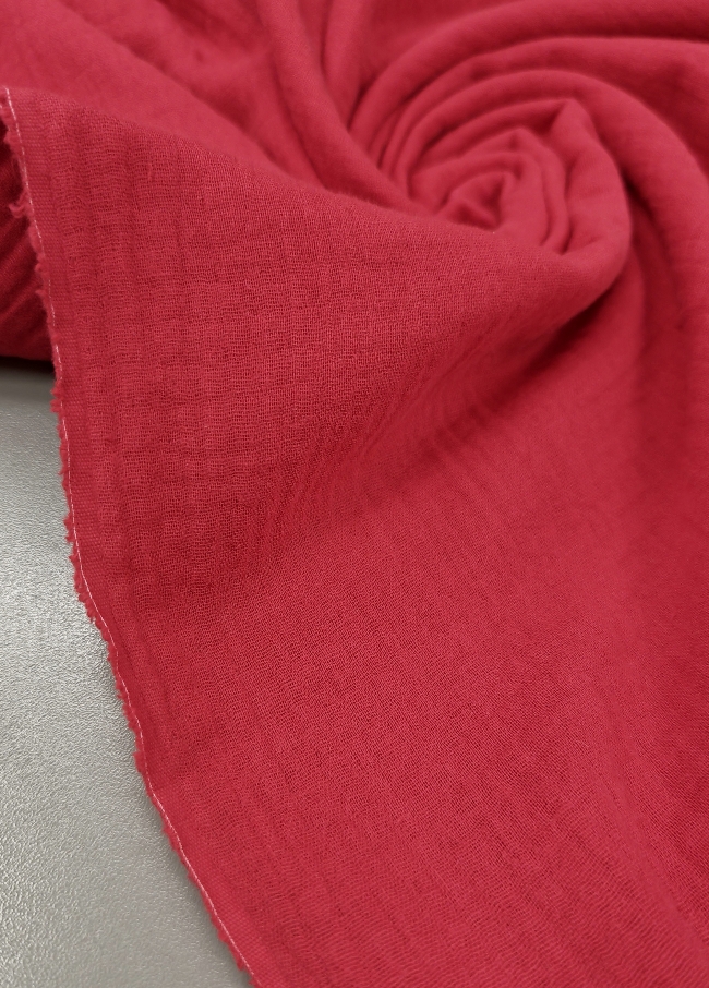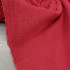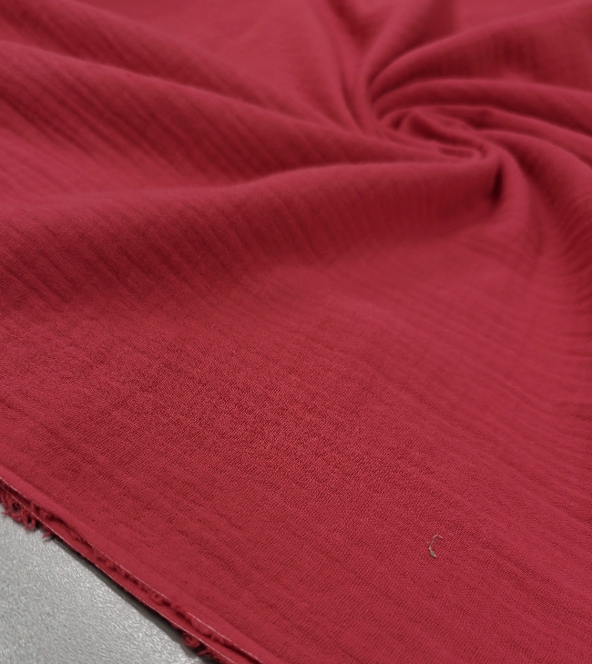 Dvoslojna tetra tkanina v močni rdeči barvi je mehka, zračna in prijetna na dotik. Zaradi dvojne strukture lepo pade, ni prosojna in je zelo udobna za nošenje. Površina je rahlo strukturirana, naravno nagubana in ne zahteva likanja.