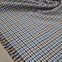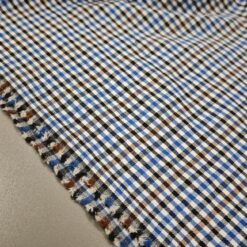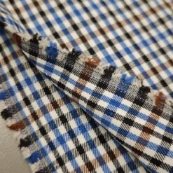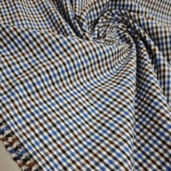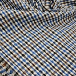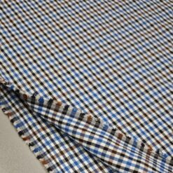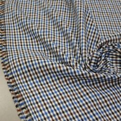 Ta rjavo-modra tkanina v klasičnem karo vzorcu združuje eleganco in udobje. Rahla elastičnost (190 g/m²) poskrbi, da se material lepo prilagodi telesu in zagotavlja prijetno nošenje.
