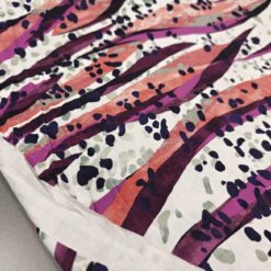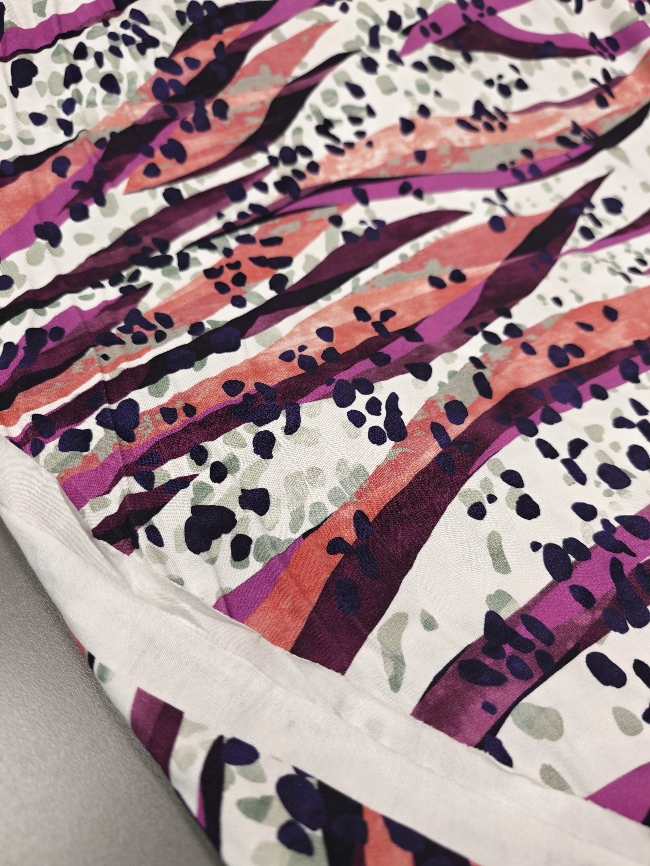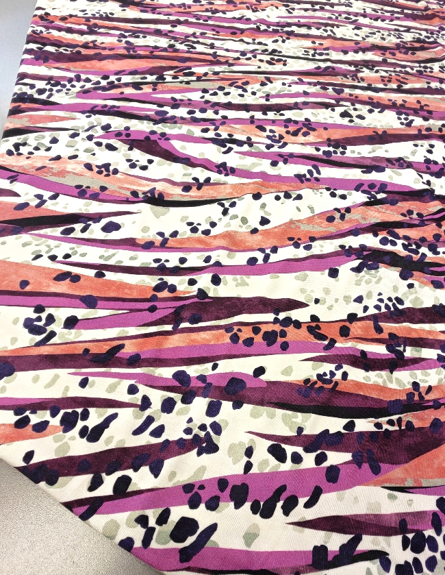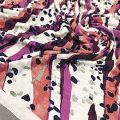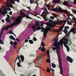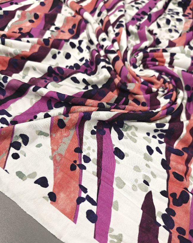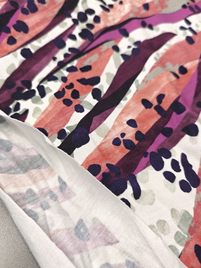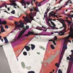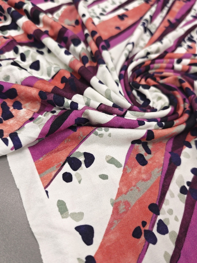 Mehak bombažni jersey v roza-koralni barvi z igrivim abstraktnim vzorcem pik in črt. Tkanina je prijetna na dotik, rahlo elastična in zelo udobna za nošenje. Vzorec daje materialu živahen in moderen videz, zato je odlična izbira za vsakodnevna oblačila.