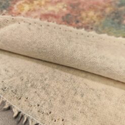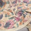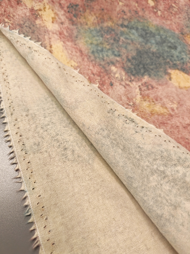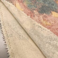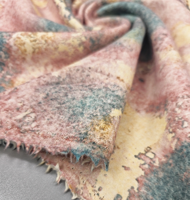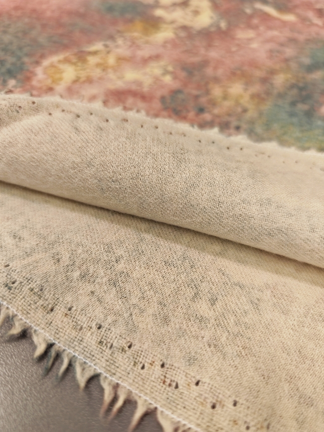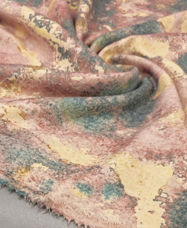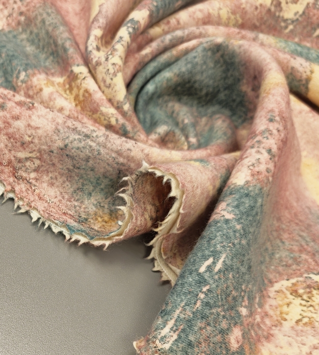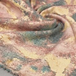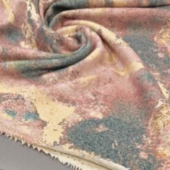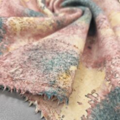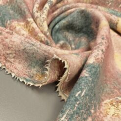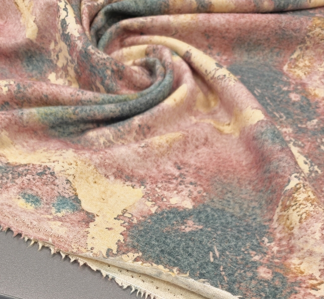 Lahka oblačilna tkanina z akvarelnim digitalnim tiskom v roza in turkiznih tonih. Volnena mešanica daje prijeten naraven občutek in rahlo toplino, poliester pa doda trpežnost in stabilnost.