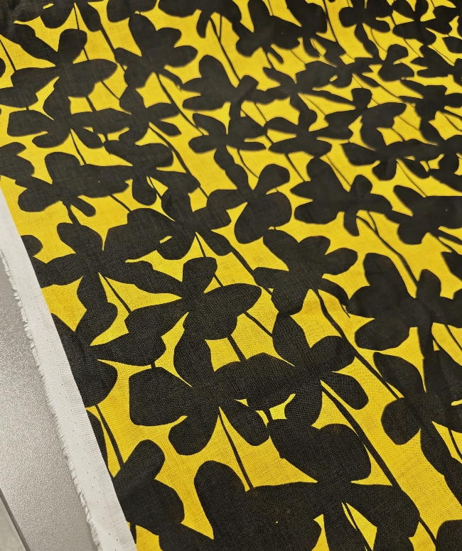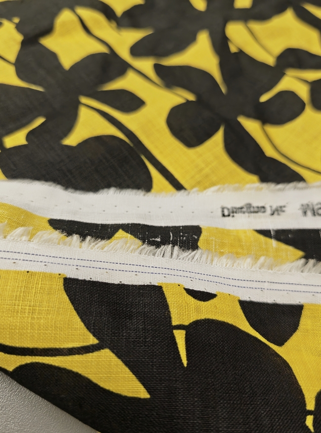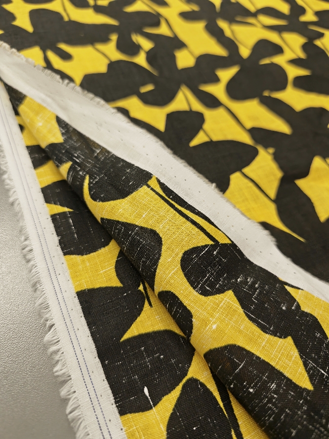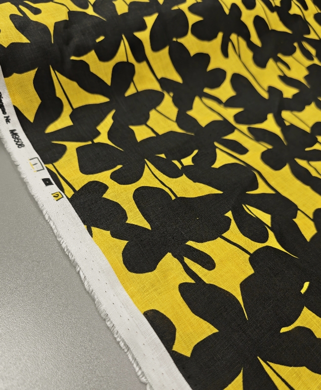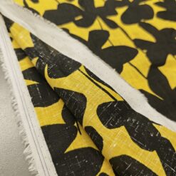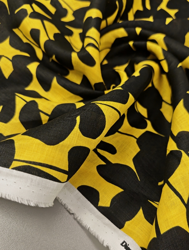 Lahka bombažno-lanena mešanica z izrazitim črnim listnim vzorcem na rumeni podlagi. Naraven otip, rahlo strukturirana površina in dobra zračnost – idealna za tople dni.