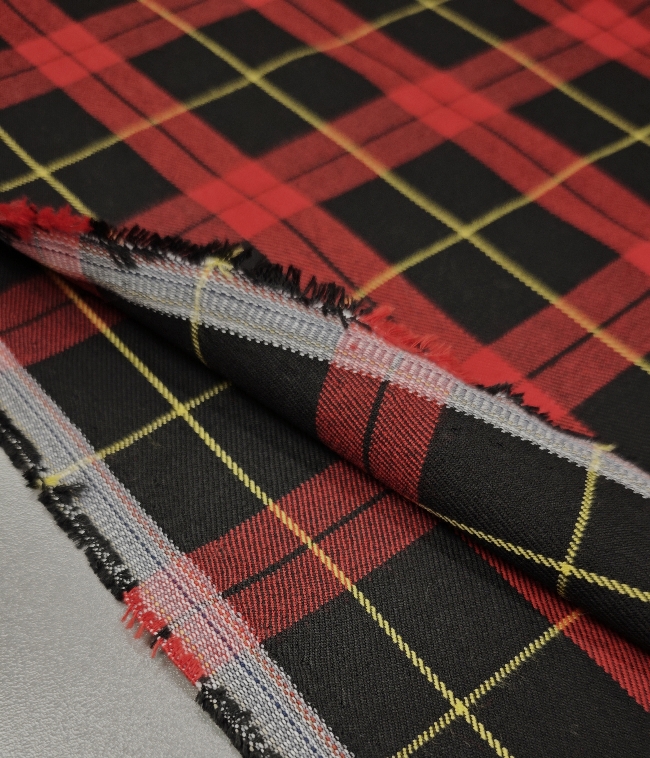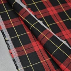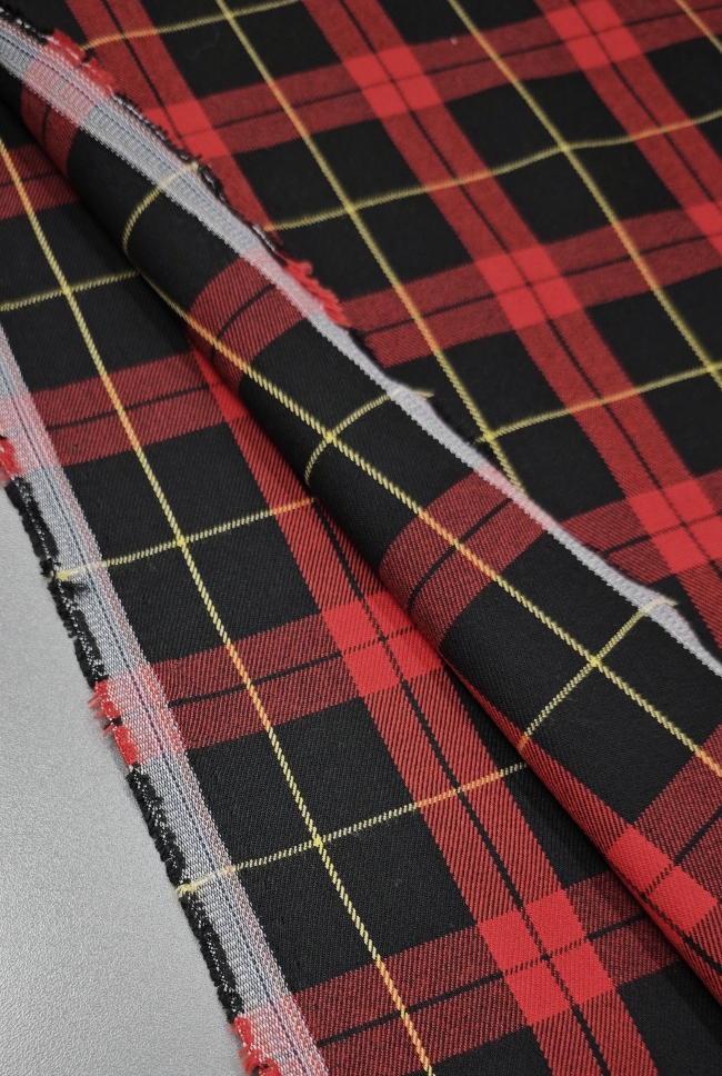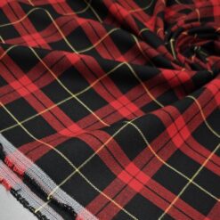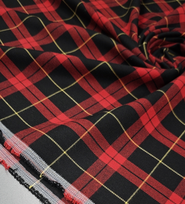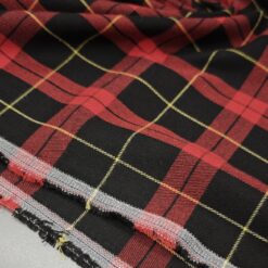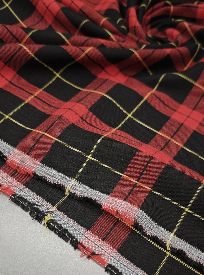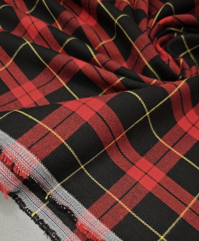 Ta modni škotski karo v klasični rdeče-črni kombinaciji z nežnim rumenim poudarkom prinaša pridih elegance in topline v vsako garderobo. Blago je rahlo elastično, kar zagotavlja udobje in lepo prileganje, medtem ko sestava diolen (mešanica volne in poliestra) poskrbi za prijetno mehkobo, obstojnost in manjšo mečkljivost.