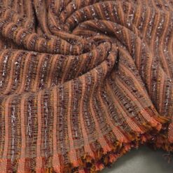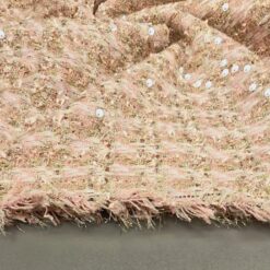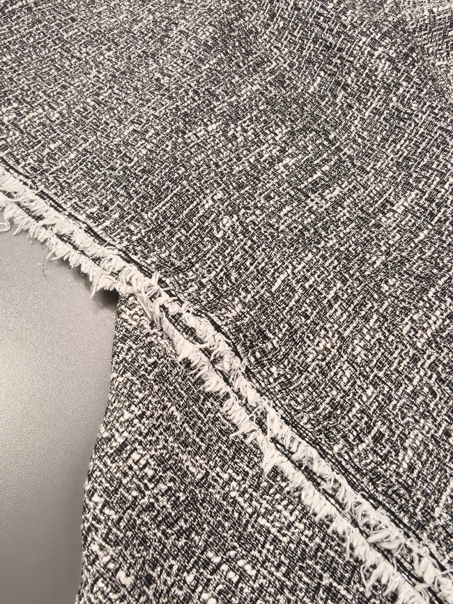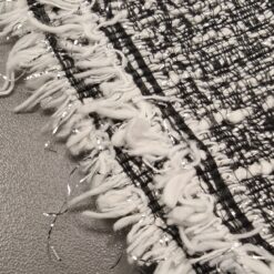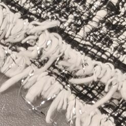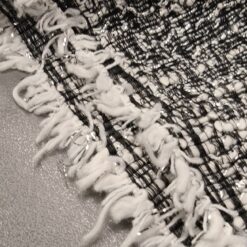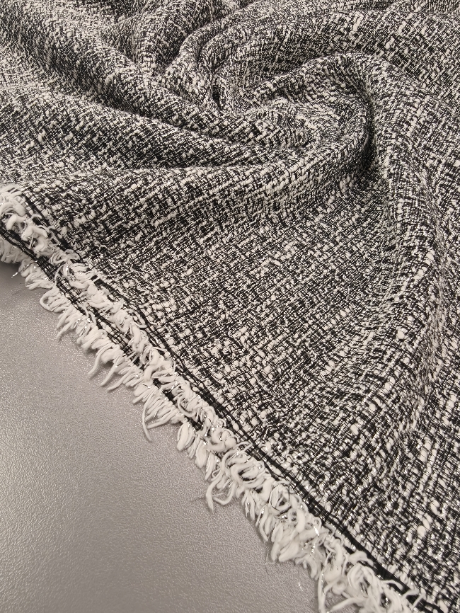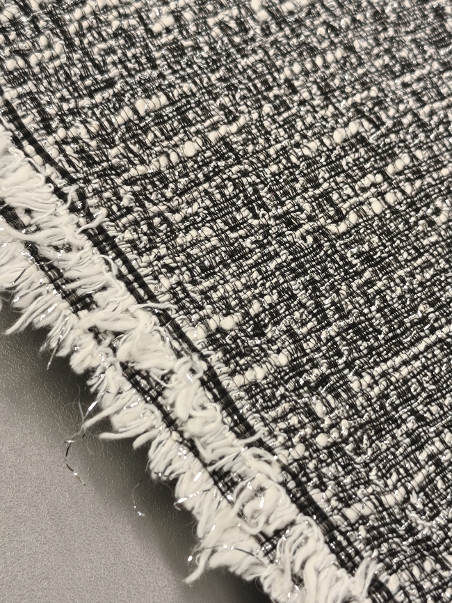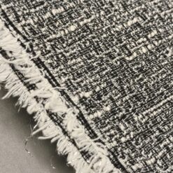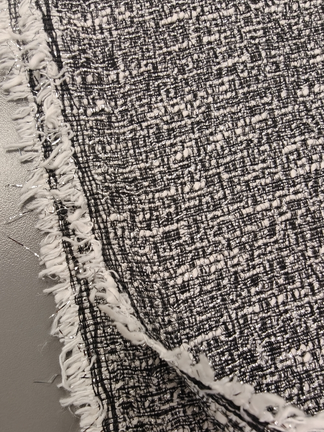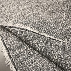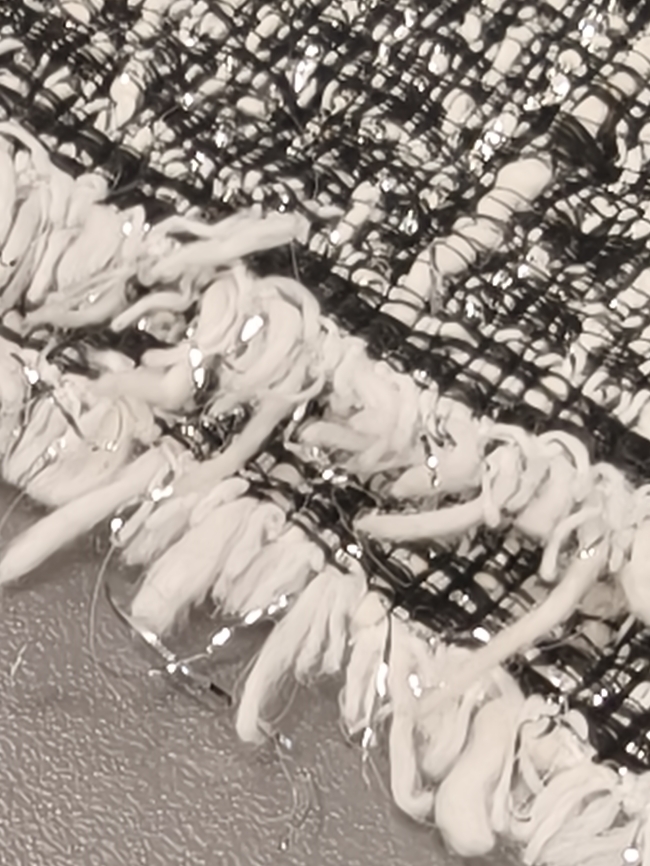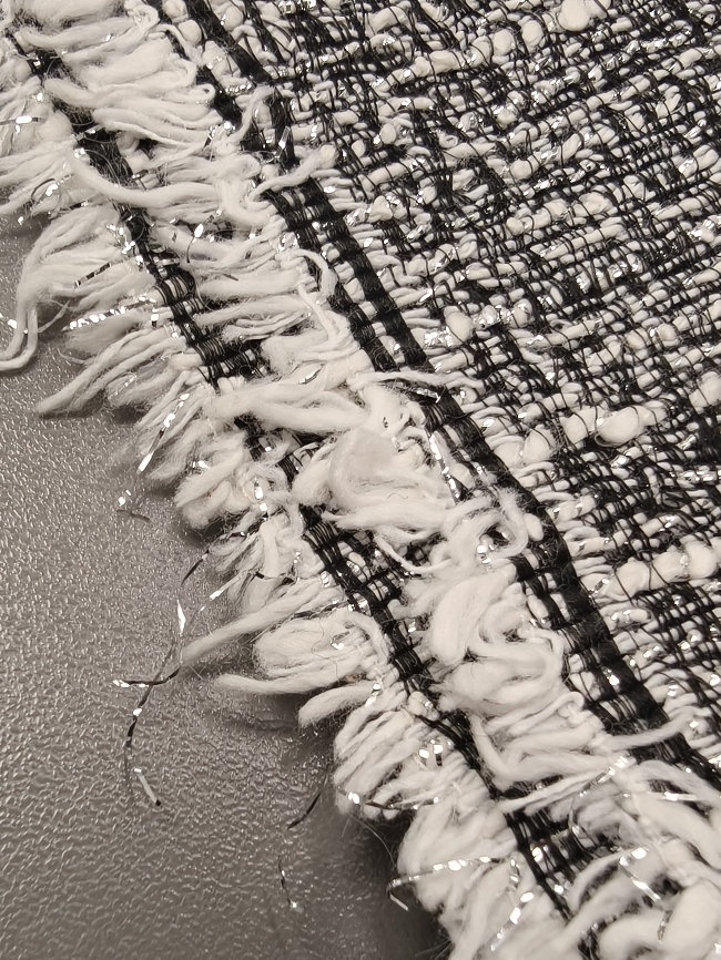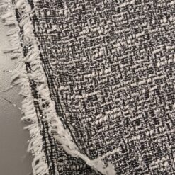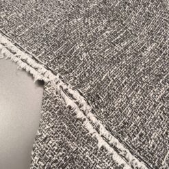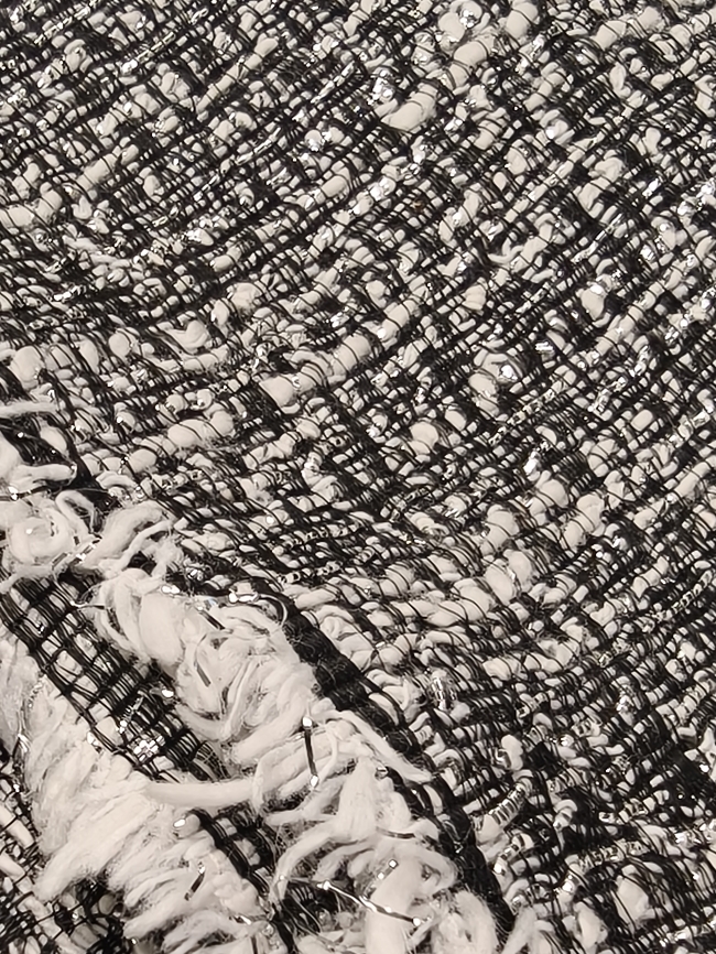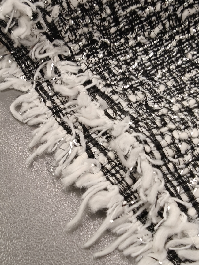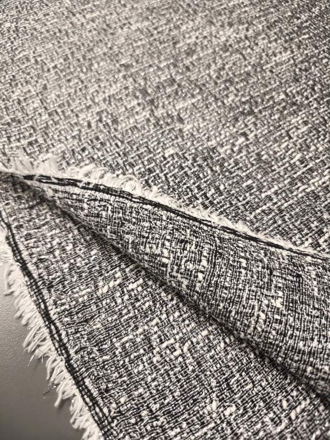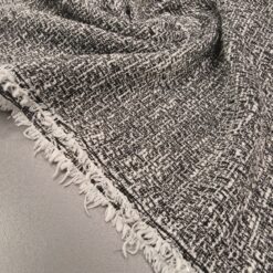 ✨ Ta prestižna bouclé tkanina v elegantnem srebrno-sivem odtenku s subtilnim leskom kovinske nitke je popolna izbira za modne suknjiče, kostime ali elegantne plaščke. Tkanina je srednje teže (170 g/m²), mehka na otip in lepo drži obliko, kar omogoča profesionalen videz končnega izdelka.Je lahka.