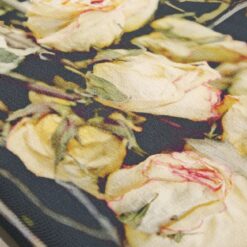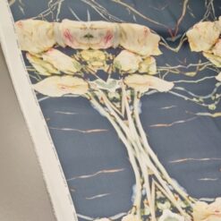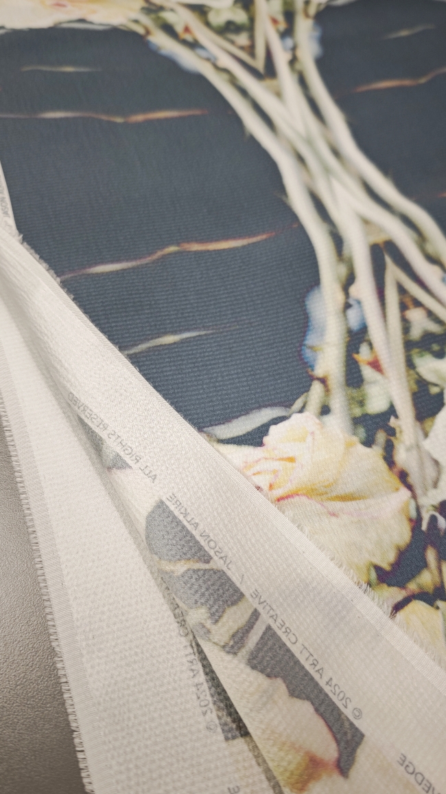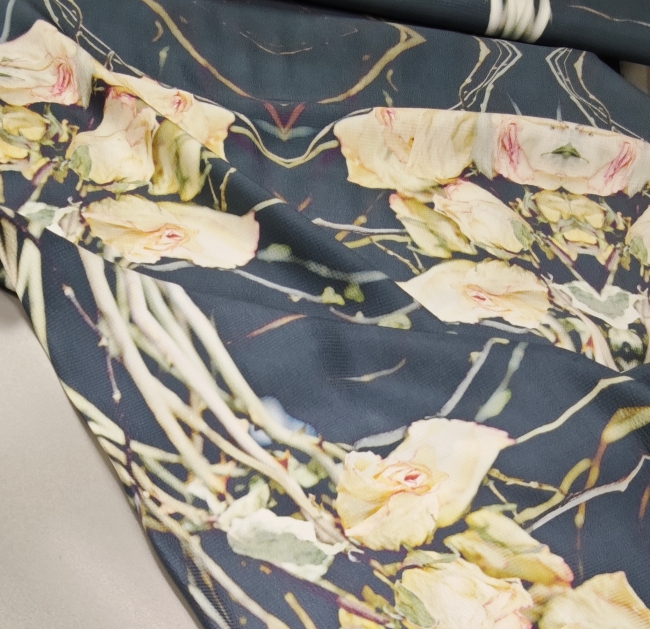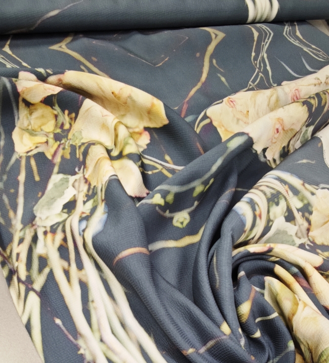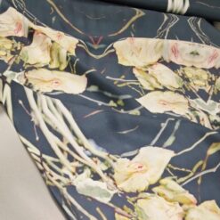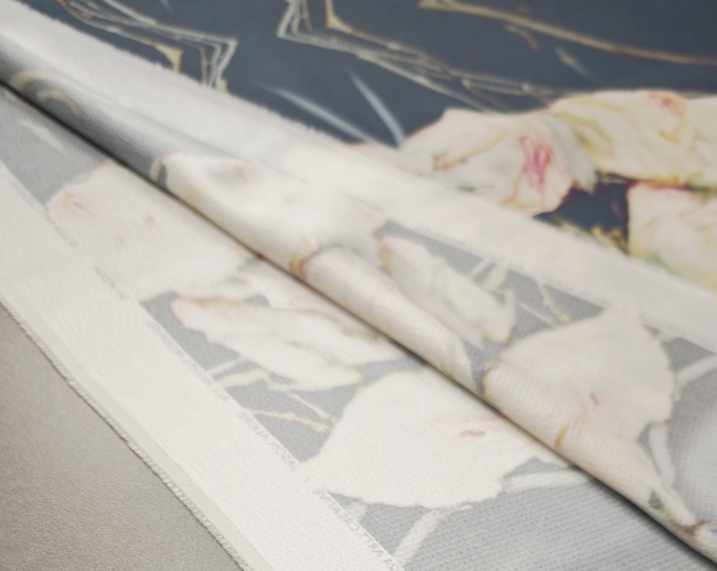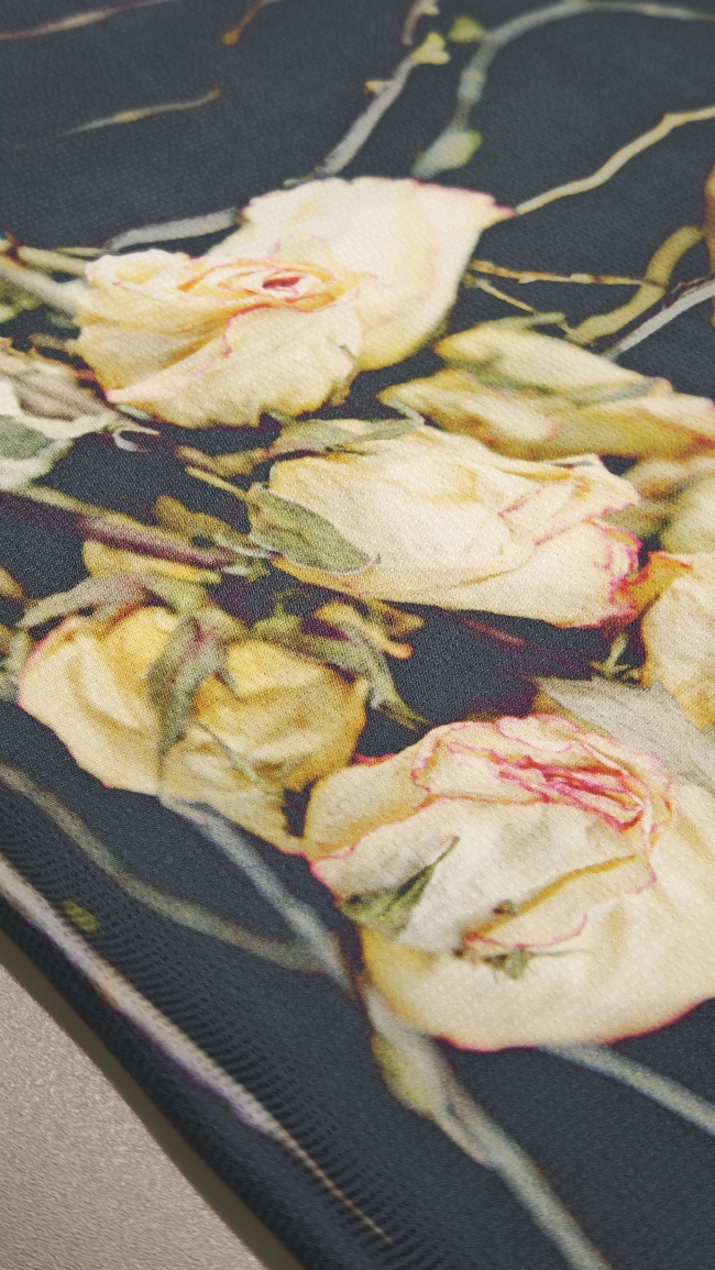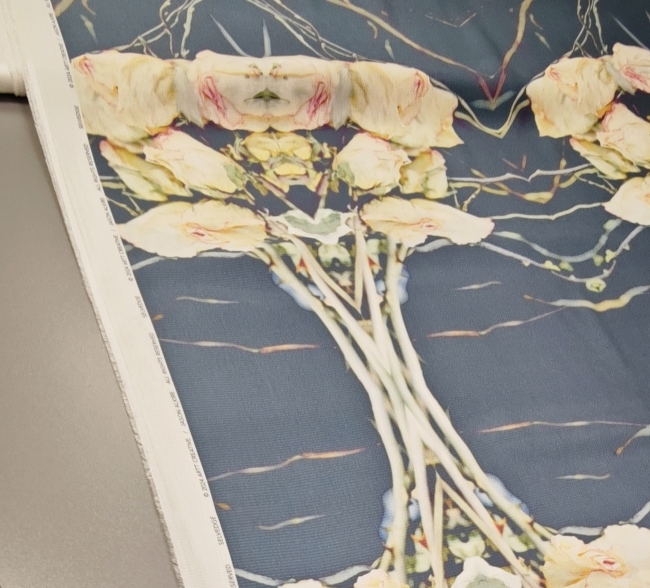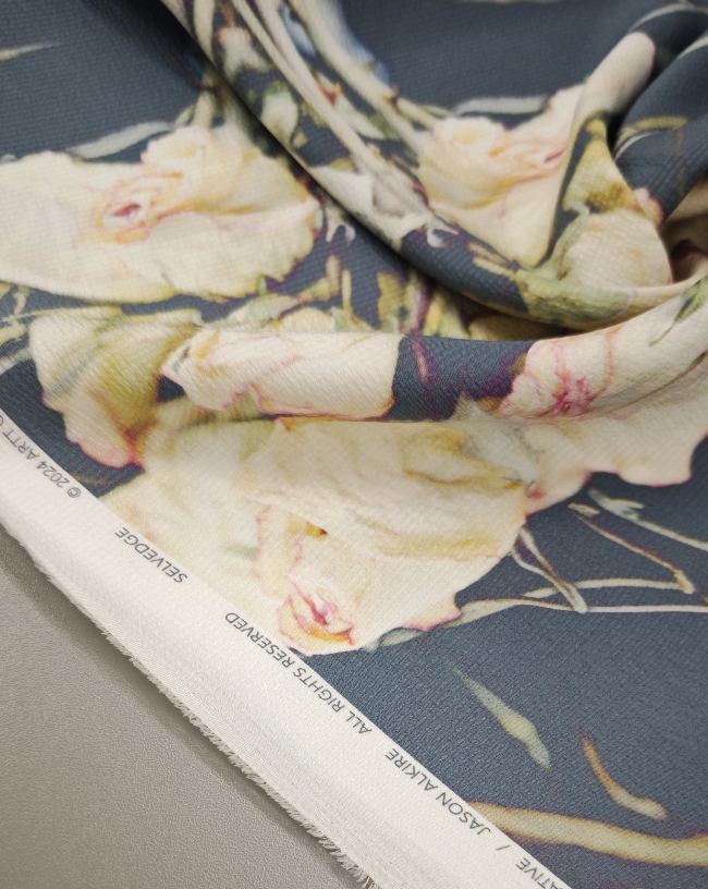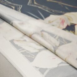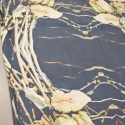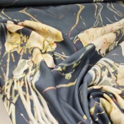 Naravna svilena tkanina z gladko površino in enakomernim, umirjenim sijajem. Material je lahek, mehak in tekoč, z zelo lepim padcem, ki daje oblačilom urejen in eleganten videz. Svila se naravno prilagaja gibanju in ne deluje togo.