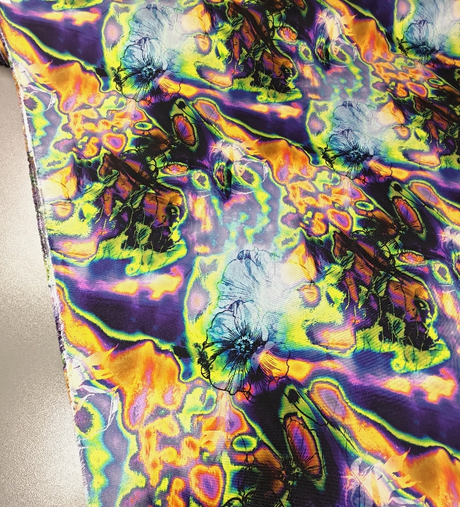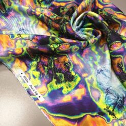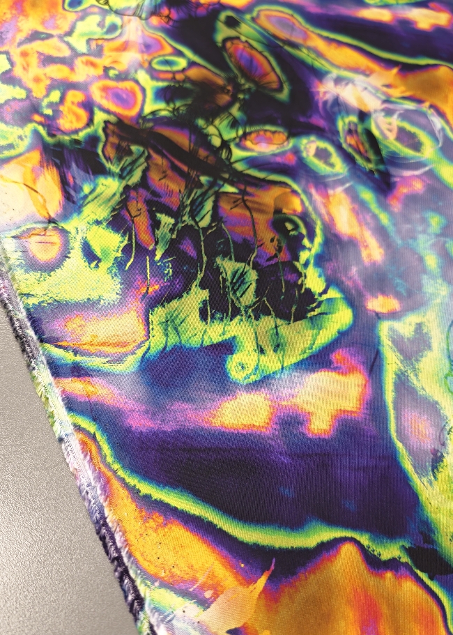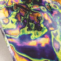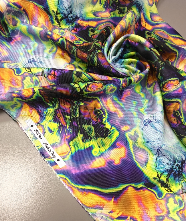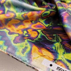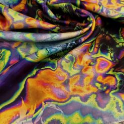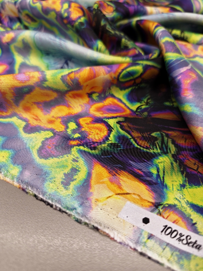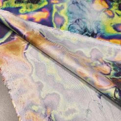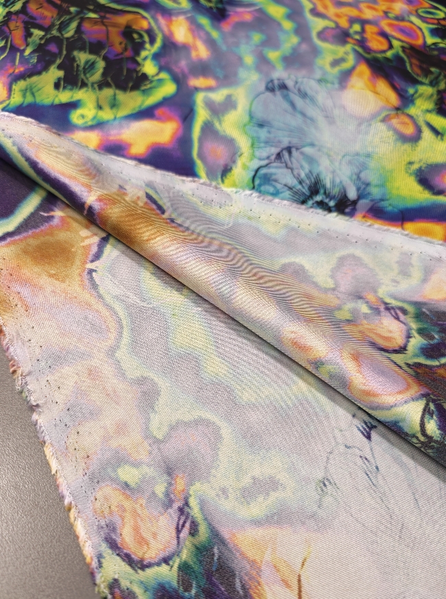 Elegantna satenirana svila z gladkim, sijočim videzom in izrazitim fantazijskim vzorcem v vijoličnih, zelenih in turkiznih tonih. Barve se lepo prelivajo in ustvarjajo bogat, modno izstopajoč videz.