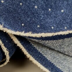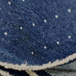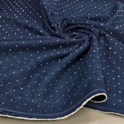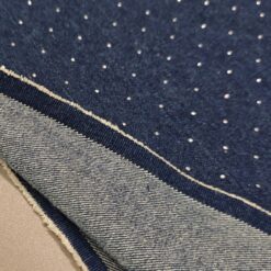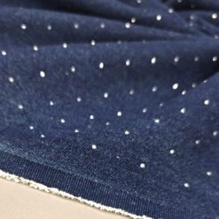 Temno moder jeans z drobnimi srebrnimi kristalčki, ki dajejo materialu diskreten sijaj. Trpežen bombažni jeans, primeren za šivanje modnih hlač, jaken, kril in oblek. Kristalčki ustvarijo eleganten, modno izstopajoč videz, zato je tkanina odlična izbira za posebne in atraktivne modele iz jeansa.