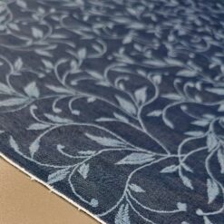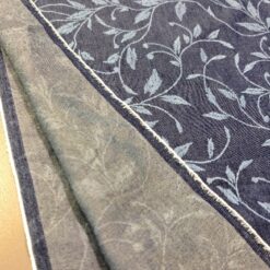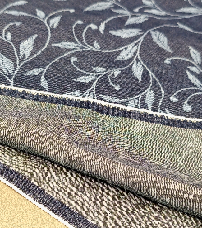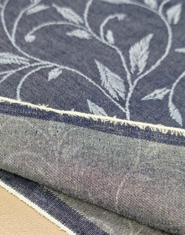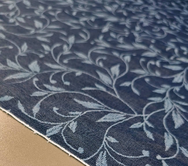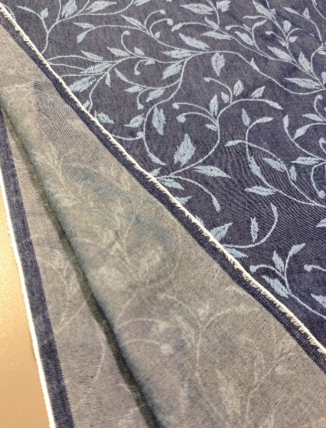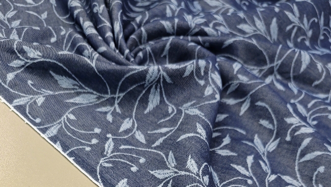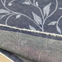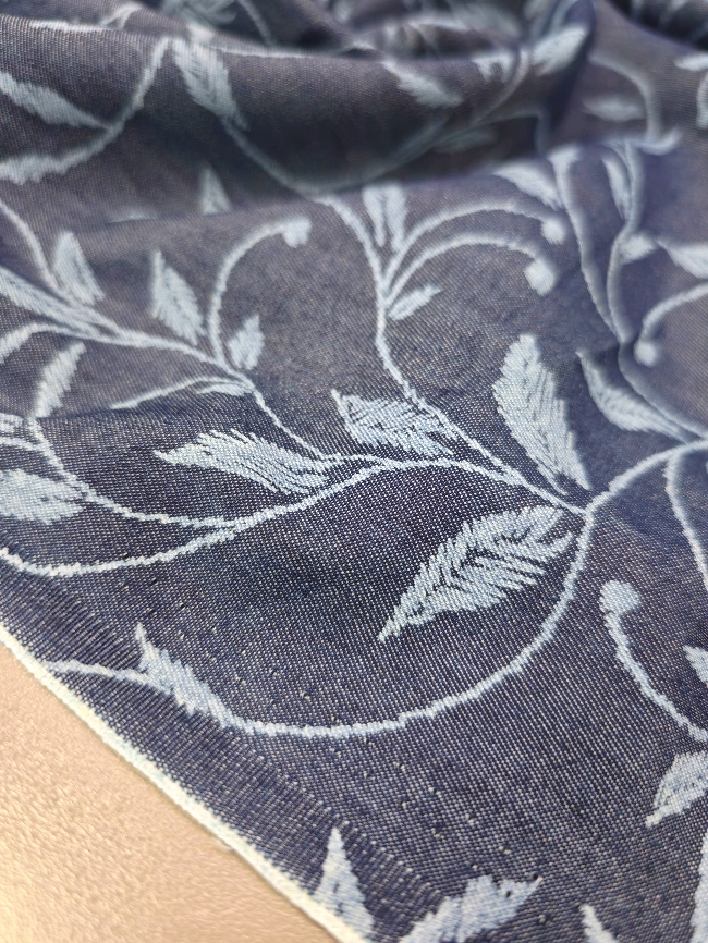 Lahek bombažni jeans v temno modri barvi z nežnim listnim vzorcem. Mehko, zračno in prijetno blago, primerno za šivanje srajc, oblek, tunik, kril, lahkih hlač in otroških oblačil. Tanek jeans, ki je udoben za nošenje in primeren za pomlad, poletje ter prehodna obdobja.