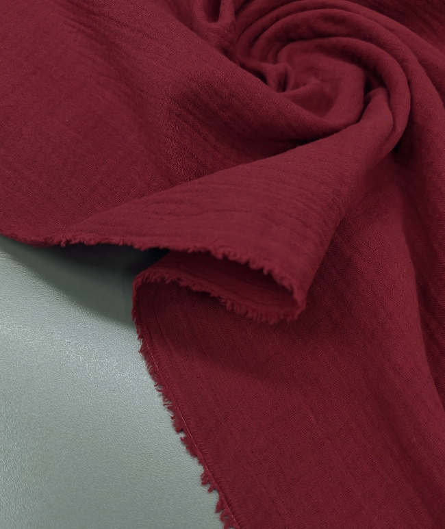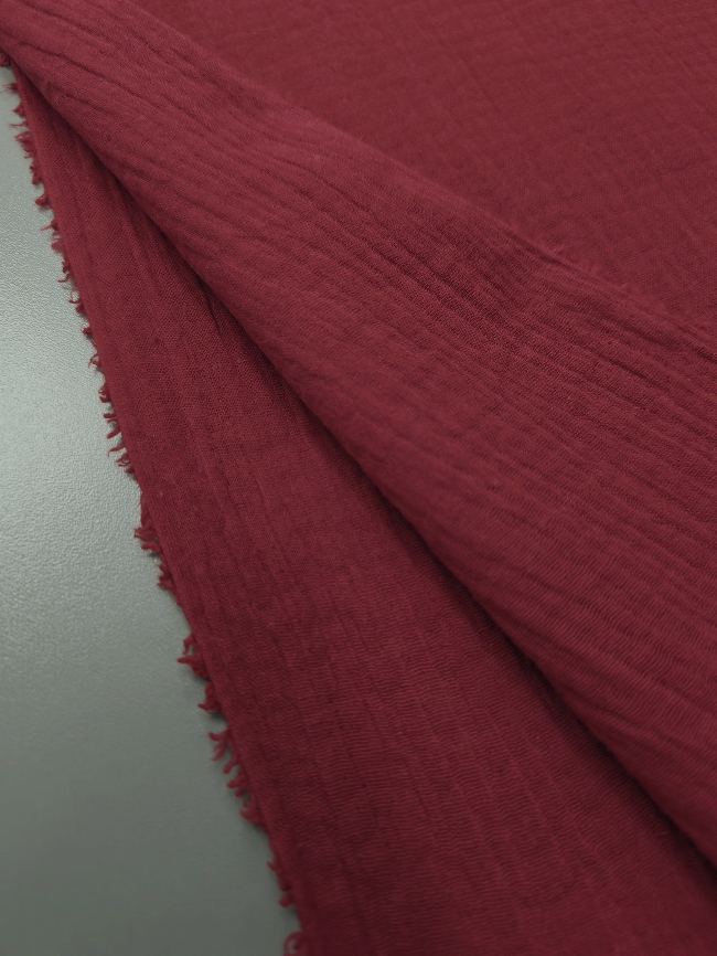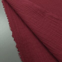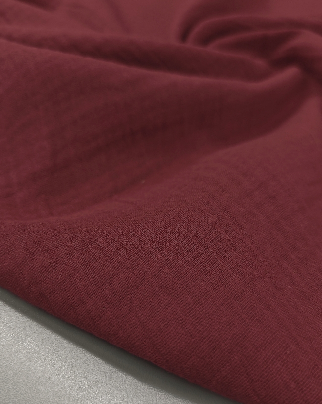 Mehka dvoslojna tetra tkanina z rahlo naborano strukturo in zračnim, prijetnim občutkom na koži. Vinsko rdeča barva daje materialu topel in izrazit videz.