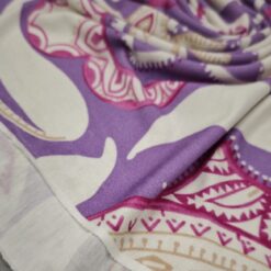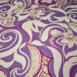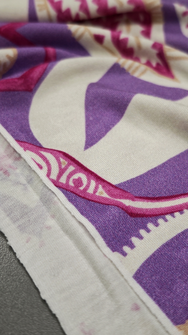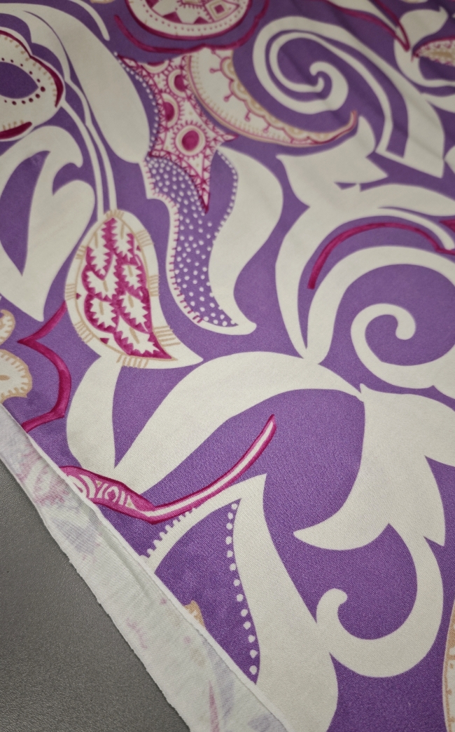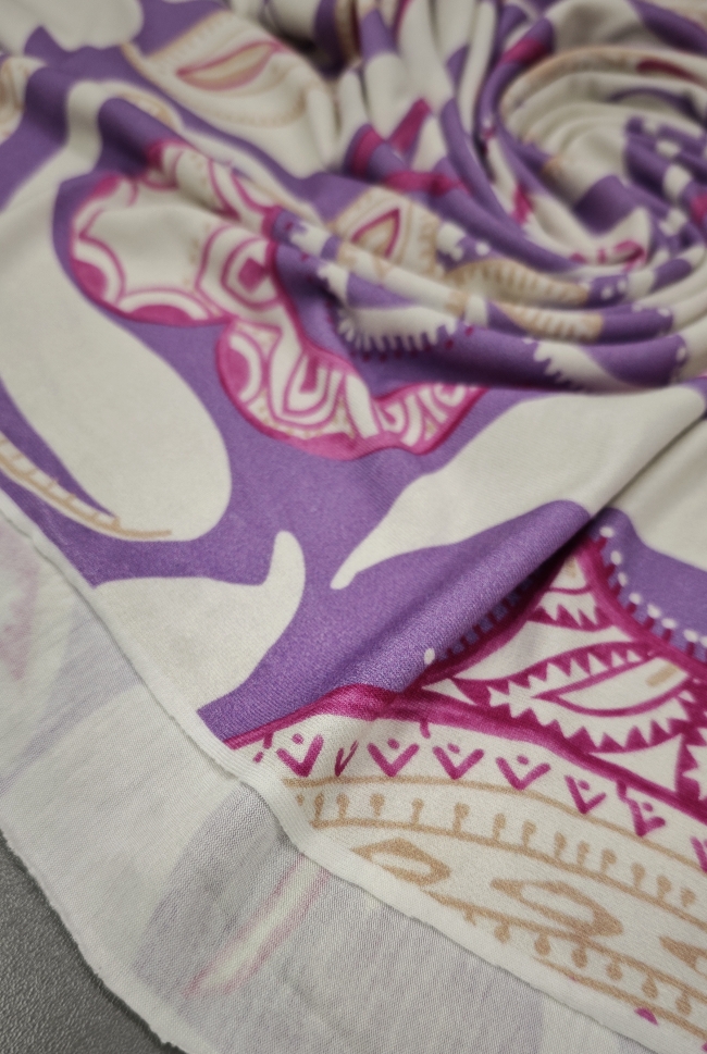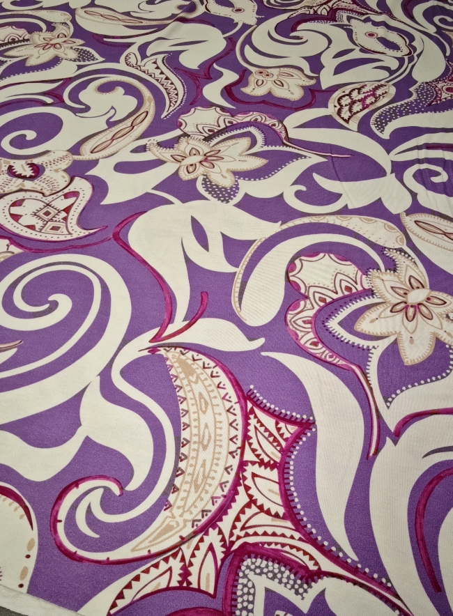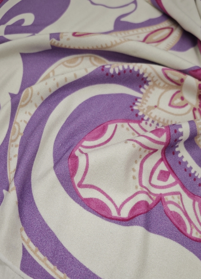 Mehak, raztegljiv jersey z izrazitim ornamentnim potiskom v vijoličnih tonih. Material je prijeten na dotik, dobro pade in omogoča udobno nošenje skozi ves dan. Primeren za šivanje majic, oblek, tunik, pajkic in drugih vsakdanjih ali modno poudarjenih oblačil. Vzorec doda prepoznaven videz, jersey pa zagotavlja udobje in praktičnost pri nošenju.
