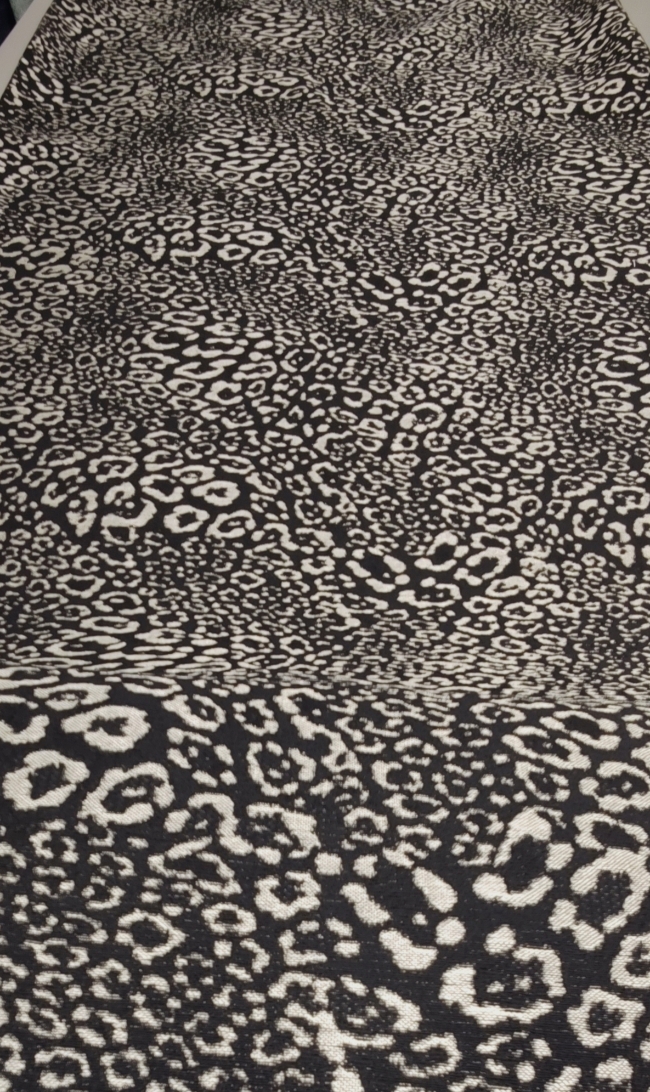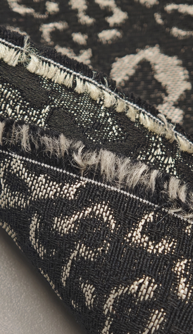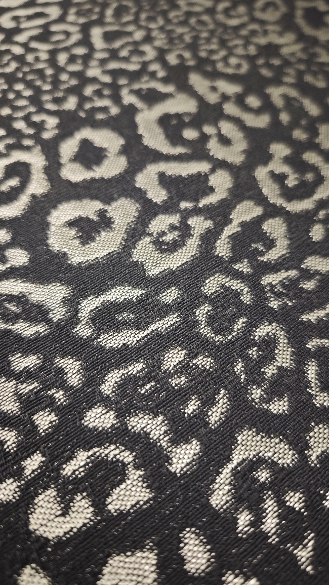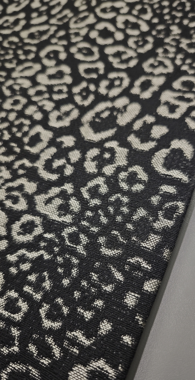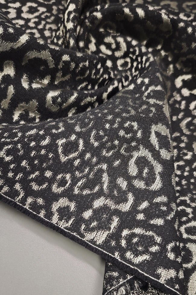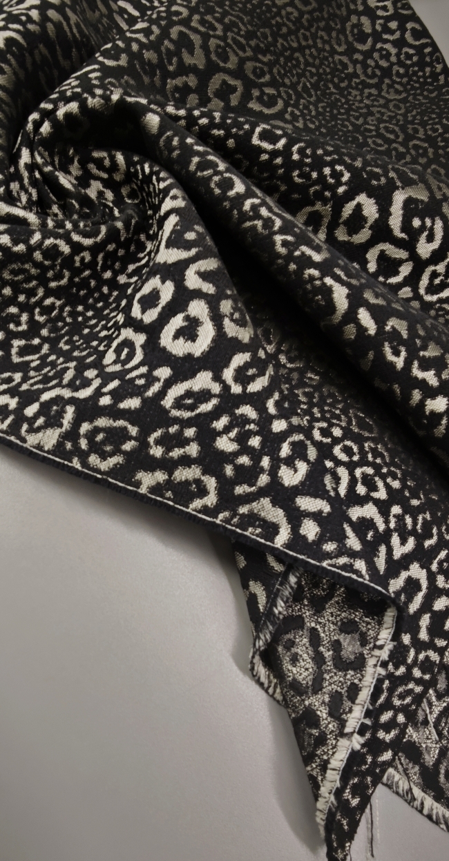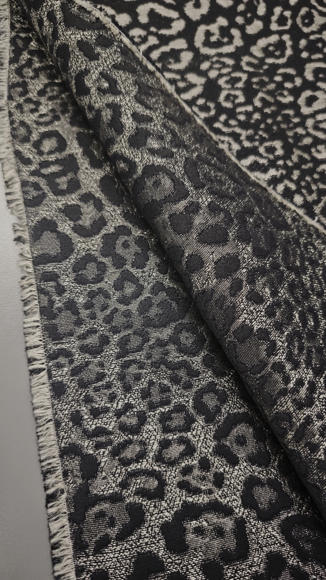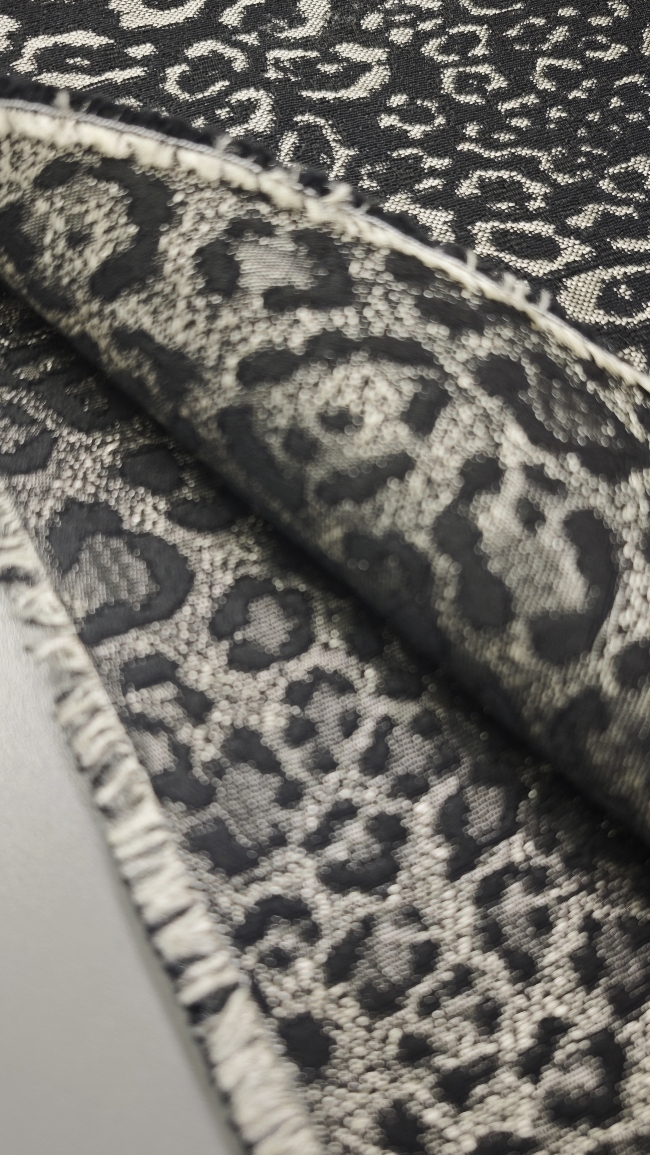 Ta prestižna žakard tkanina združuje prefinjen leopardji vzorec v kontrastni srebrno-črni barvni kombinaciji in subtilen bleščeč sijaj, ki doda pridih glamurja. Gost, a hkrati prijetno mehak material se lepo poda tako za šivanje modnih kosov (obleke, suknjiči, krila, hlače, telovniki) kot tudi za dekorativne projekte (blazine, prevleke, modne dodatke).