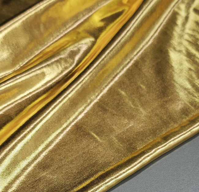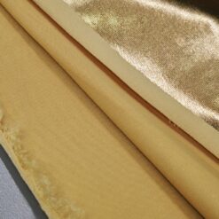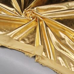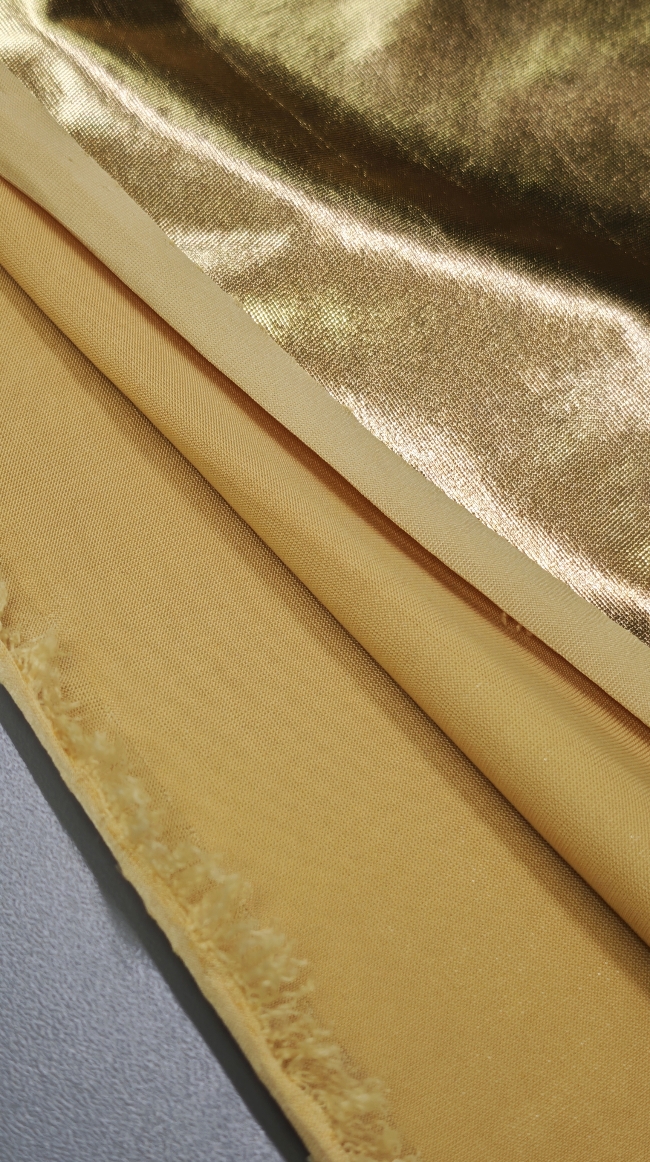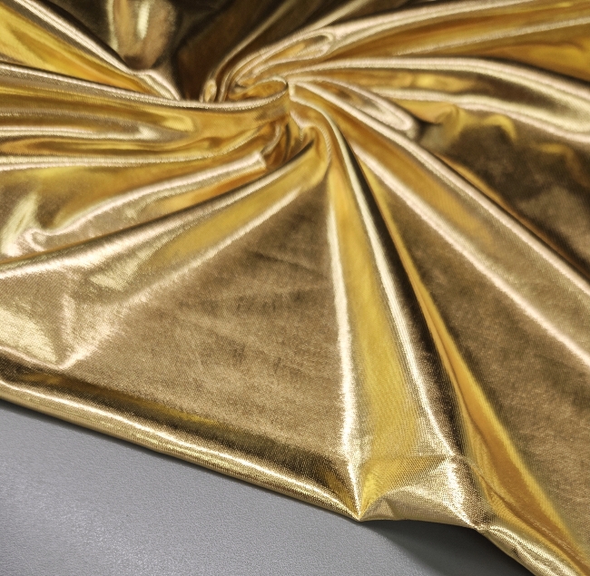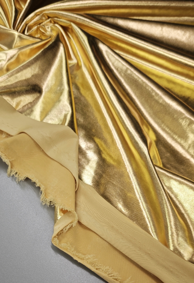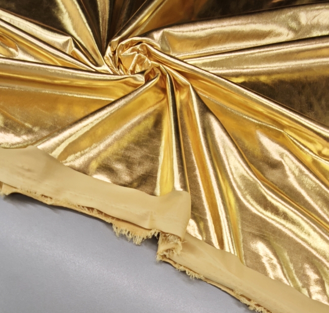 Ta ekskluzivna zlata tkanina z elastičnostjo in bleščečim metaliziranim videzom je popolna izbira za modne kreacije, ki zahtevajo pravo dozo glamurja. Gladka površina in sijaj ustvarjata luksuzen videz, ki spominja na jersey, hkrati pa zaradi metaliziranih vlaken prinaša izjemen vizualni učinek.